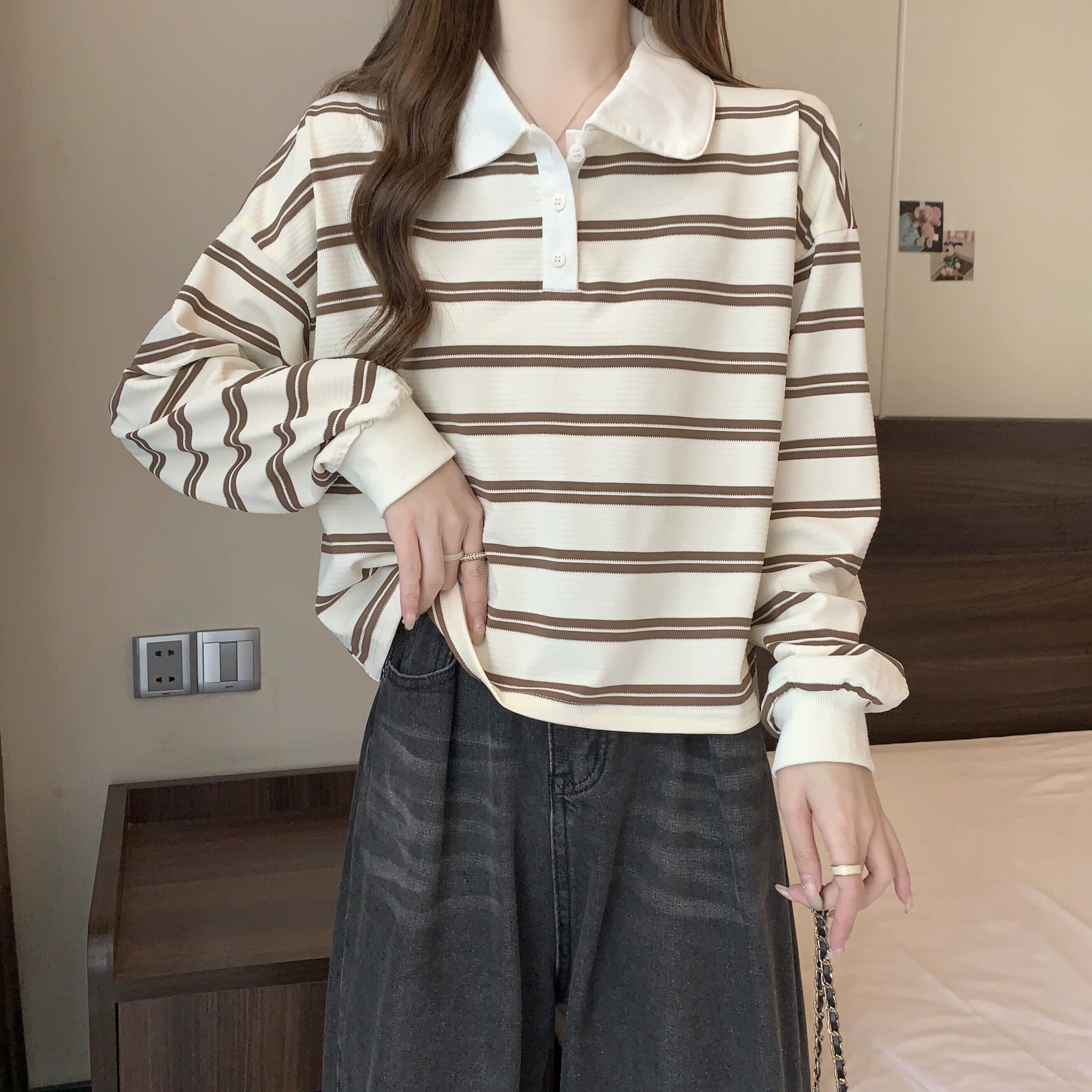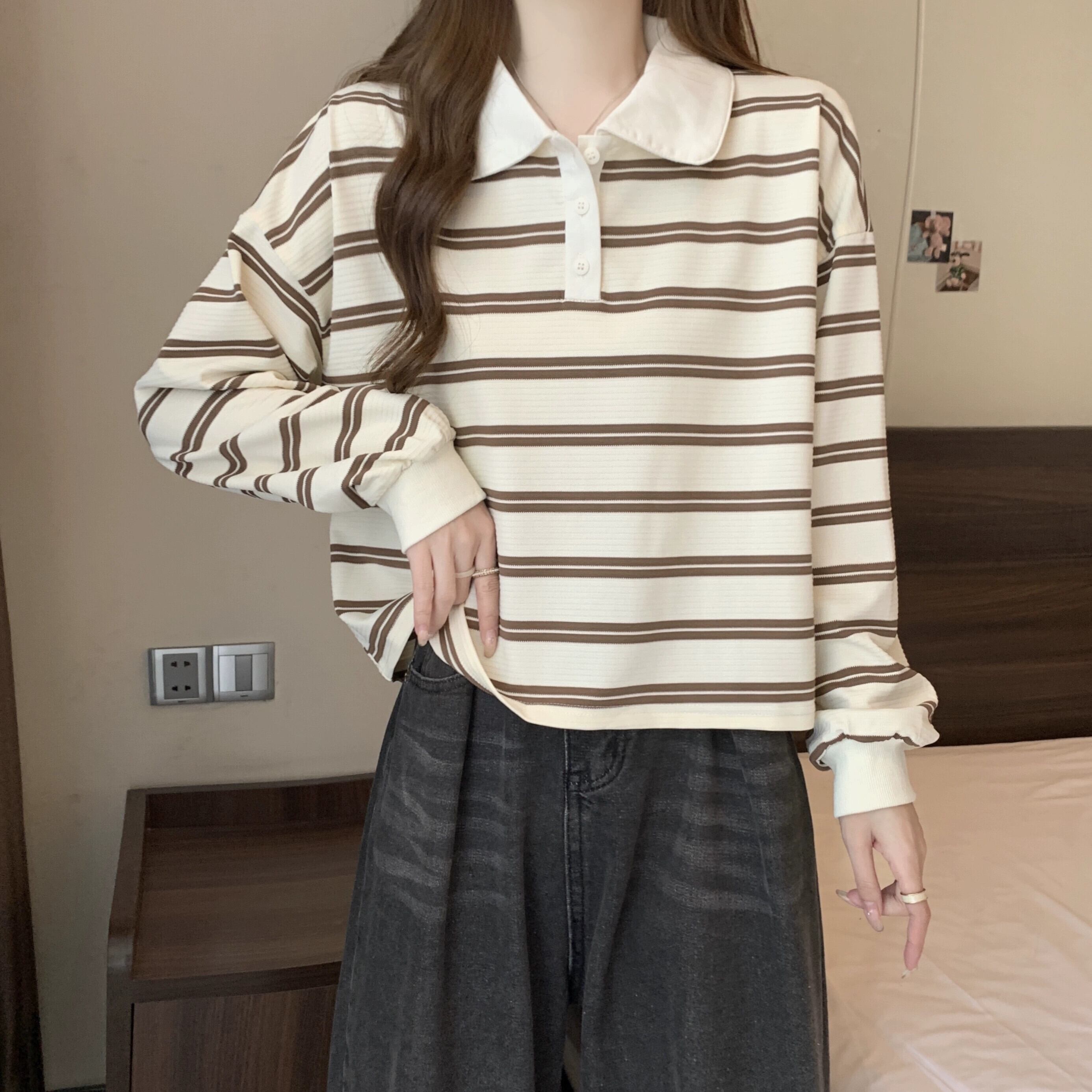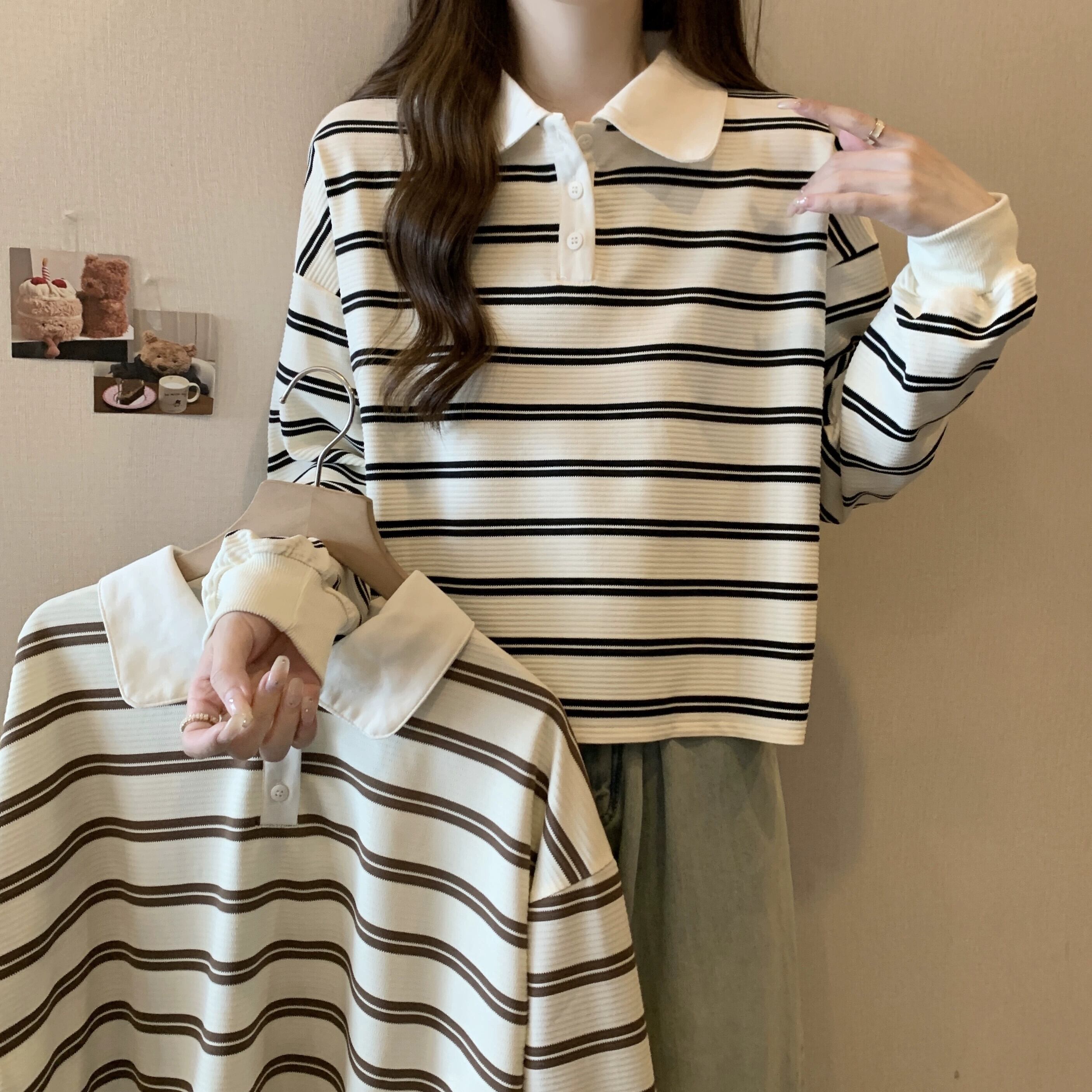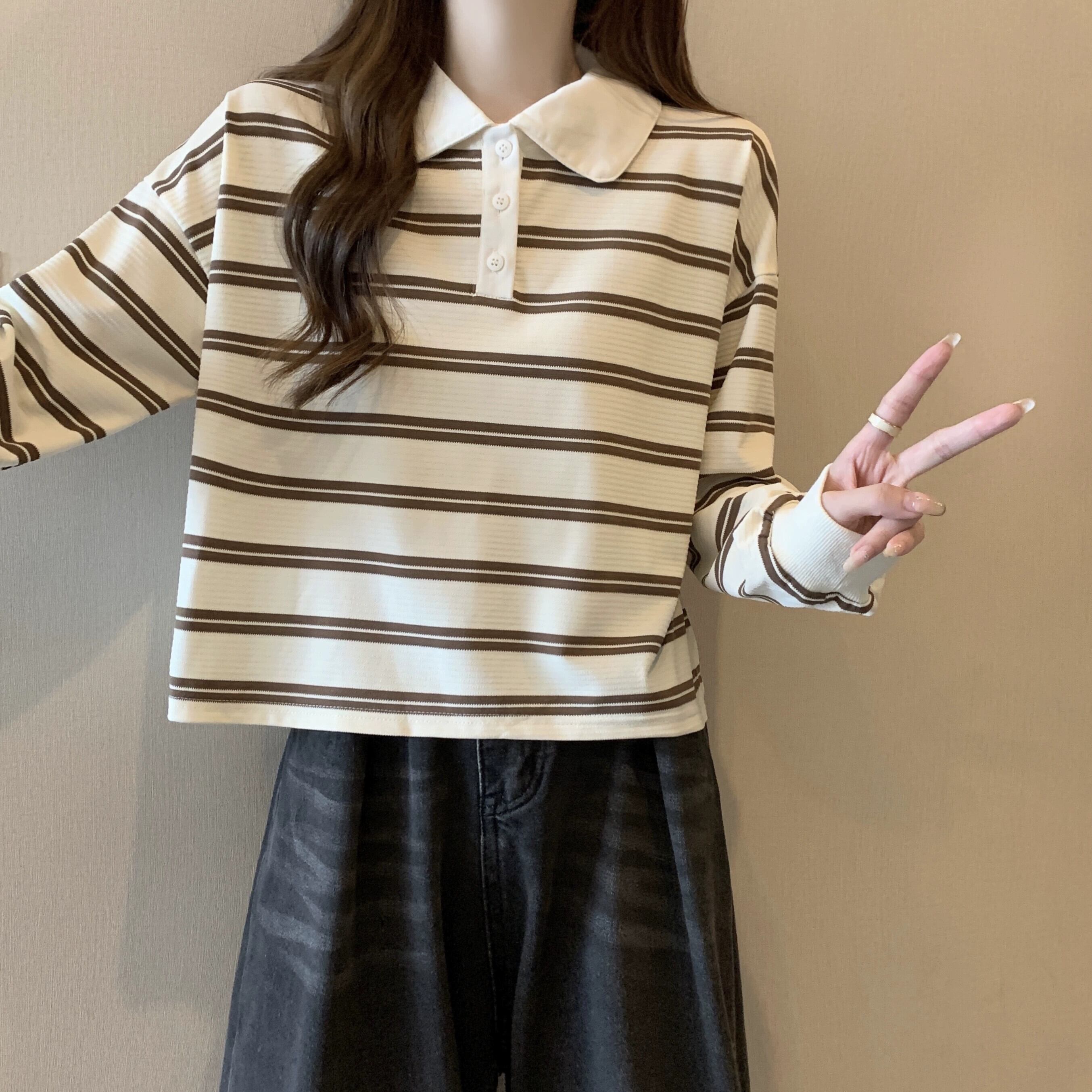 ポロカラーストライプショートスウェットシャツ女性 2023 新しい人気の春と秋のデザインルーズカジュアルプルオーバートップ スプリング 春物 オータム 秋物 7460096427266632 | framboise21