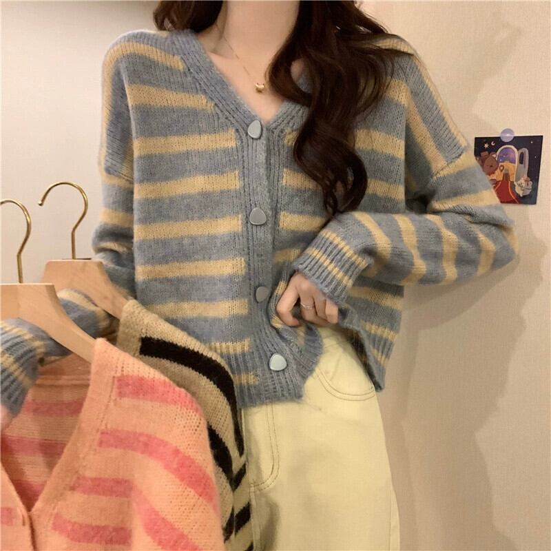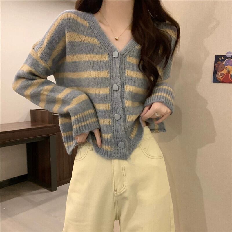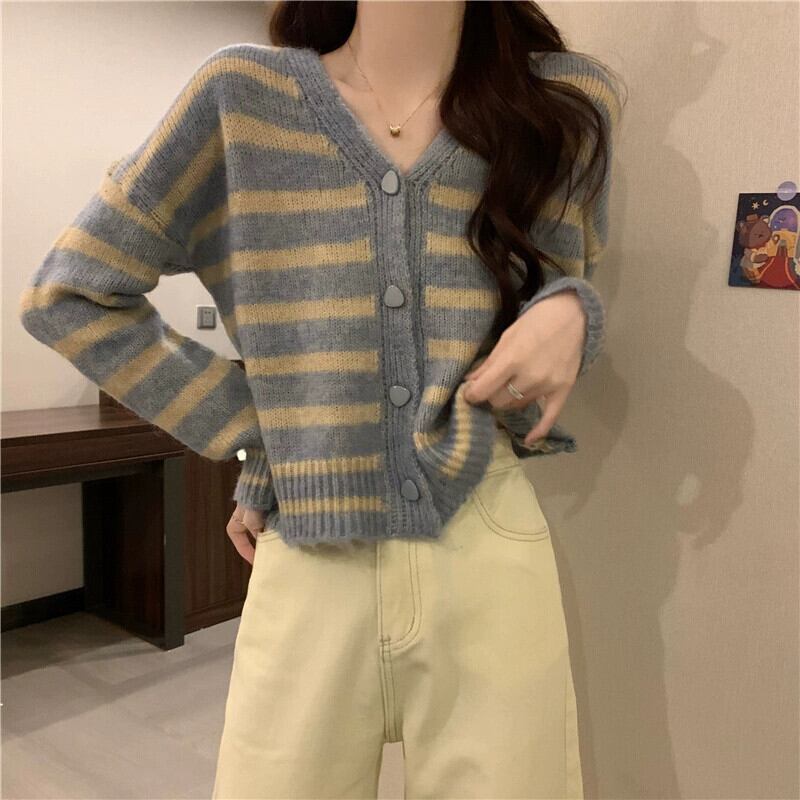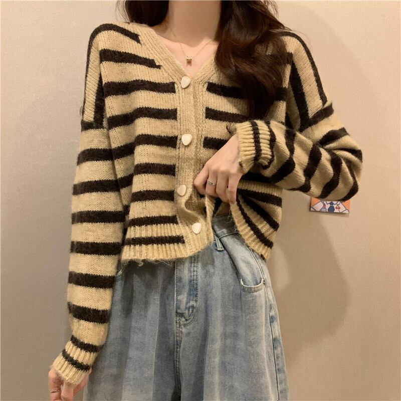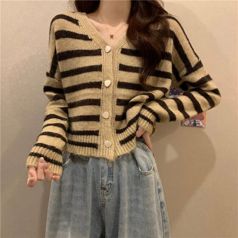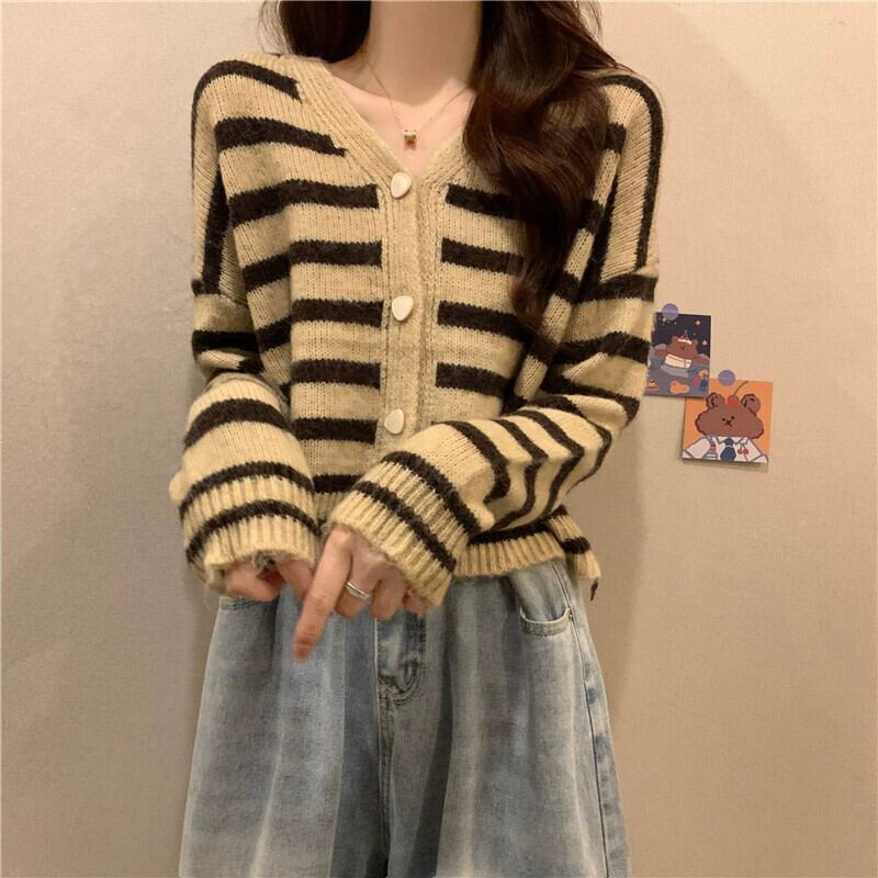ソフトワックスストライプ V ネックセータージャケット女性、秋と冬のレトロなルーズアウターウェア、怠惰なスタイル、多用途のショートニットカーディガン オータム 秋物 ウィンター 冬物 Vネック 7460059406338387 | framboise21