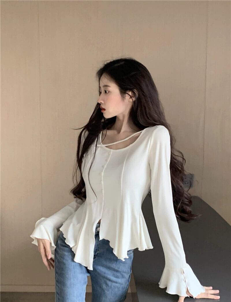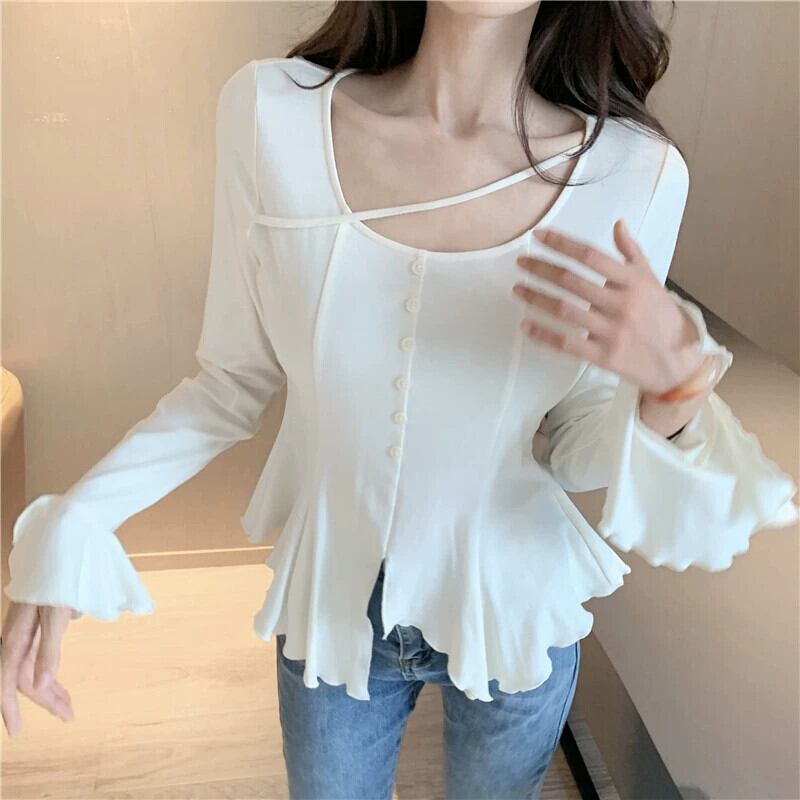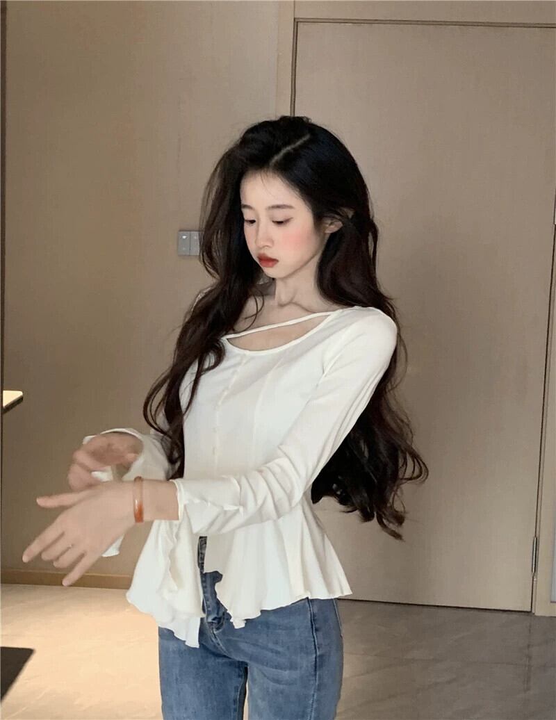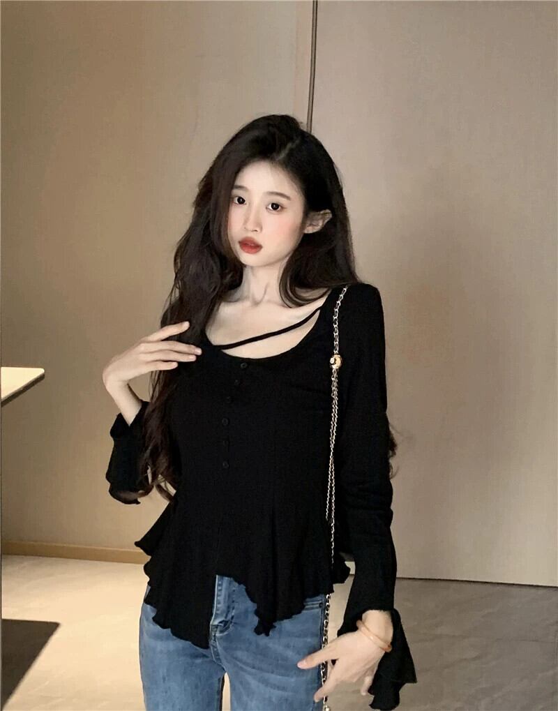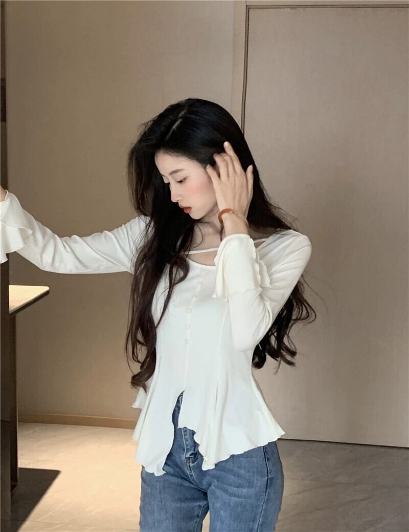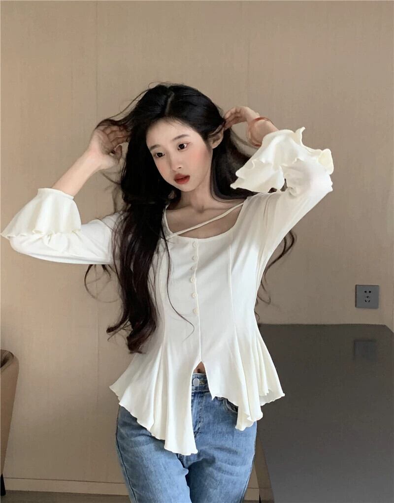 不規則なキノコエッジのトランペット長袖トップ女性 2023 春と秋の新しいデザイン、ウエスタンスタイルとシックなインナー T シャツ ロング スプリング 春物 オータム 秋物 Tシャツ 7460042036834120 | framboise21