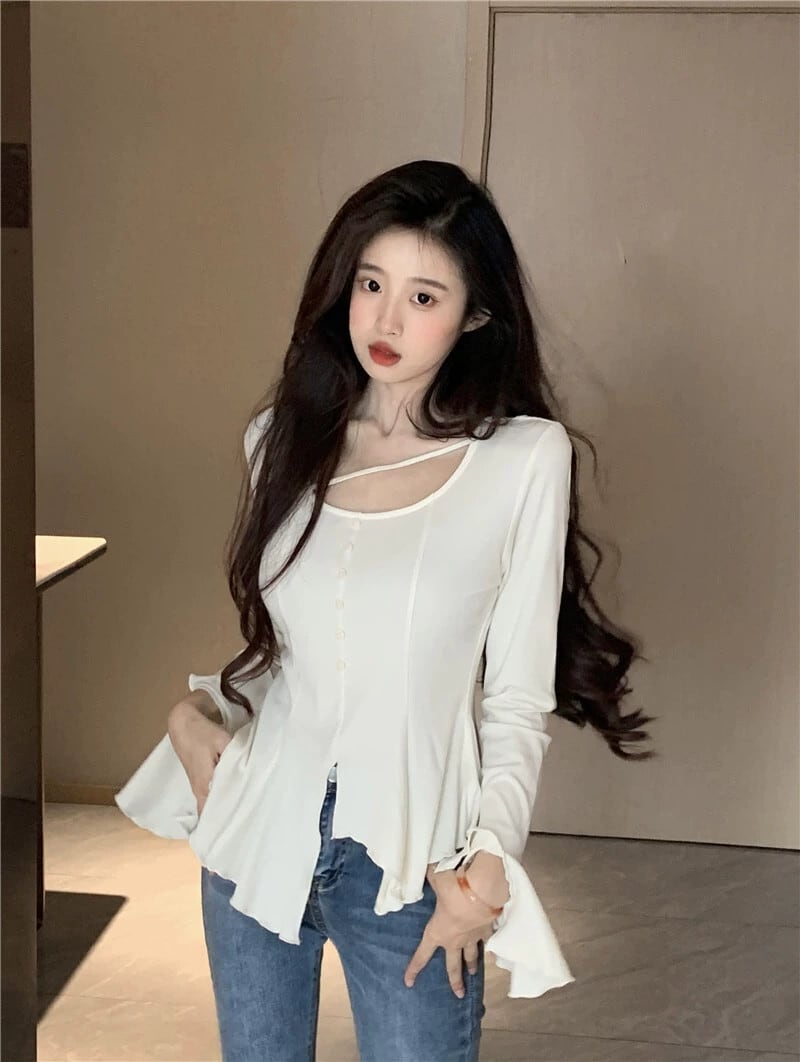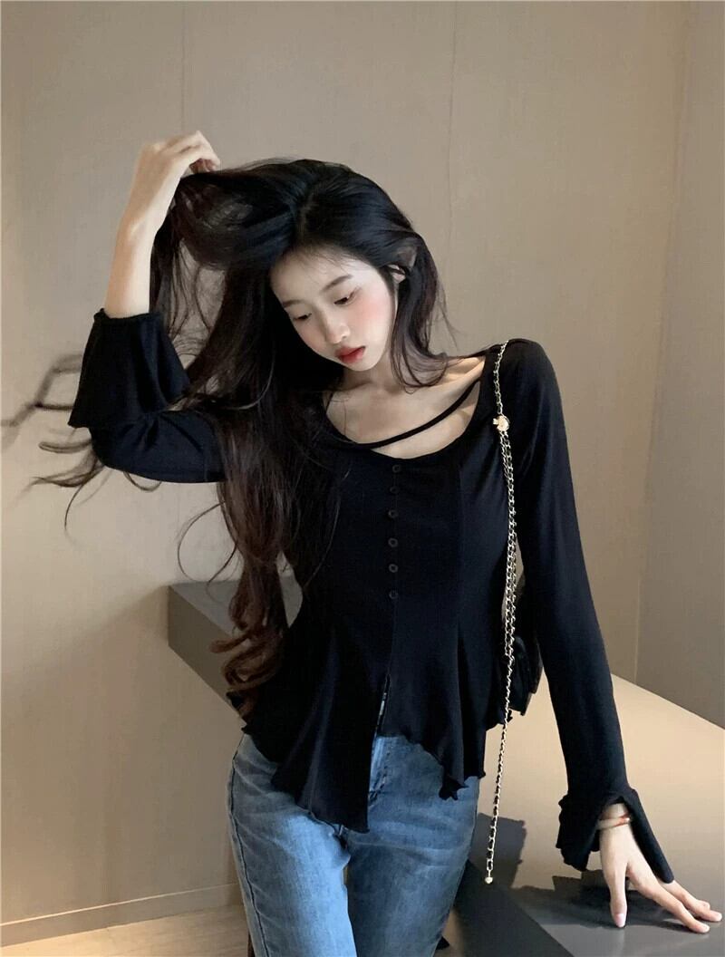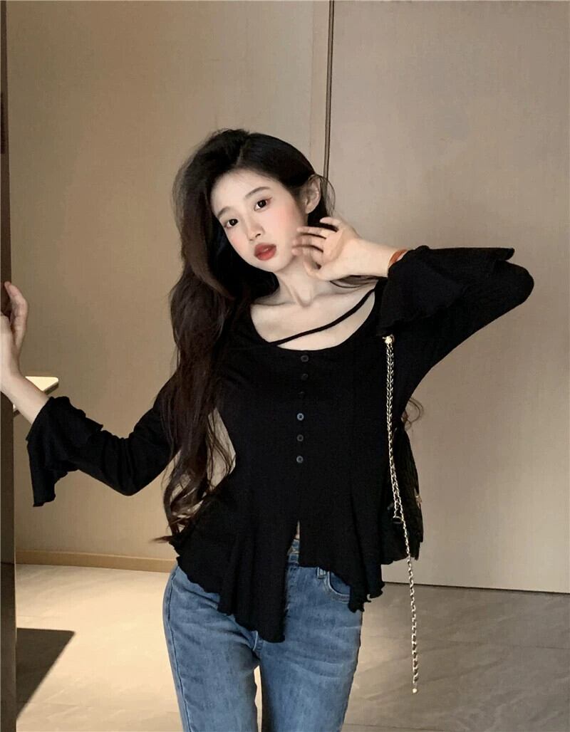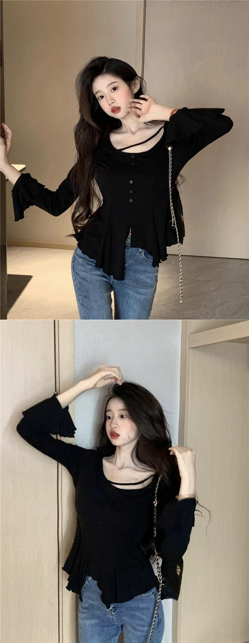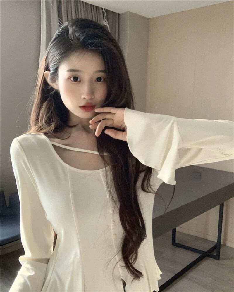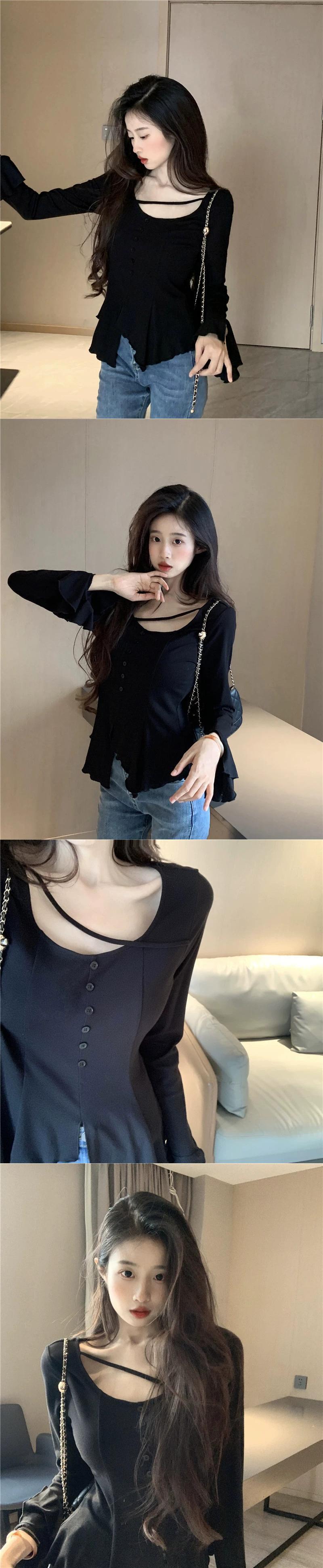 不規則なキノコエッジのトランペット長袖トップ女性 2023 春と秋の新しいデザイン、ウエスタンスタイルとシックなインナー T シャツ ロング スプリング 春物 オータム 秋物 Tシャツ 7460042036834120 | framboise21