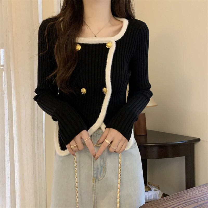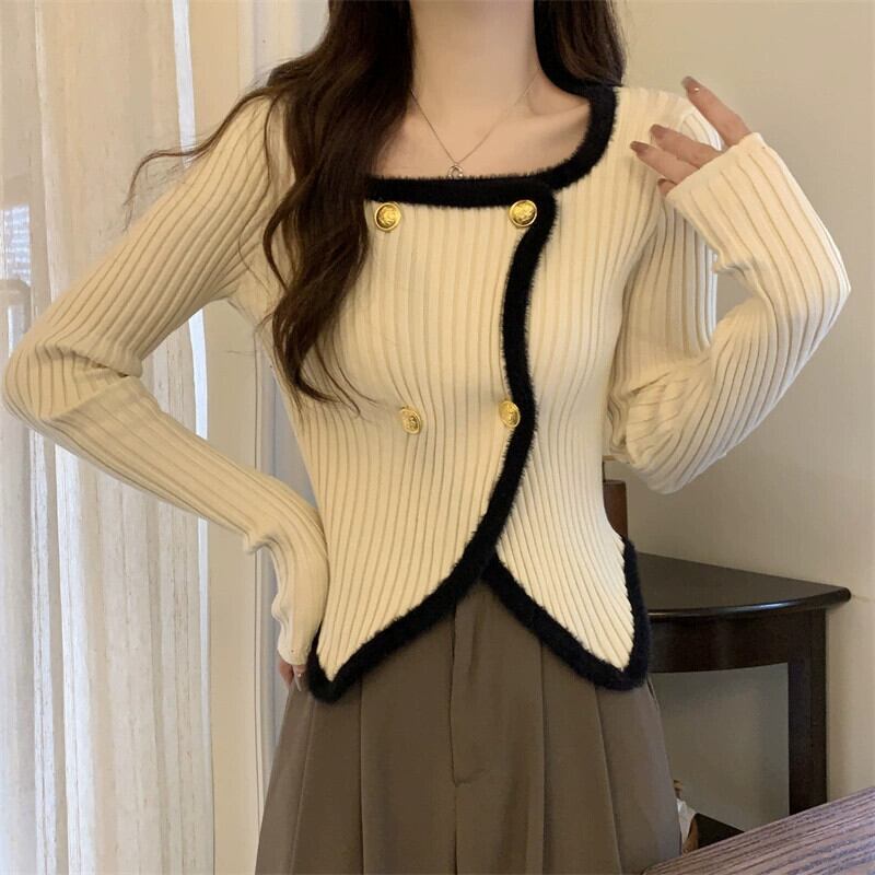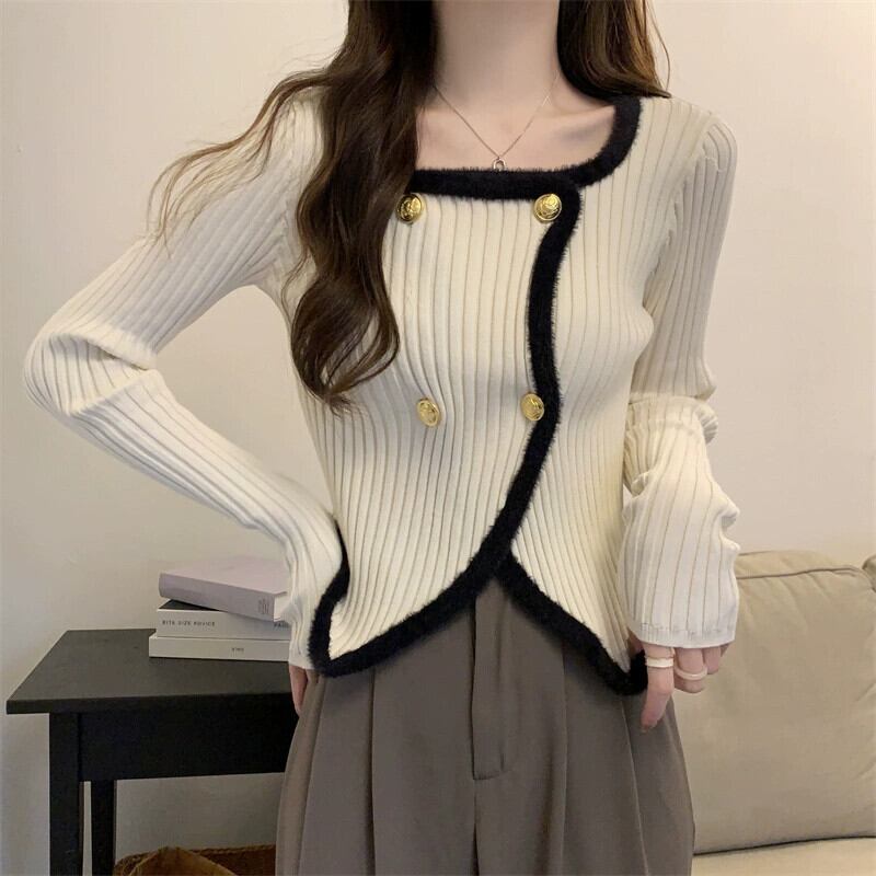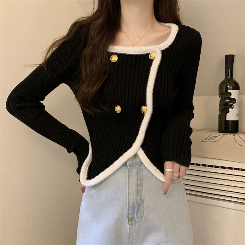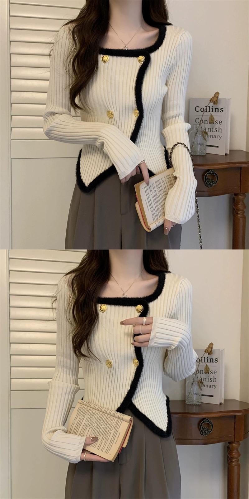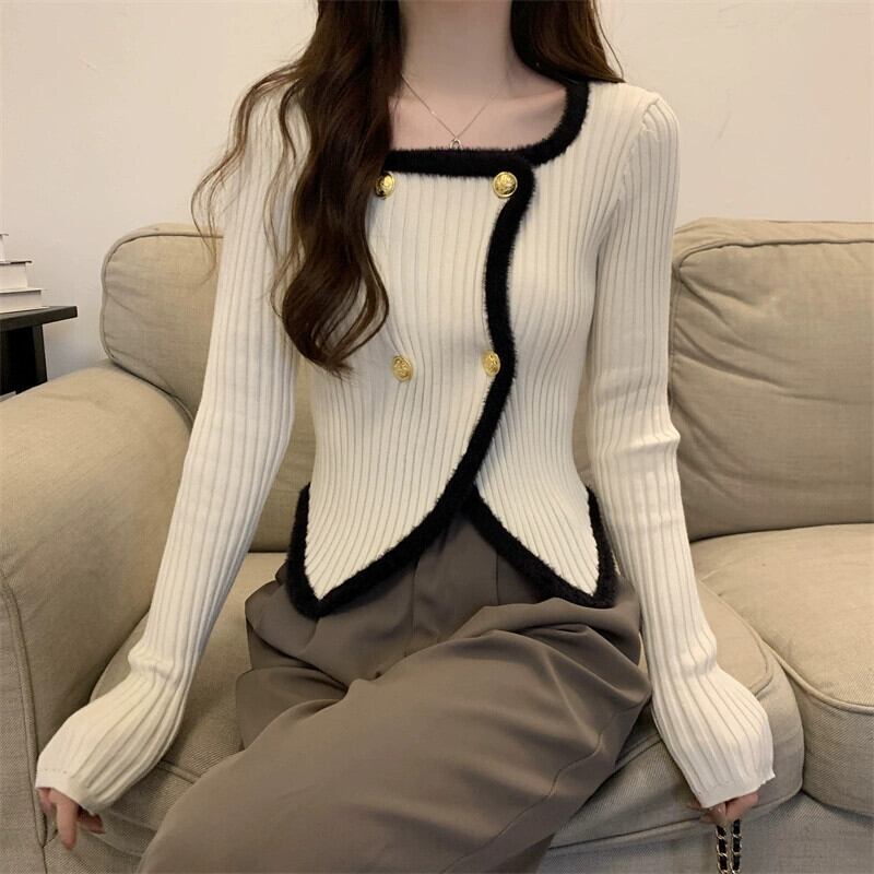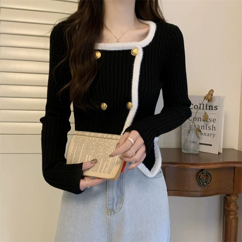 秋と冬の不規則なショートボトムシャツの女性、西洋スタイルのインナースタイル、小さな香りのスタイルのセーター、スリムフィットの豪華なベルベットのスクエアネックセーター オータム 秋物 ウィンター 冬物 スクウェア 7460054852331514 | framboise21