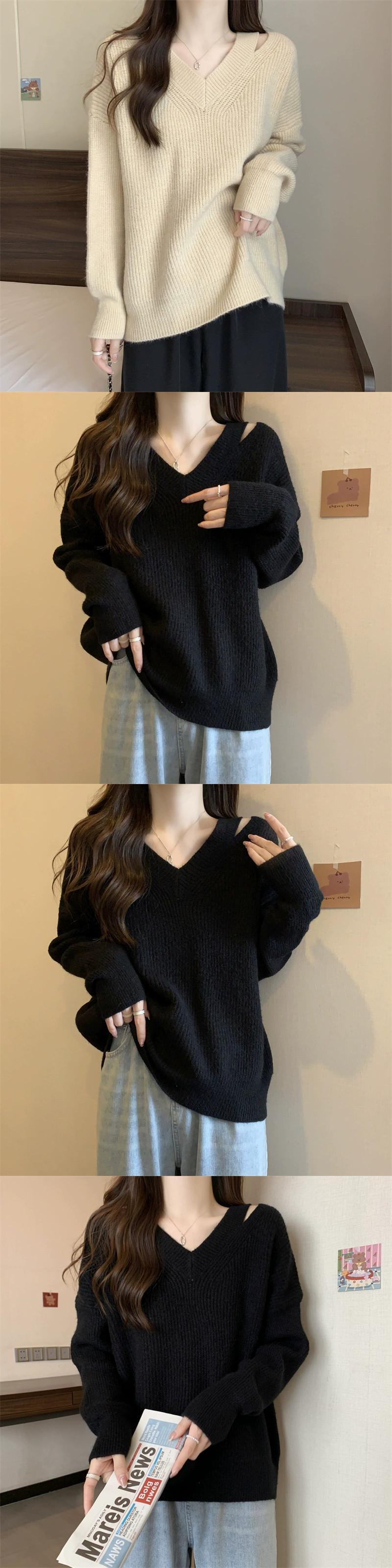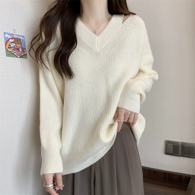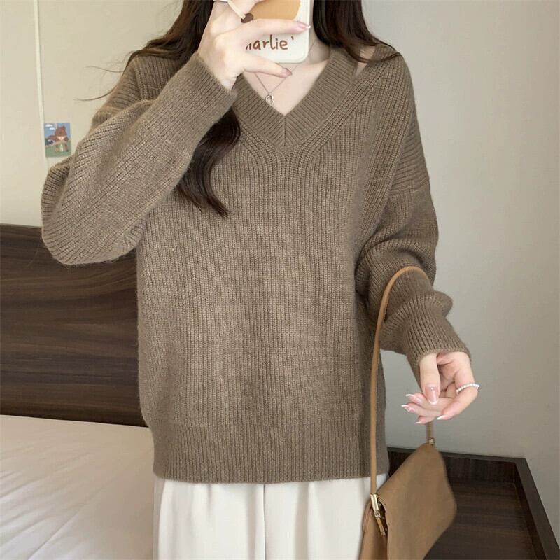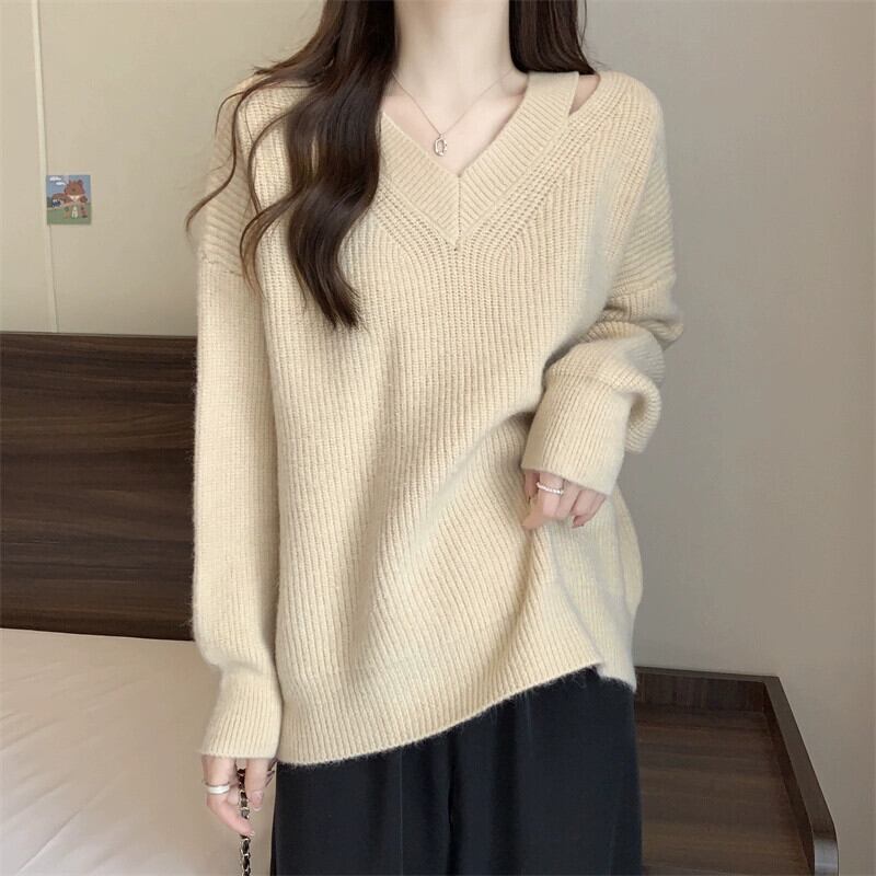 秋冬のミッドレングスVネックセーターレディース、怠惰なアウターウェア、ルーズカジュアルなお尻を覆うプルオーバー長袖セーター ロング オータム 秋物 ウィンター 冬物 7460098014271870 | framboise21