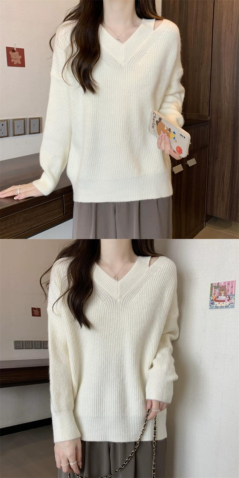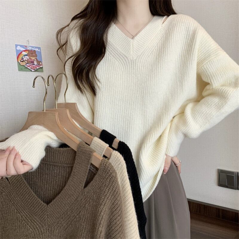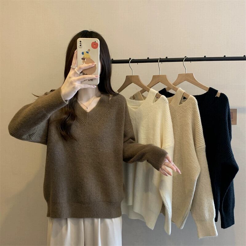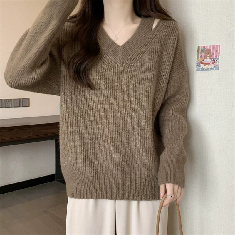 秋冬のミッドレングスVネックセーターレディース、怠惰なアウターウェア、ルーズカジュアルなお尻を覆うプルオーバー長袖セーター ロング オータム 秋物 ウィンター 冬物 7460098014271870 | framboise21