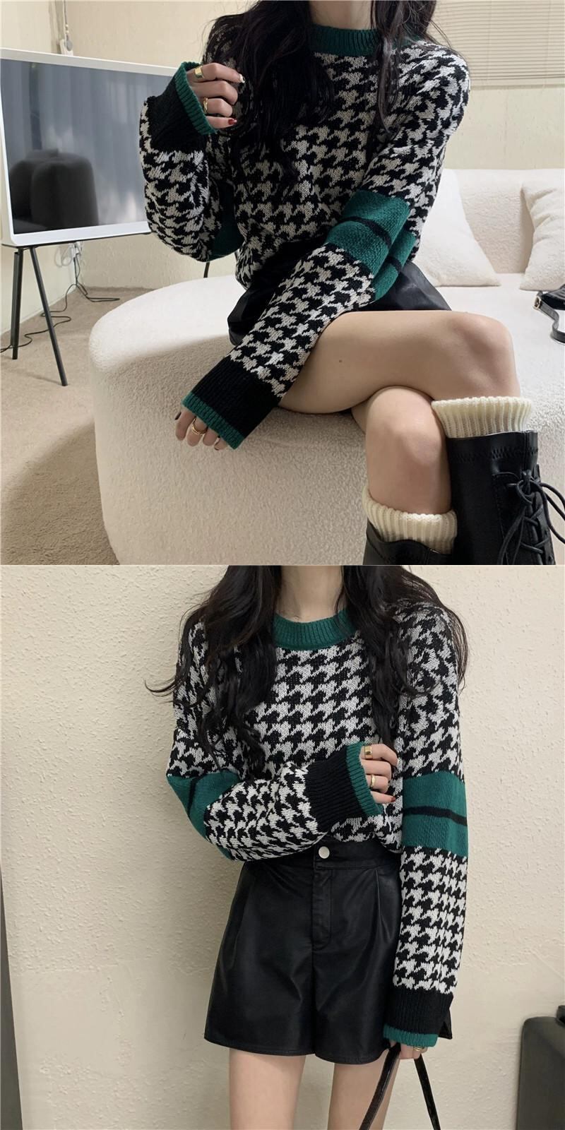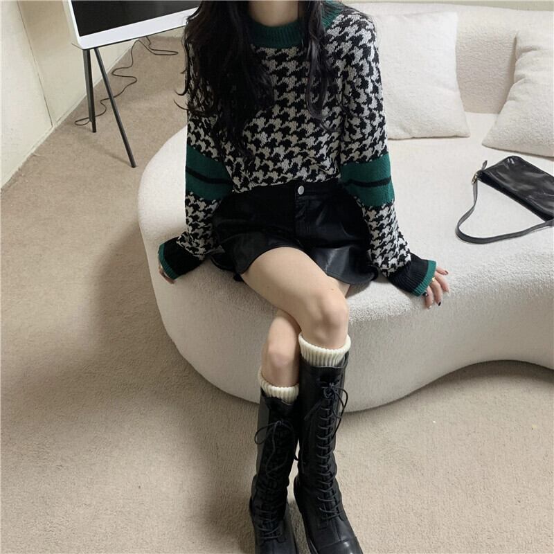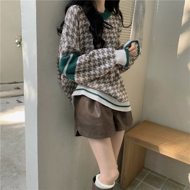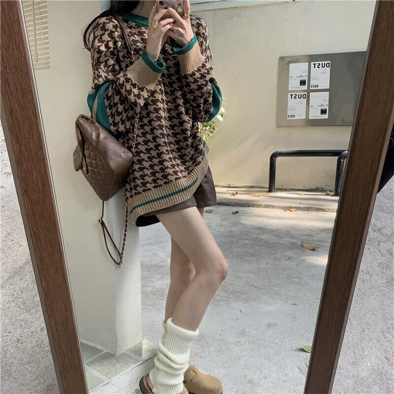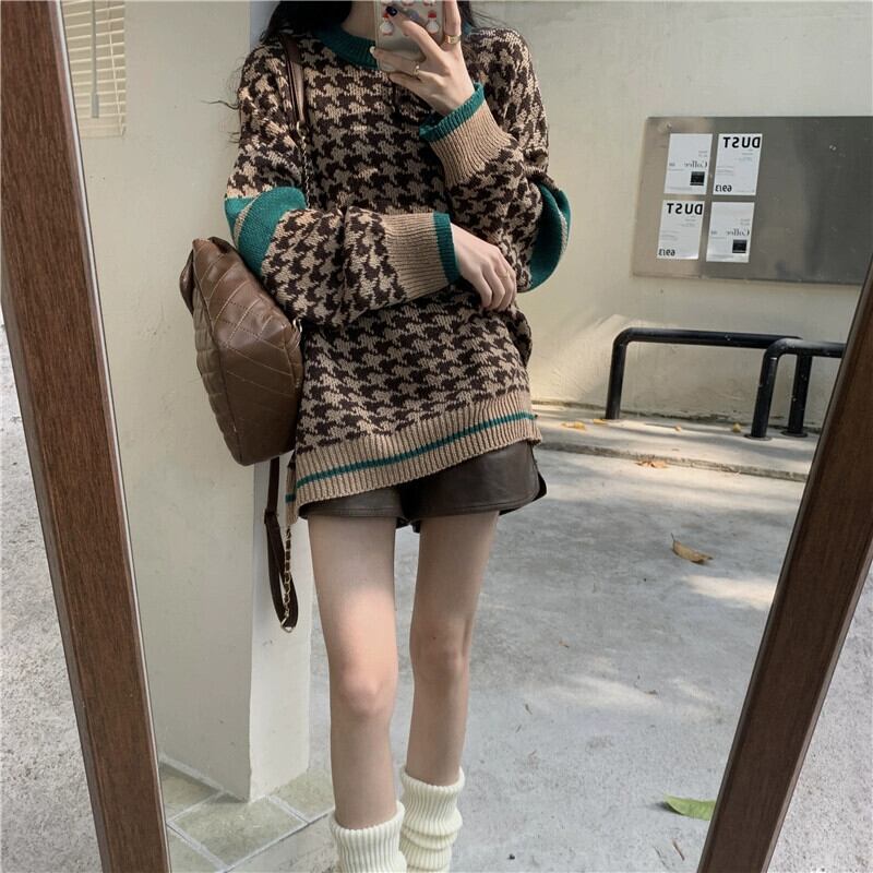 レトロソフトワックス状千鳥格子セーター女性秋と冬 2023 新しいルーズアウターウェア怠惰なスタイルプルオーバー長袖セーター ロング オータム 秋物 ウィンター 冬物 7460026134895309 | framboise21