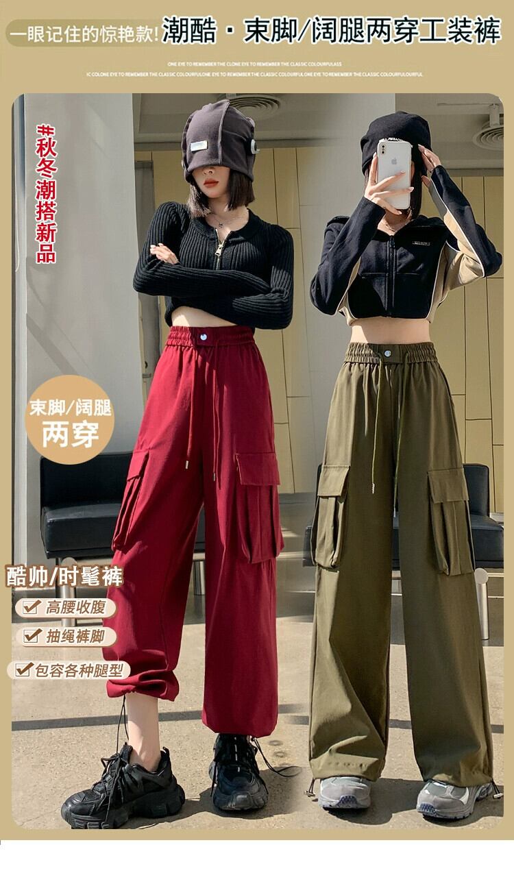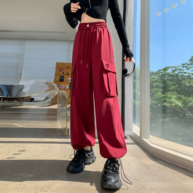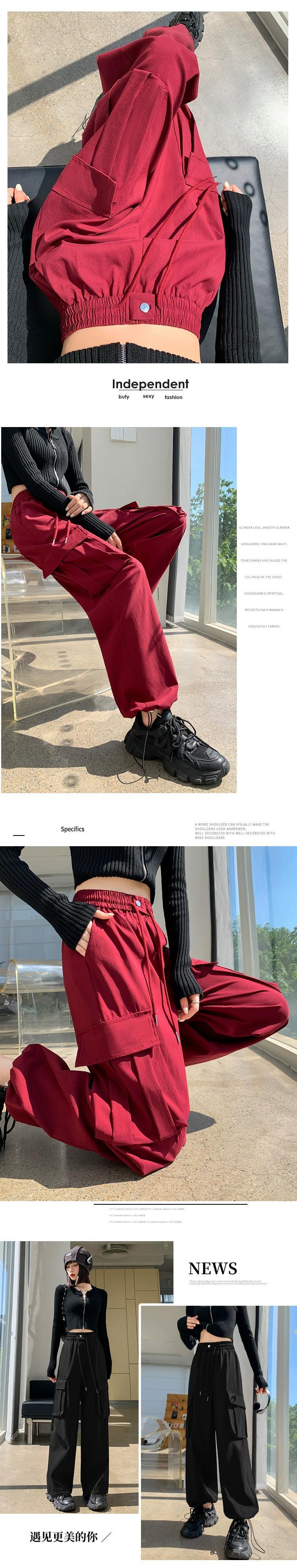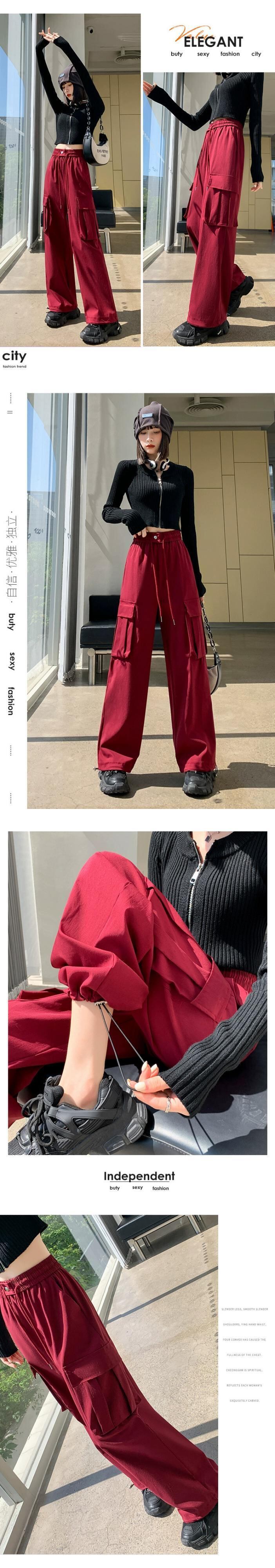 バーガンディのストレートオーバーオールレディース、春と秋のワイドレッグカジュアルパンツ、アメリカンハイストリートスリミングハイウエストレギンススウェットパンツ スプリング 春物 オータム 秋物 7460097441499760 | framboise21