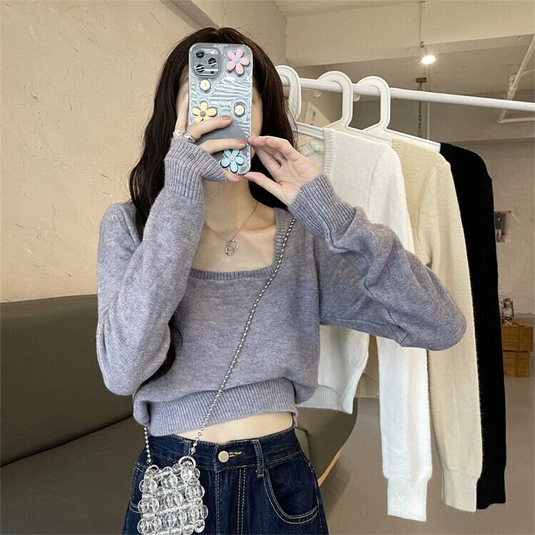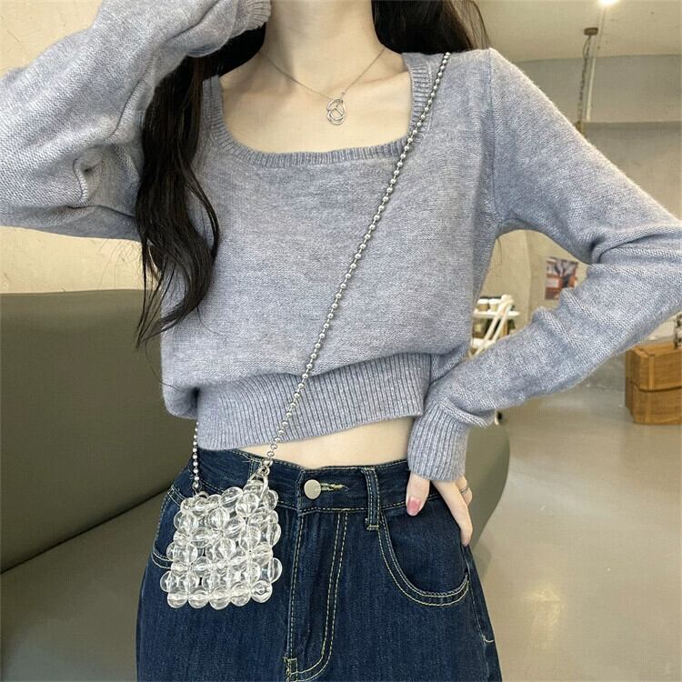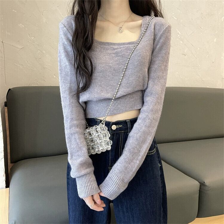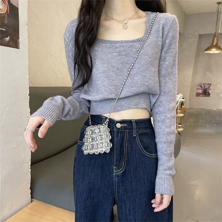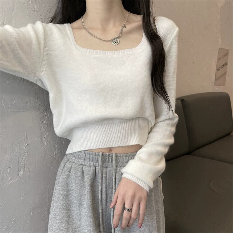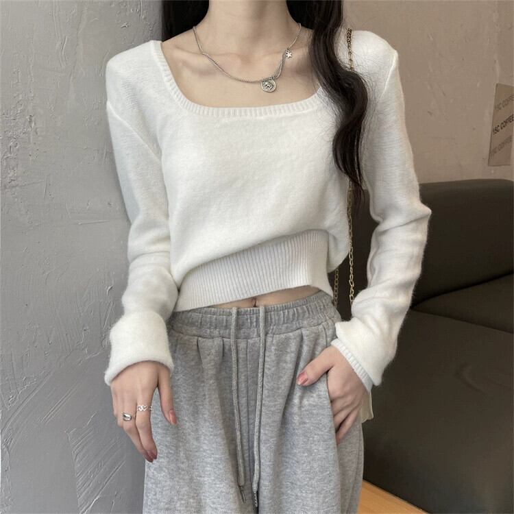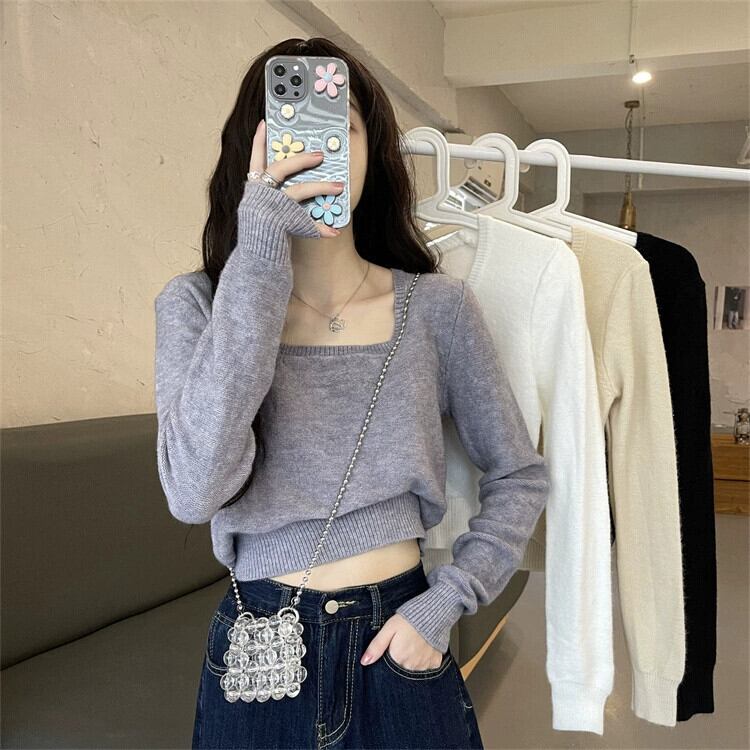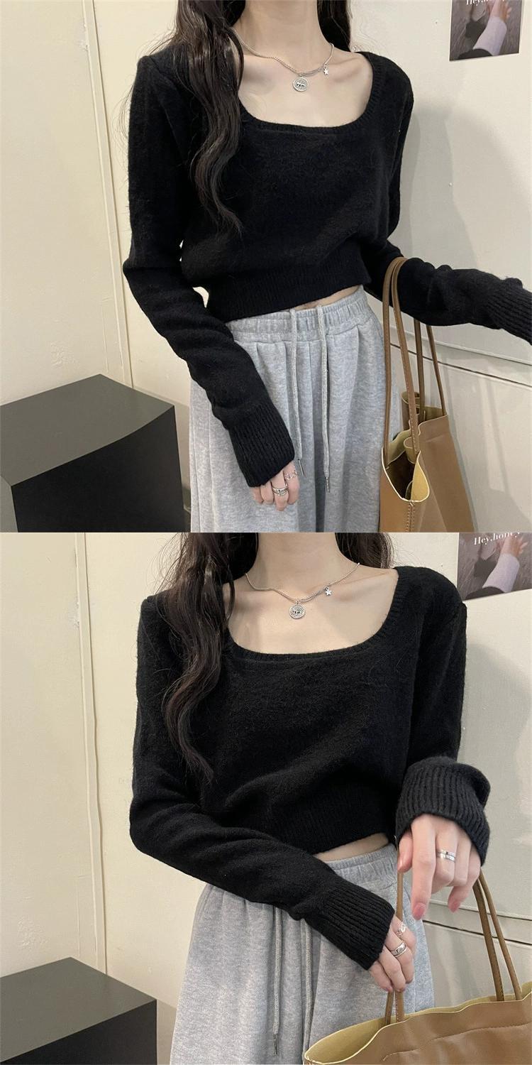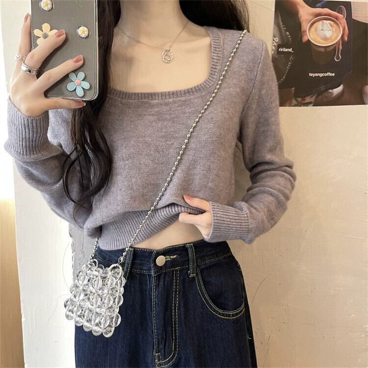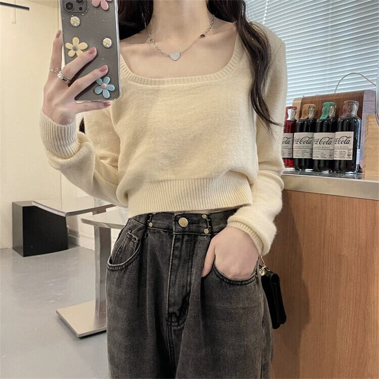 秋冬のスクエアカラーボトリングシャツ女性、ファッショナブル、ルーズでスリム、短い長袖ニットセーター、小柄な人 ショート ロング オータム 秋物 ウィンター 冬物 スクウェア 746008884713013 | framboise21