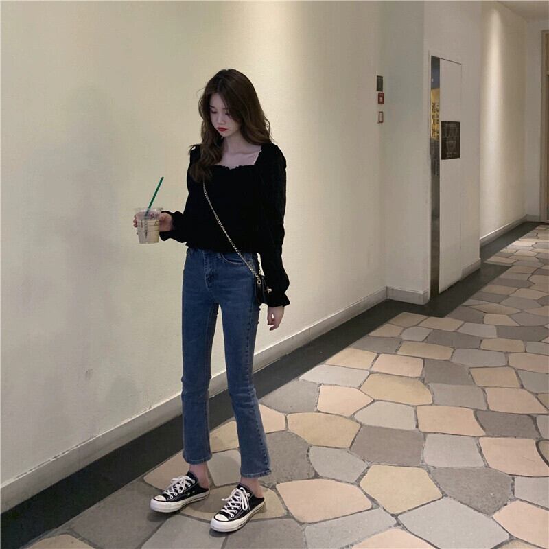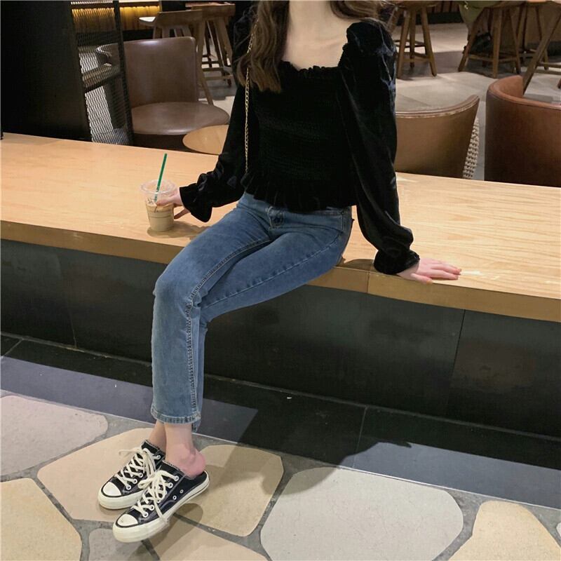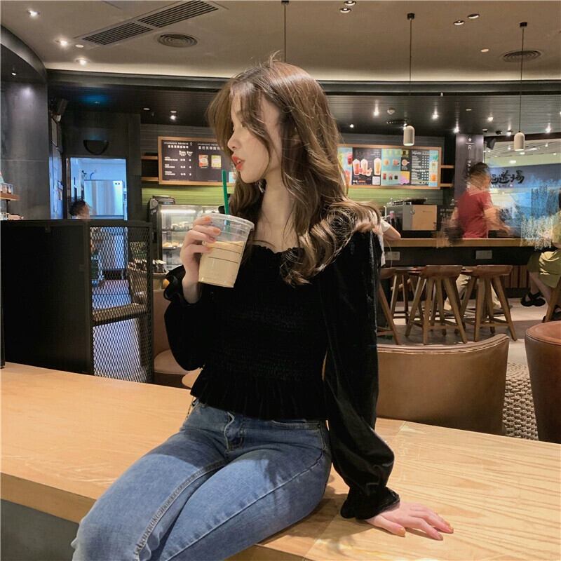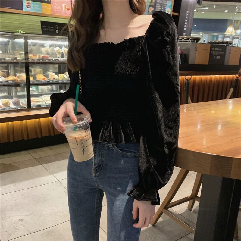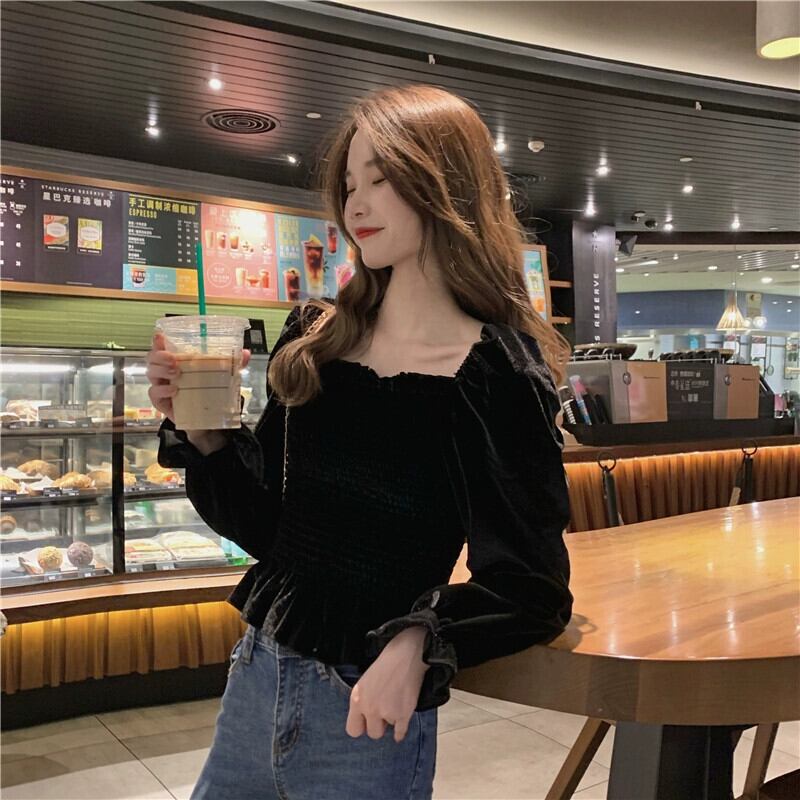 ベルベットスクエアカラー長袖シャツ女性秋フレンチハイエンドデザインスリムフィットショートパフスリーブトップブラック ロング オータム 秋物 スクウェア 7460013821240317 | framboise21
