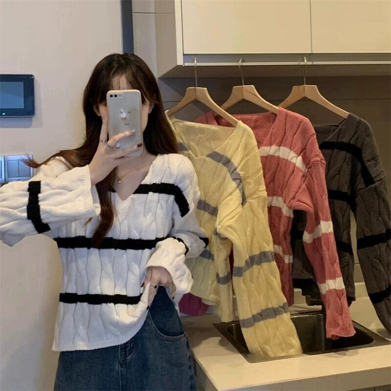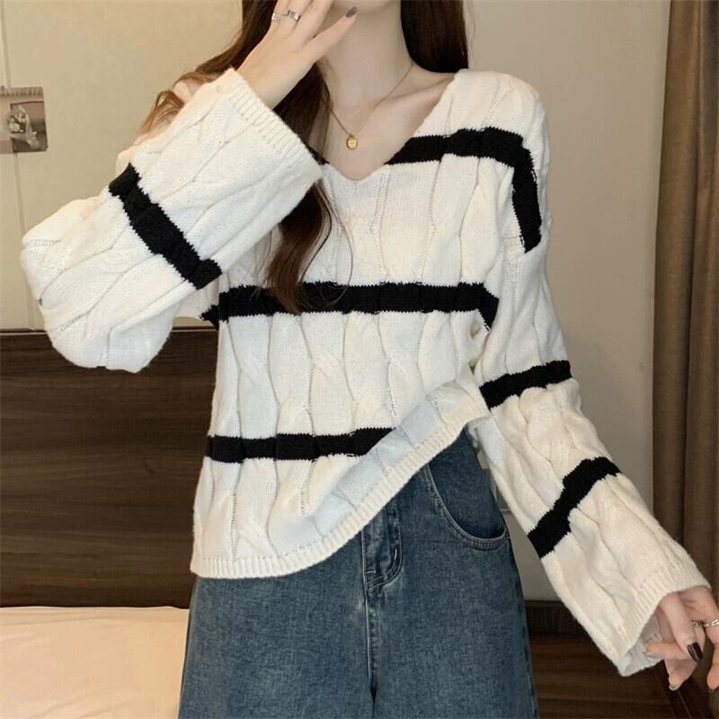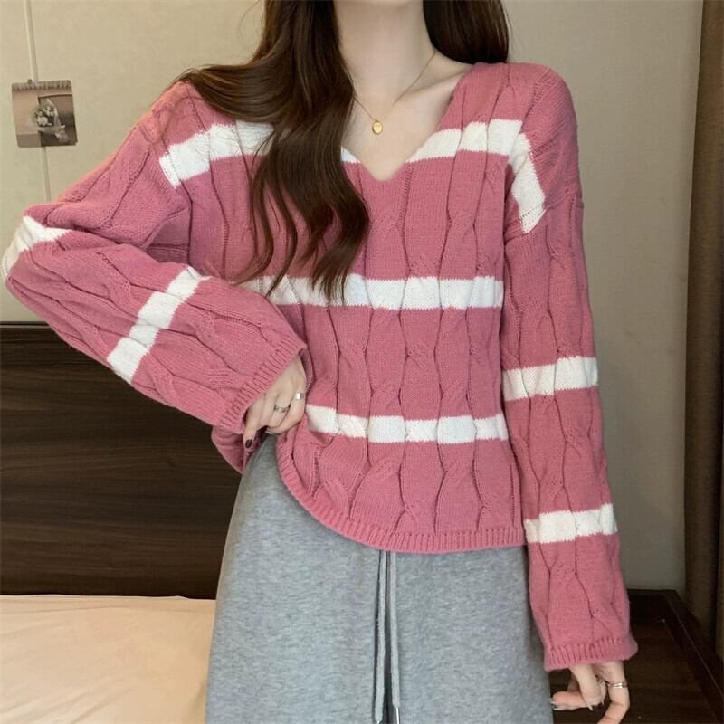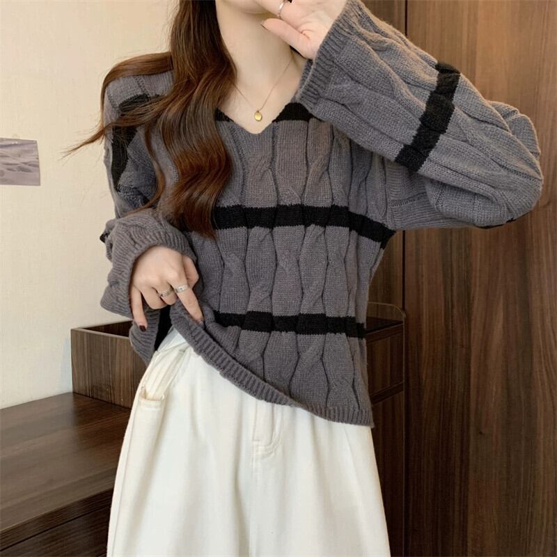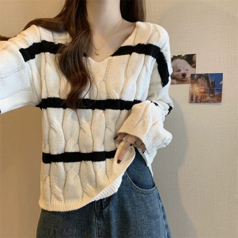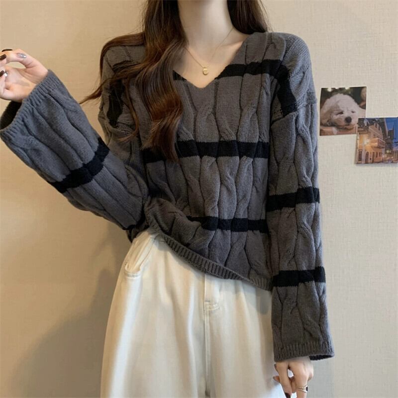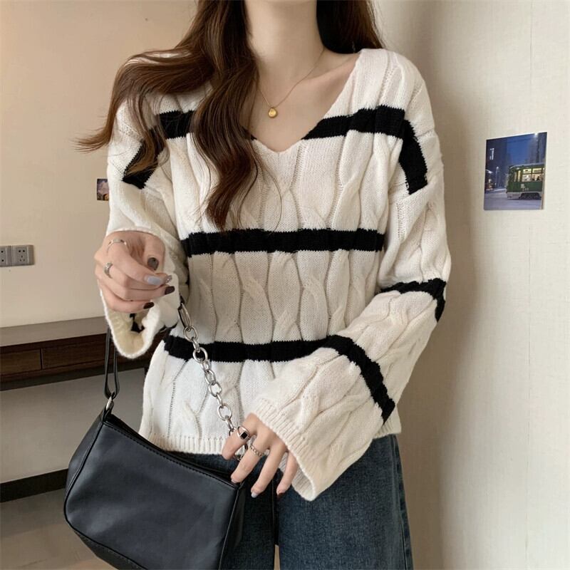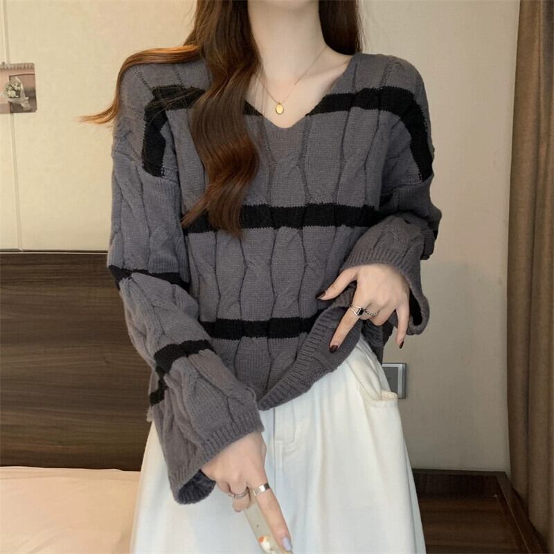 V ネックツイストストライプセーター女性の秋と冬の 2023 新しい人気バージョン怠惰なルーズアウターウェアプルオーバーセーター オータム 秋物 ウィンター 冬物 Vネック 7460047594224518 | framboise21