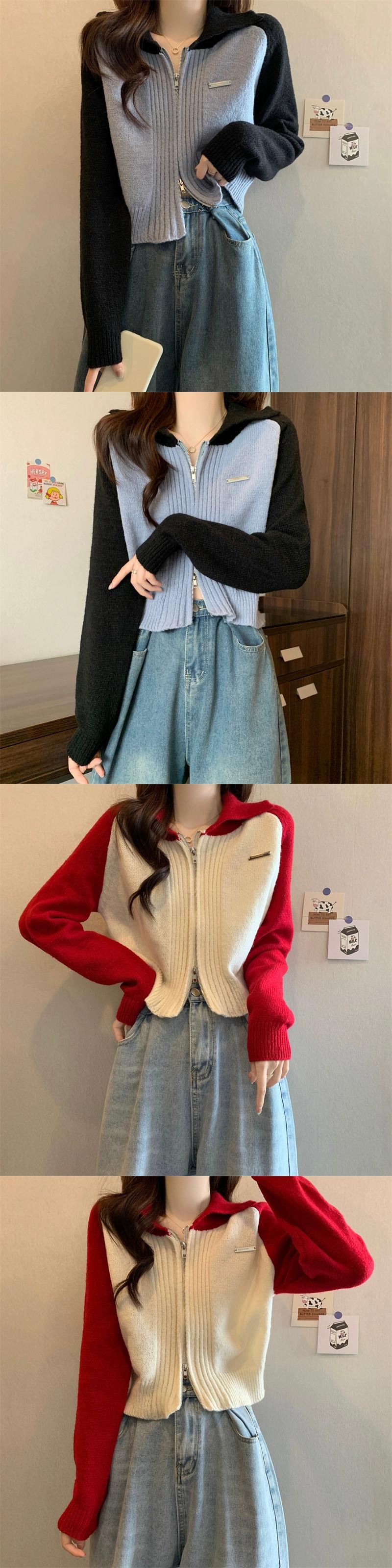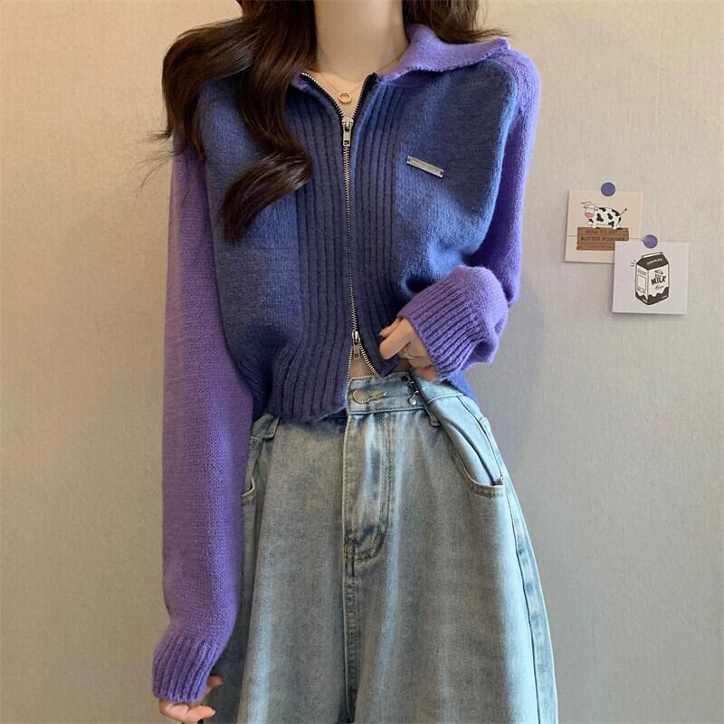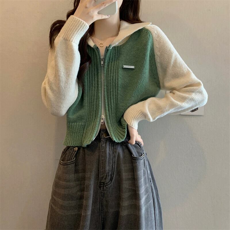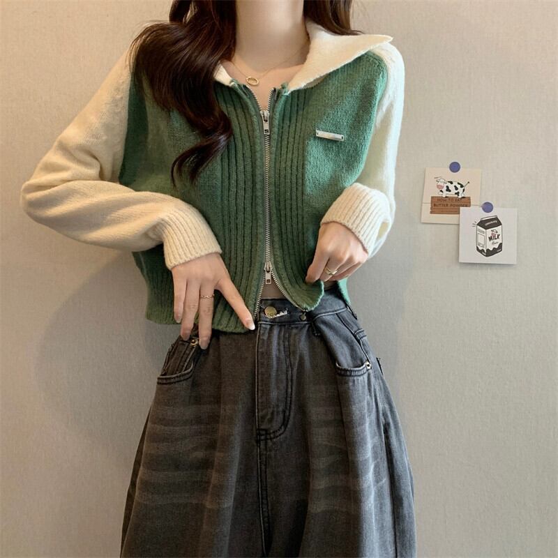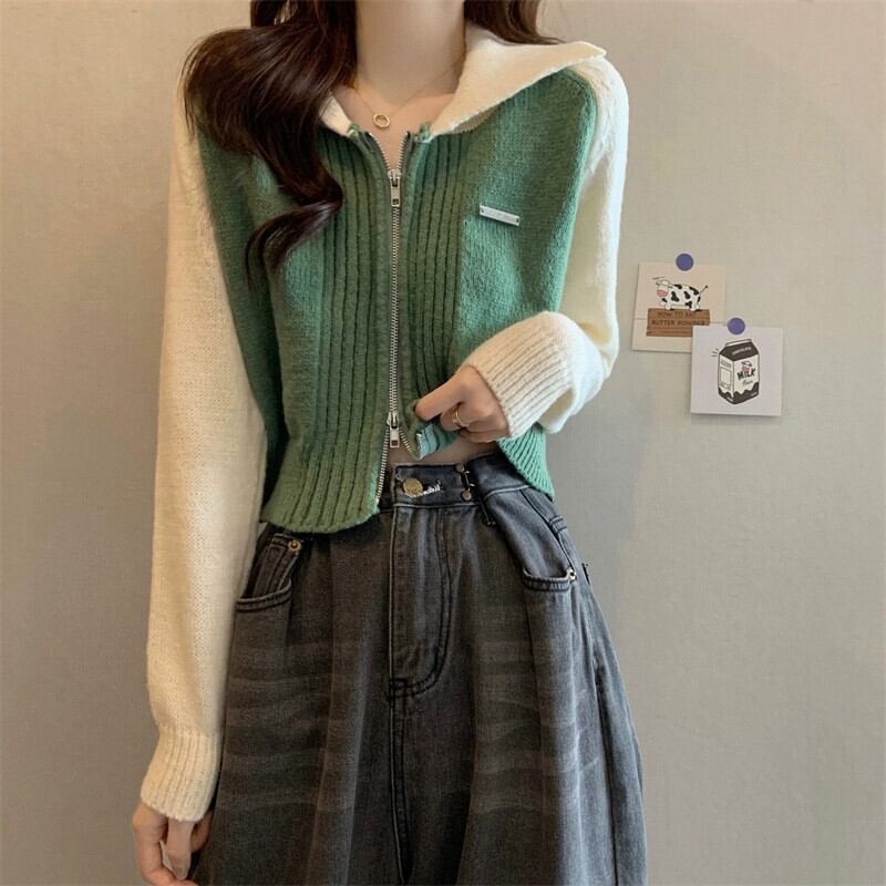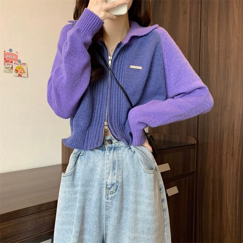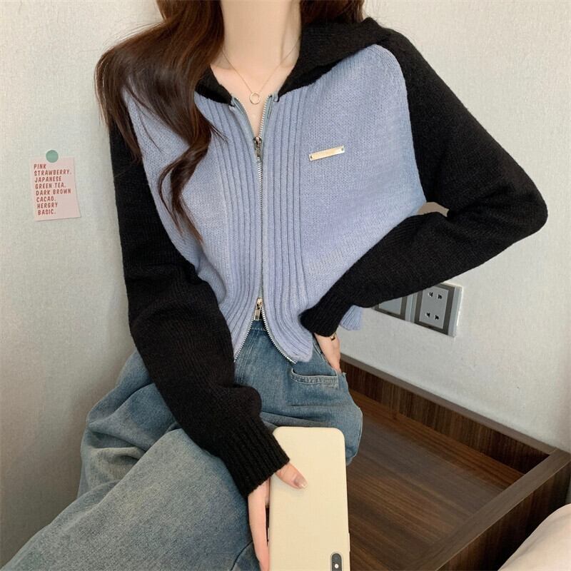 小さなショートジッパーセータージャケット女性 2023 春と秋の新作ルーズコントラストラグラン長袖ニットカーディガン ロング スプリング 春物 オータム 秋物 7460043831852119 | framboise21