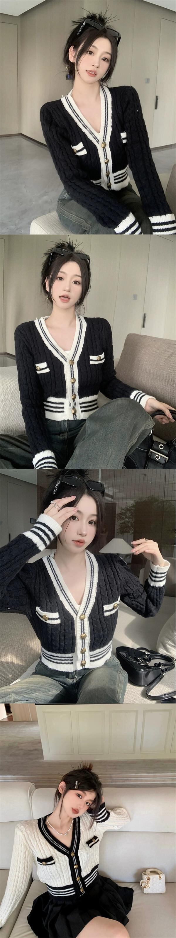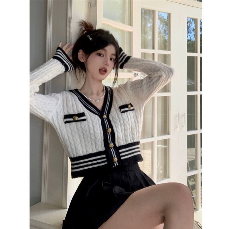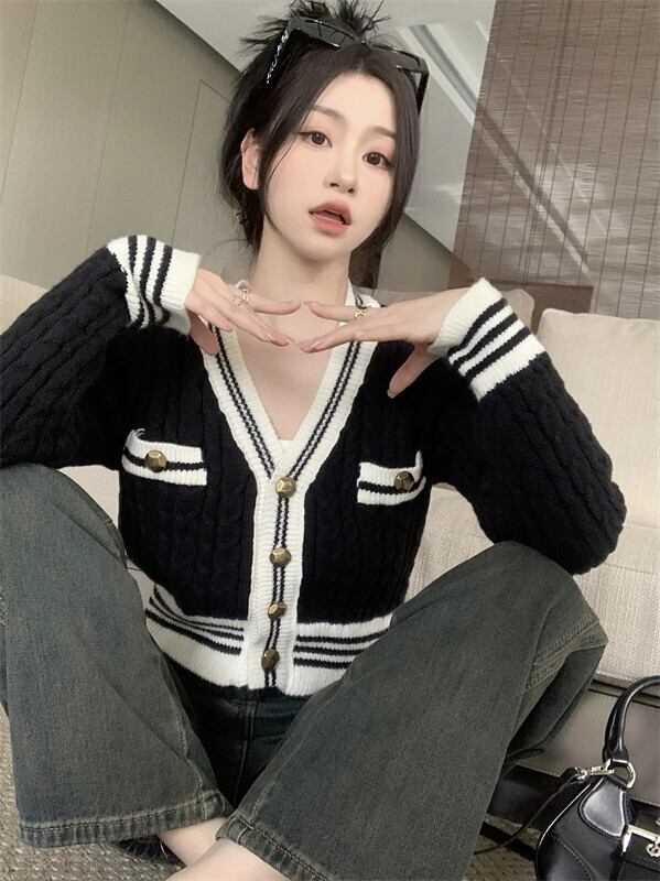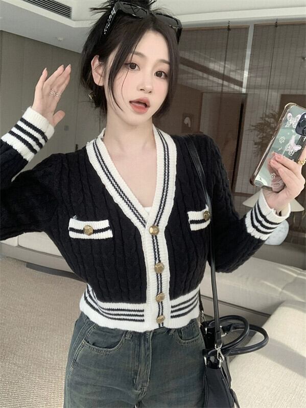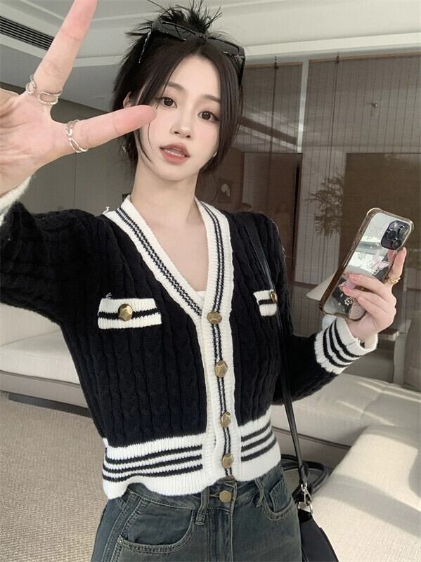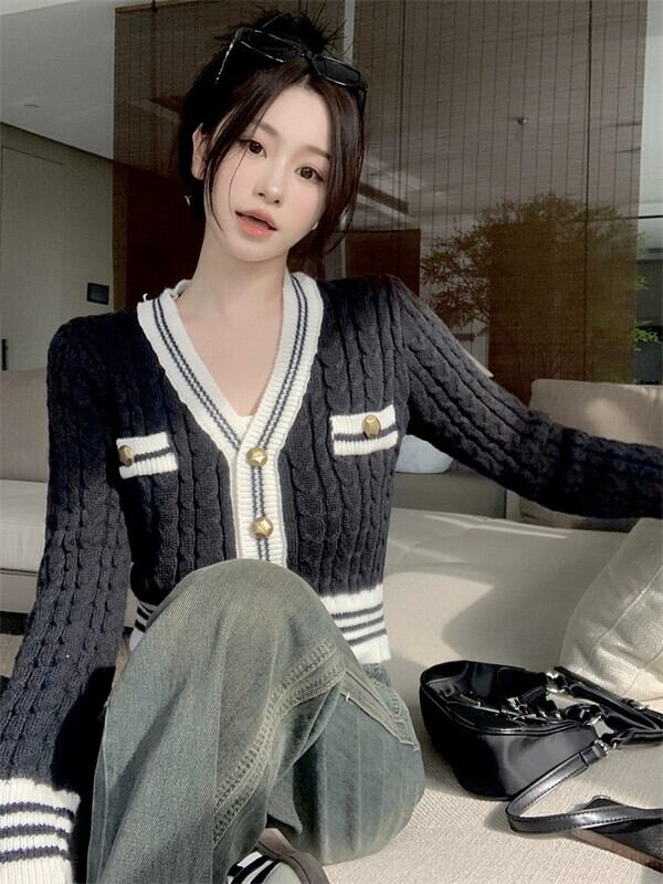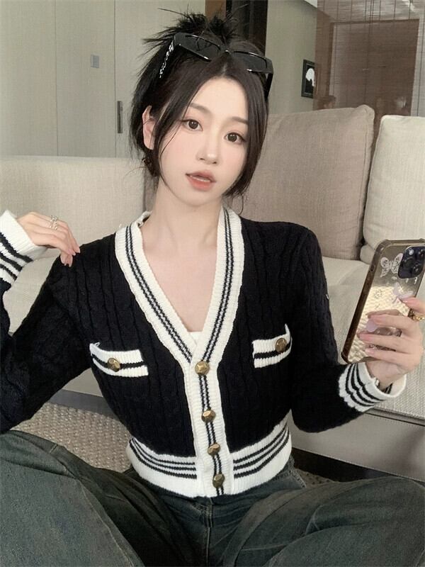 秋冬のVネックツイストセータージャケット女性、小さな香りのデザイン、スリムなアウターウェア、短いニットカーディガン小人 ショート オータム 秋物 ウィンター 冬物 7460098556801066 | framboise21