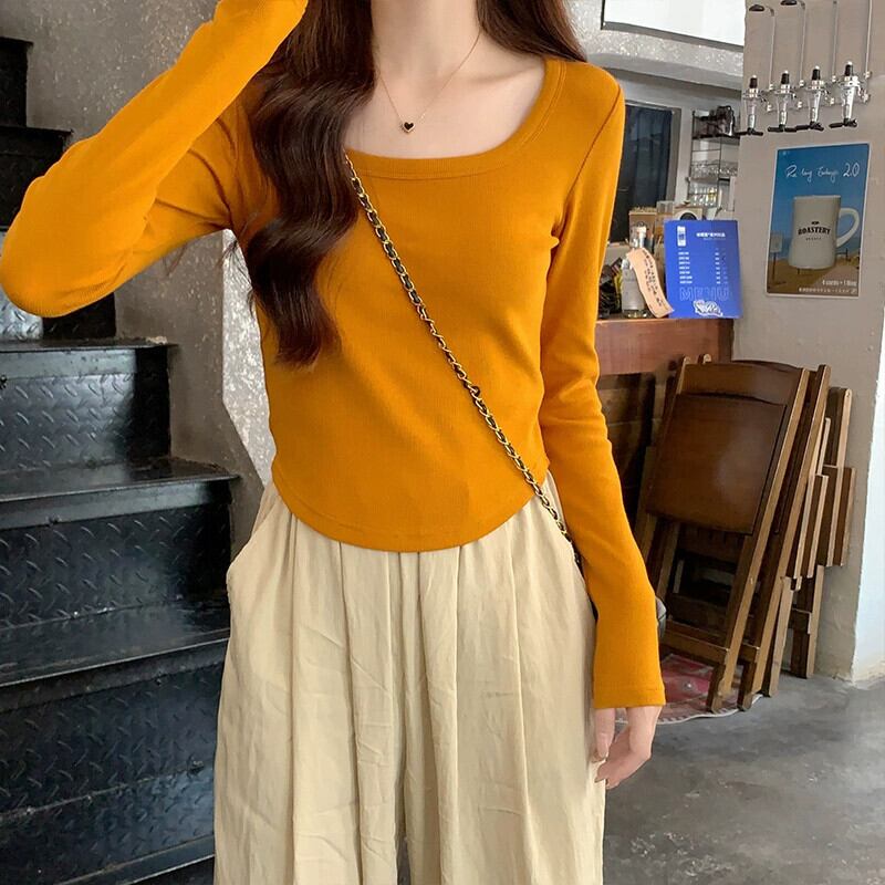 純綿スクエアカラーボトリングシャツ女性、2023年秋冬の新しいスタイル、不規則なショートトップ、長袖Tシャツ ロング コットン オータム 秋物 ウィンター 冬物 スクウェア 7460013731713027 | framboise21