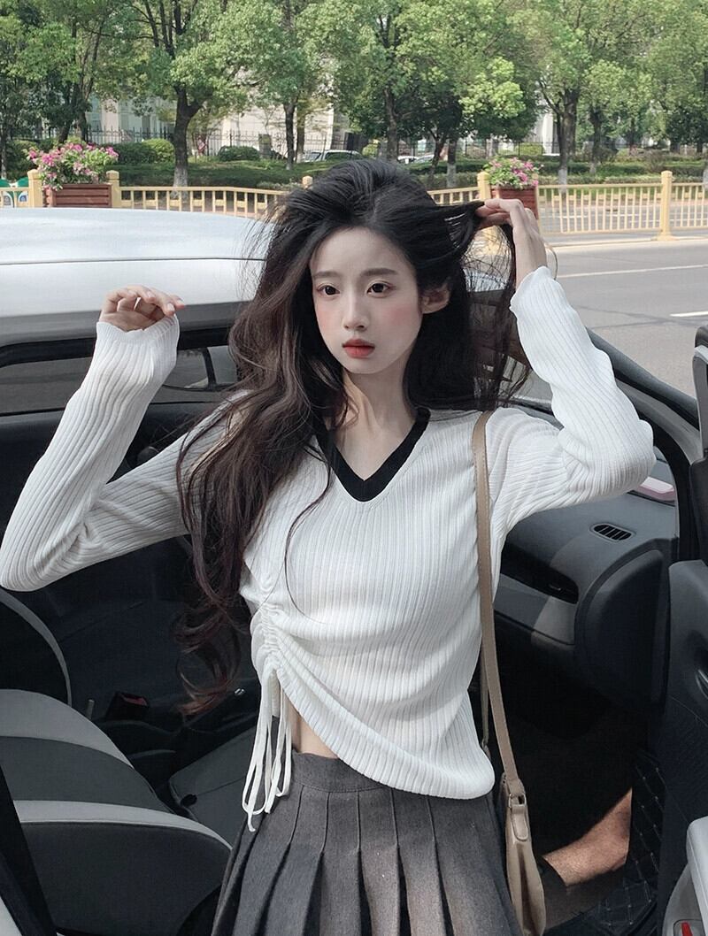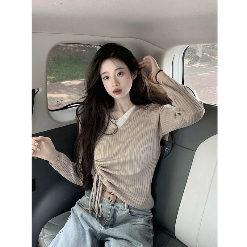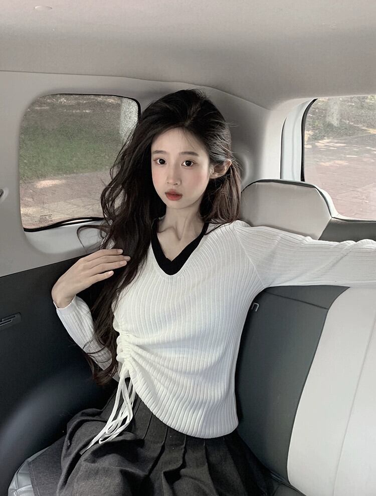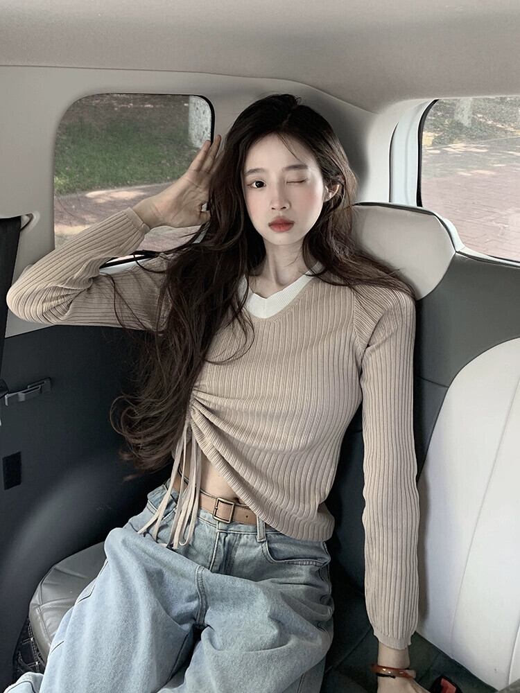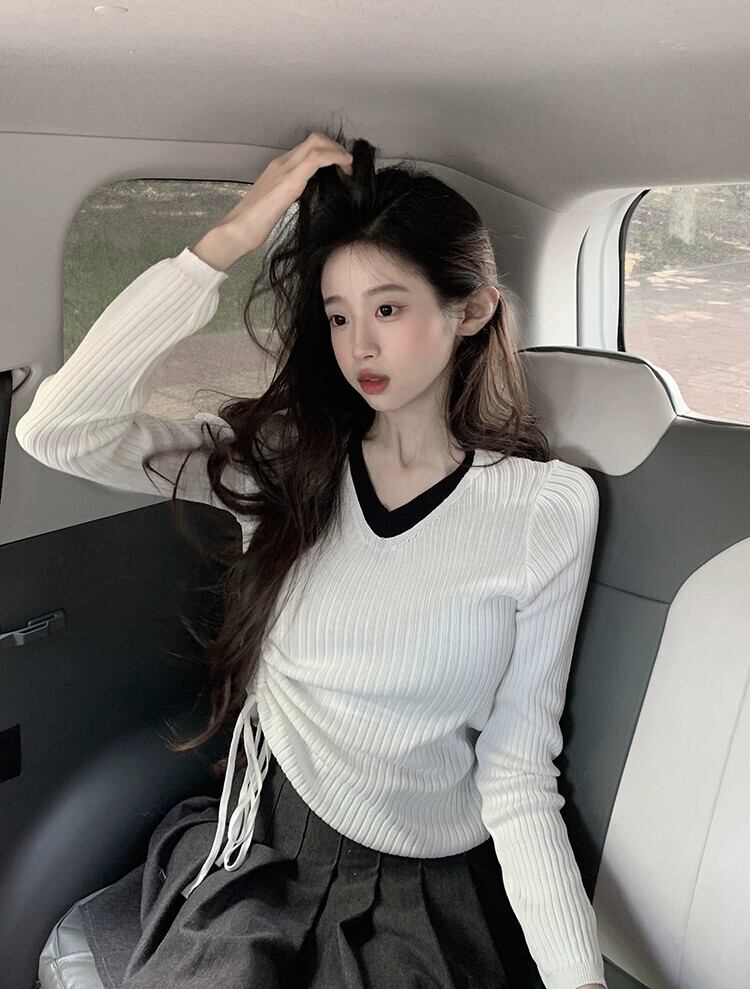 秋冬のフェイクツーピースVネックボトリングシャツ女性、ファッショナブルでスタイリッシュ、プリーツショートニットセーター付きスリムフィットインナー オータム 秋物 ウィンター 冬物 746001426877351 | framboise21