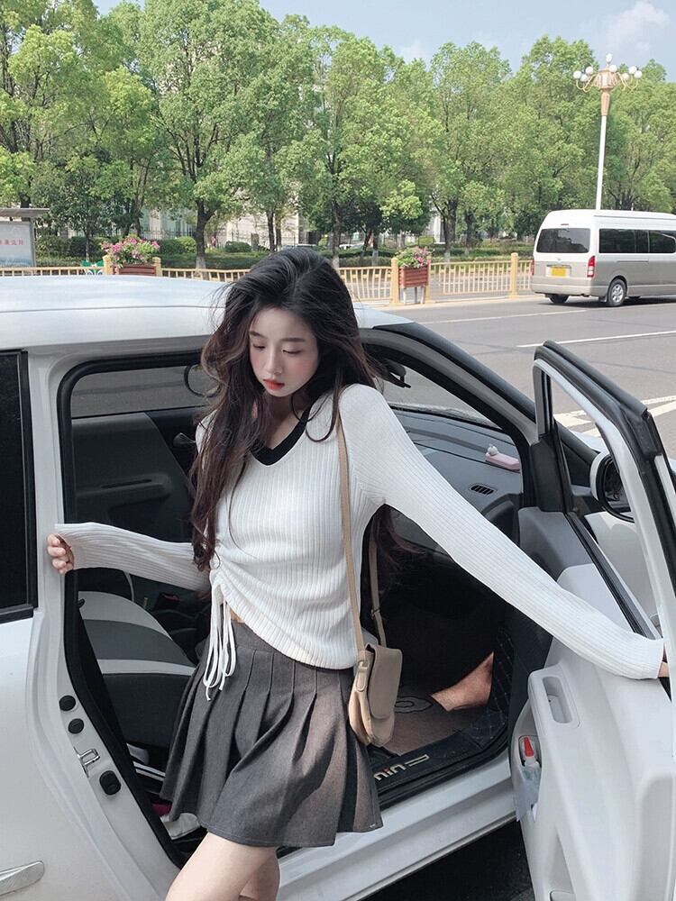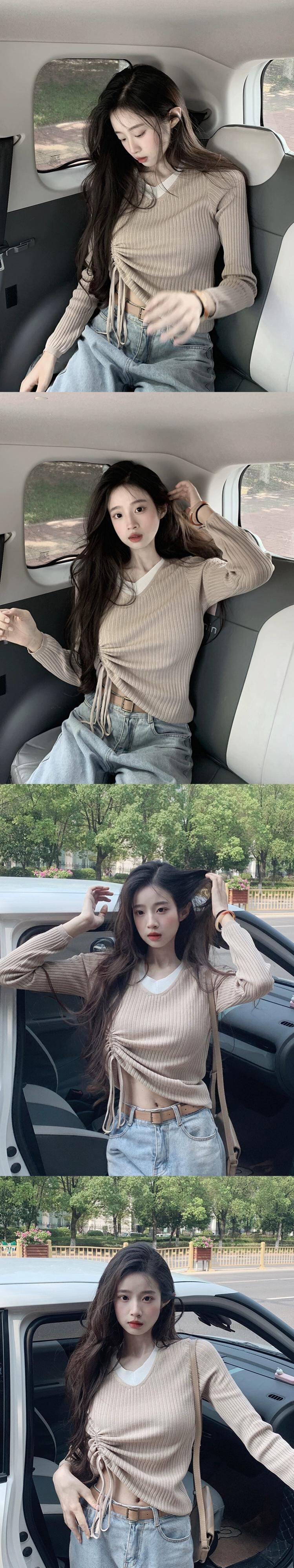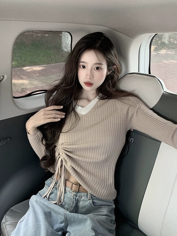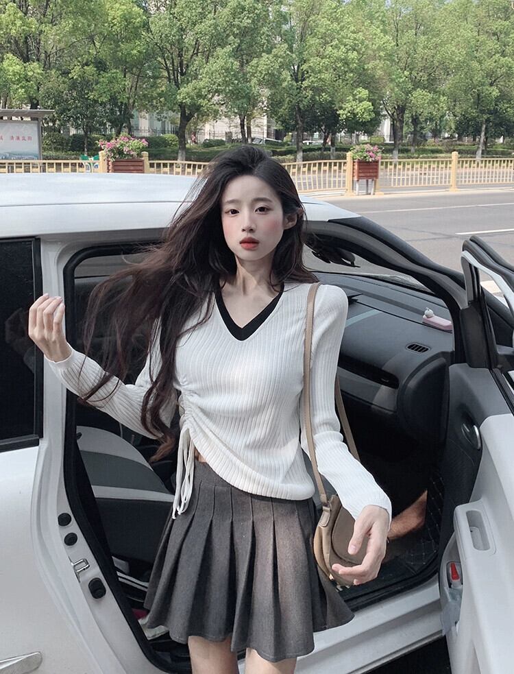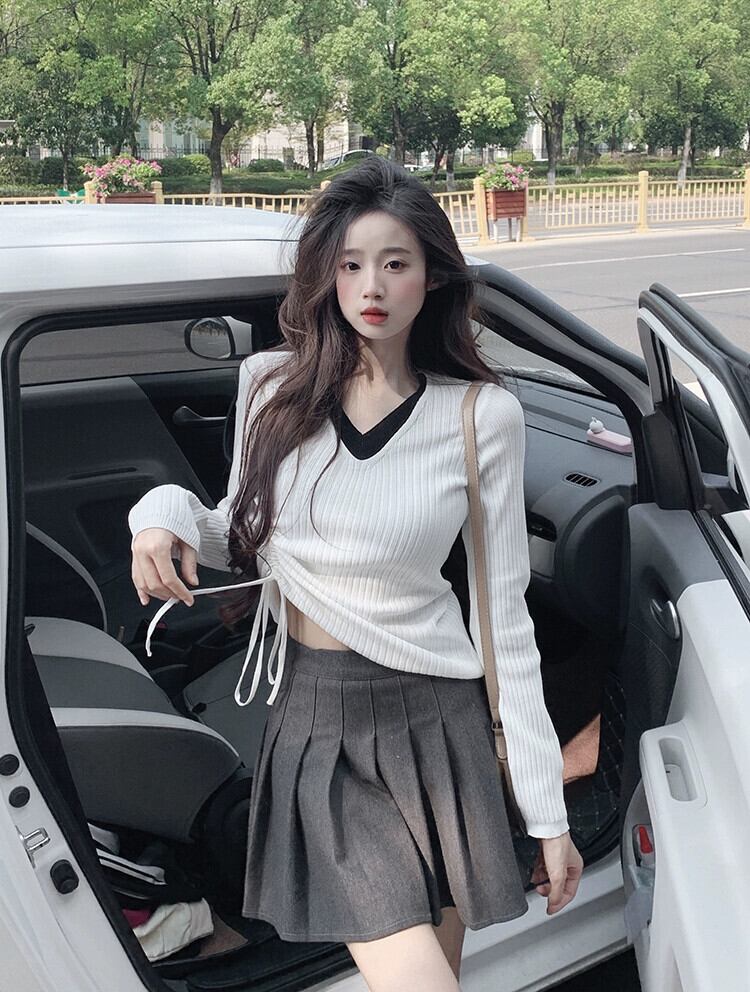 秋冬のフェイクツーピースVネックボトリングシャツ女性、ファッショナブルでスタイリッシュ、プリーツショートニットセーター付きスリムフィットインナー オータム 秋物 ウィンター 冬物 746001426877351 | framboise21