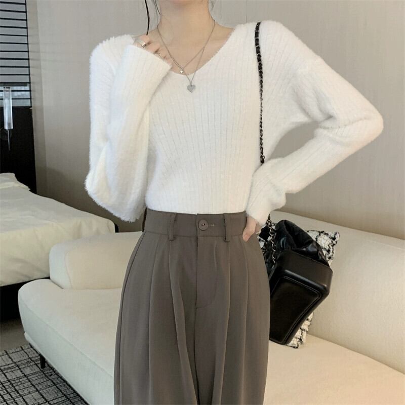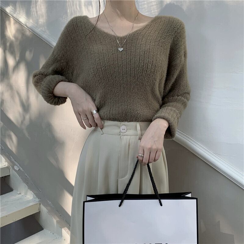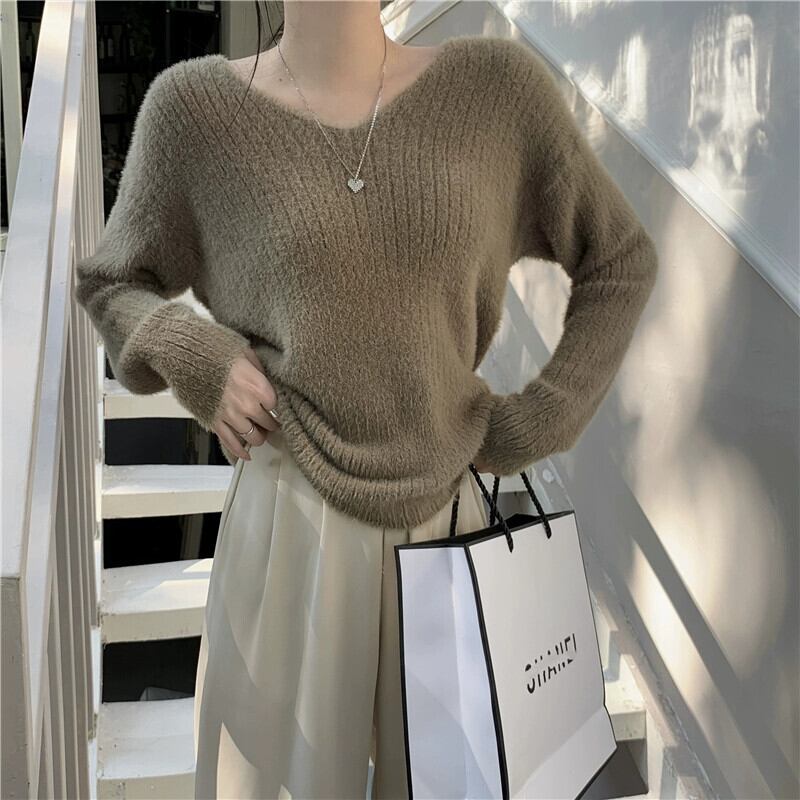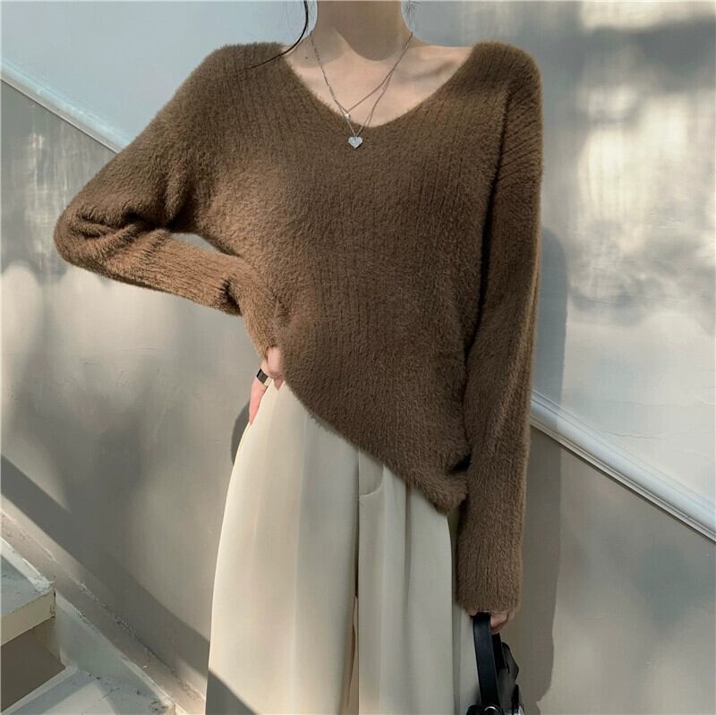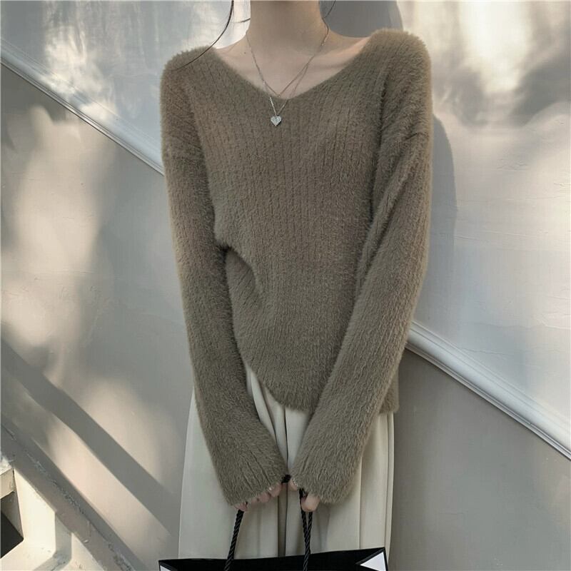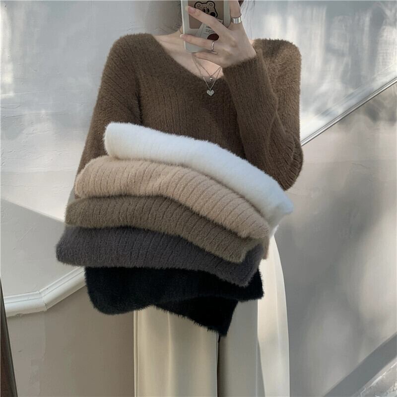 模造ミンクベルベット V ネックソフトワックスセーター女性、秋と冬のスタイル、レトロなルーズアウターウェア、怠惰なスタイルのプルオーバー長袖セーター ロング オータム 秋物 ウィンター 冬物 Vネック 7460093344428489 | framboise21