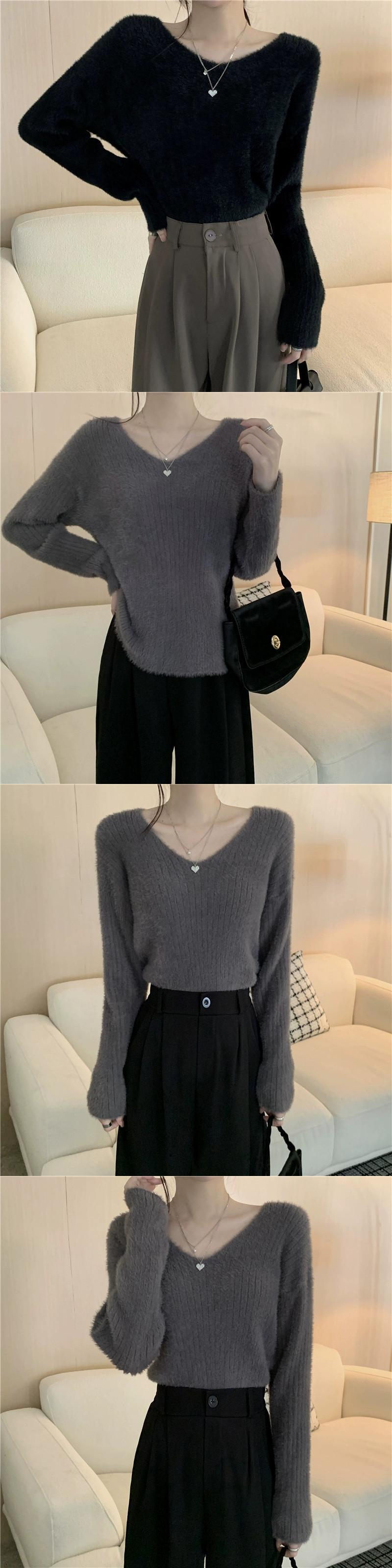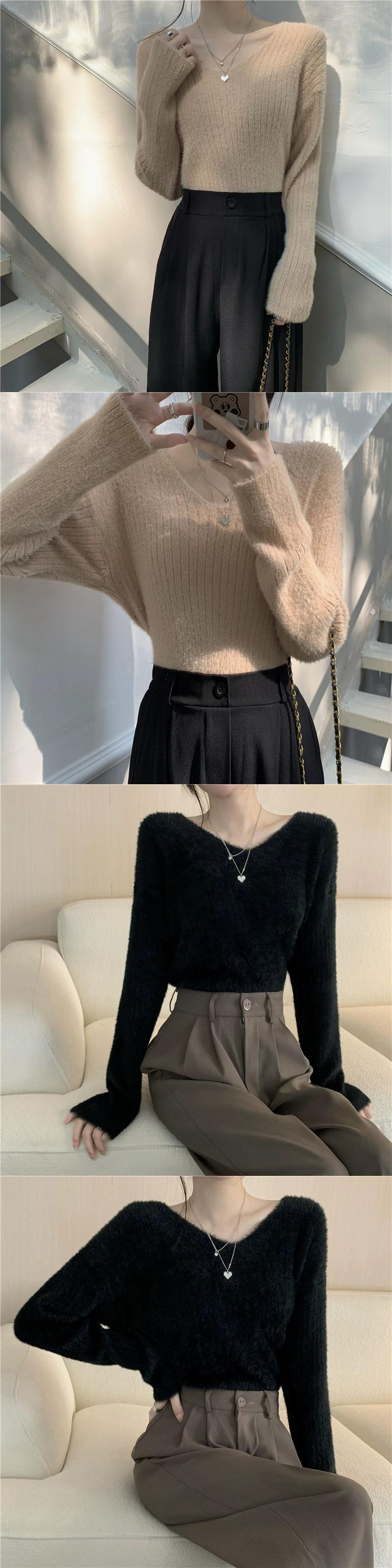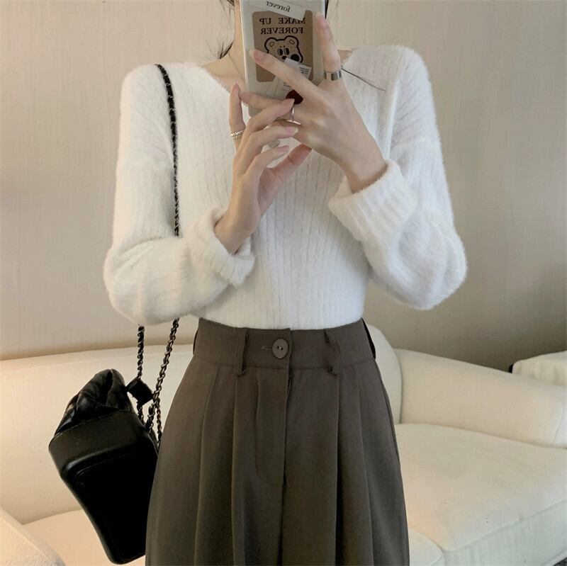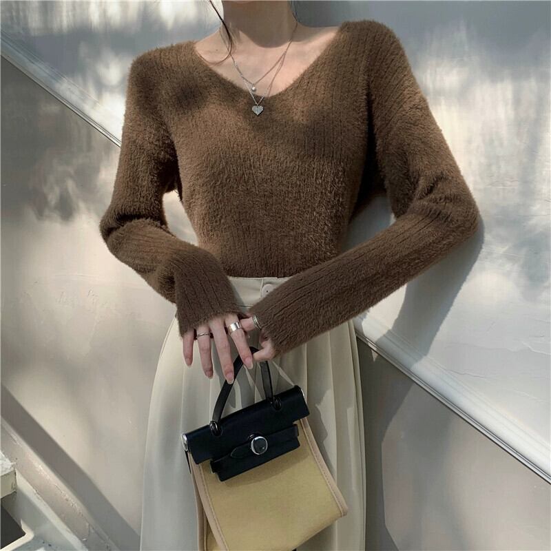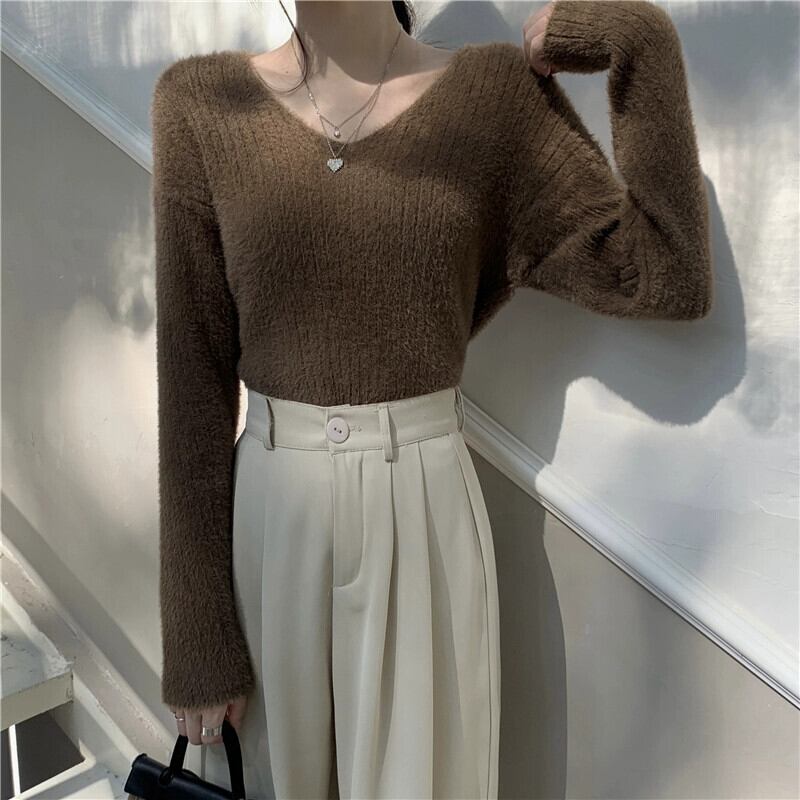 模造ミンクベルベット V ネックソフトワックスセーター女性、秋と冬のスタイル、レトロなルーズアウターウェア、怠惰なスタイルのプルオーバー長袖セーター ロング オータム 秋物 ウィンター 冬物 Vネック 7460093344428489 | framboise21