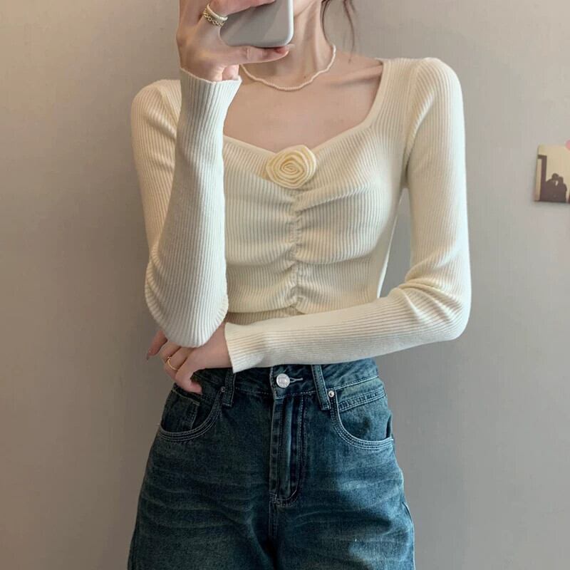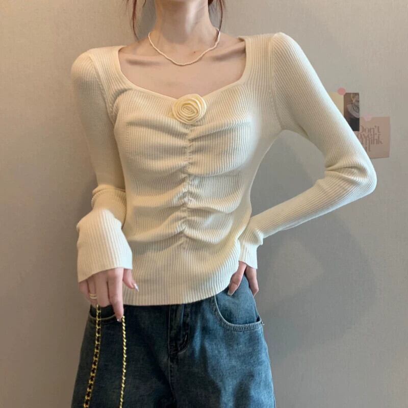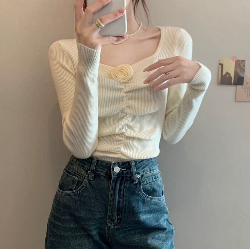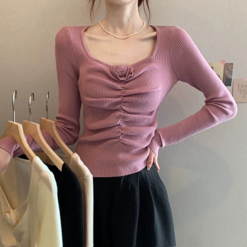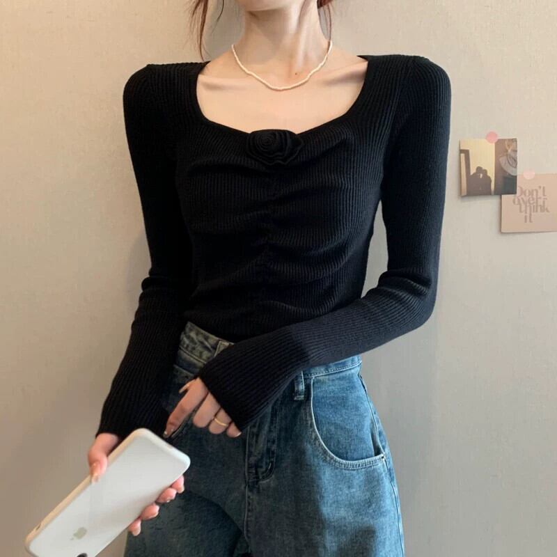 プリーツスクエアネックボトリングシャツ 2023 新しい女性の秋冬インナーショートセーターファッショナブルなスリム長袖ニットトップ ロング オータム 秋物 ウィンター 冬物 スクウェア 7460035135890640 | framboise21