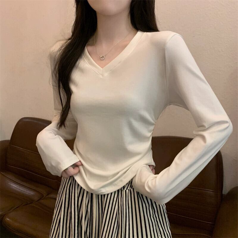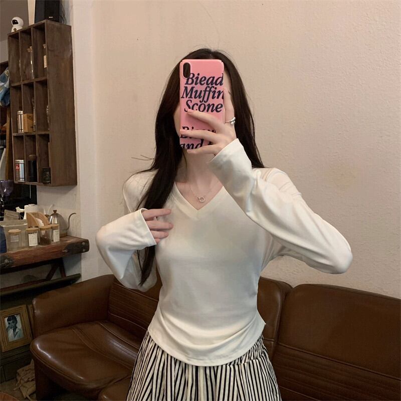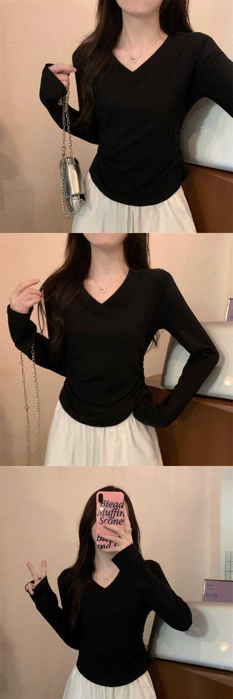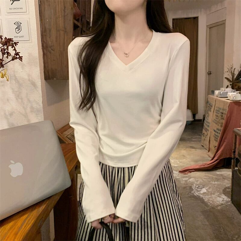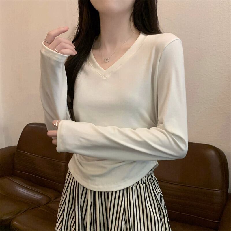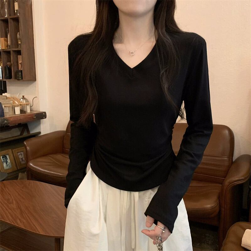 秋冬の白いVネックボトムシャツレディース、ウエスタンスタイルのスリムフィット、不規則なプリーツのショートトップ、純綿の長袖Tシャツ ロング ホワイト コットン オータム 秋物 ウィンター 冬物 ピュア 7460032828179891 | framboise21