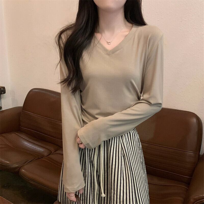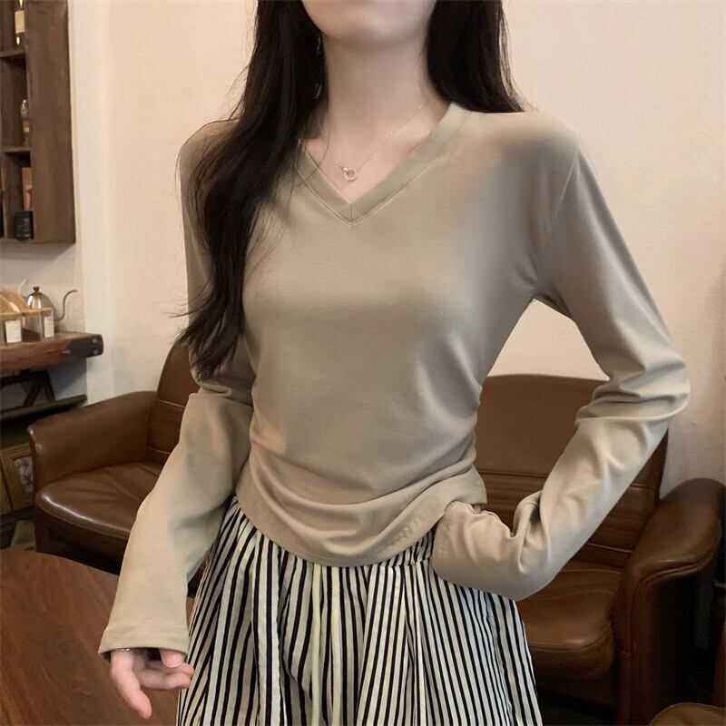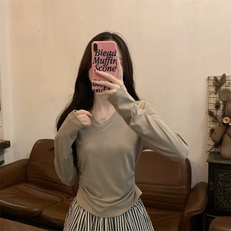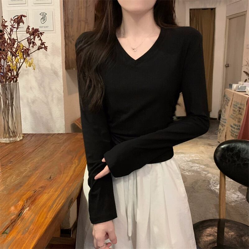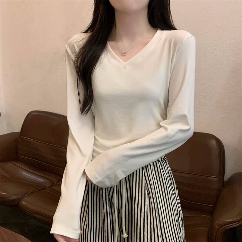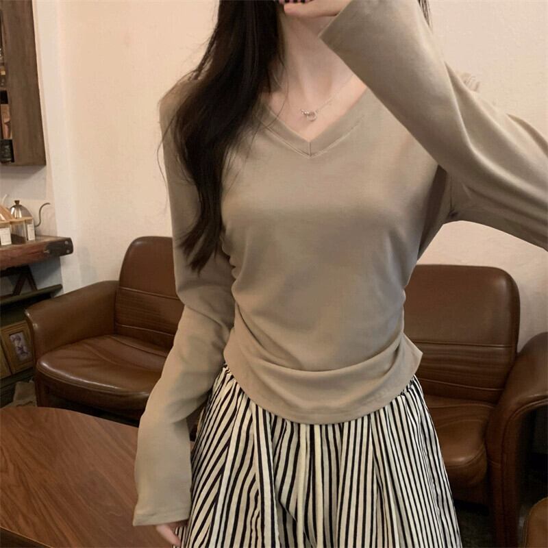 秋冬の白いVネックボトムシャツレディース、ウエスタンスタイルのスリムフィット、不規則なプリーツのショートトップ、純綿の長袖Tシャツ ロング ホワイト コットン オータム 秋物 ウィンター 冬物 ピュア 7460032828179891 | framboise21