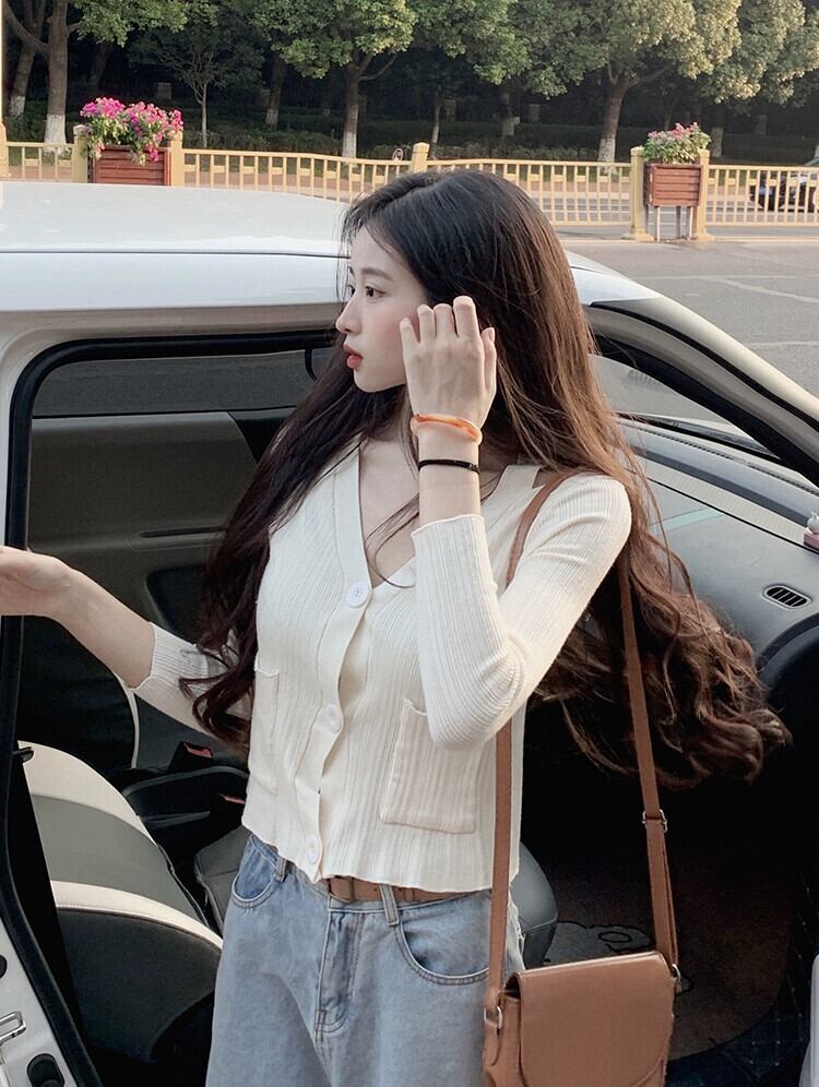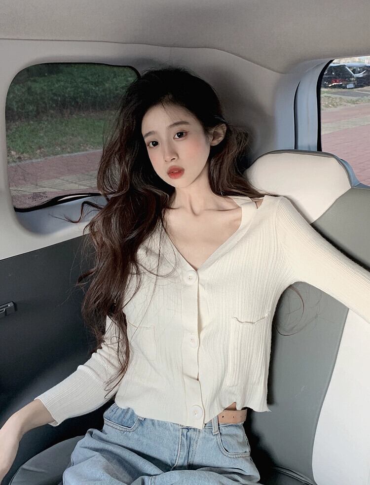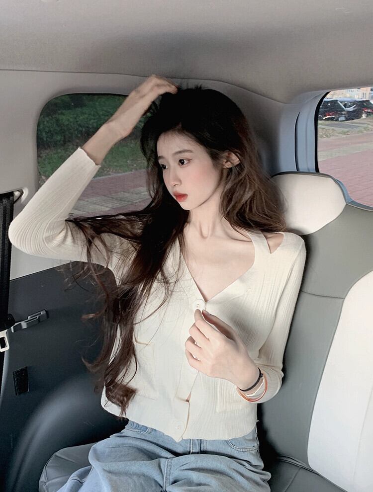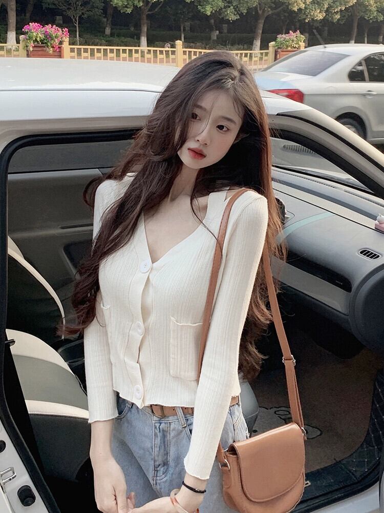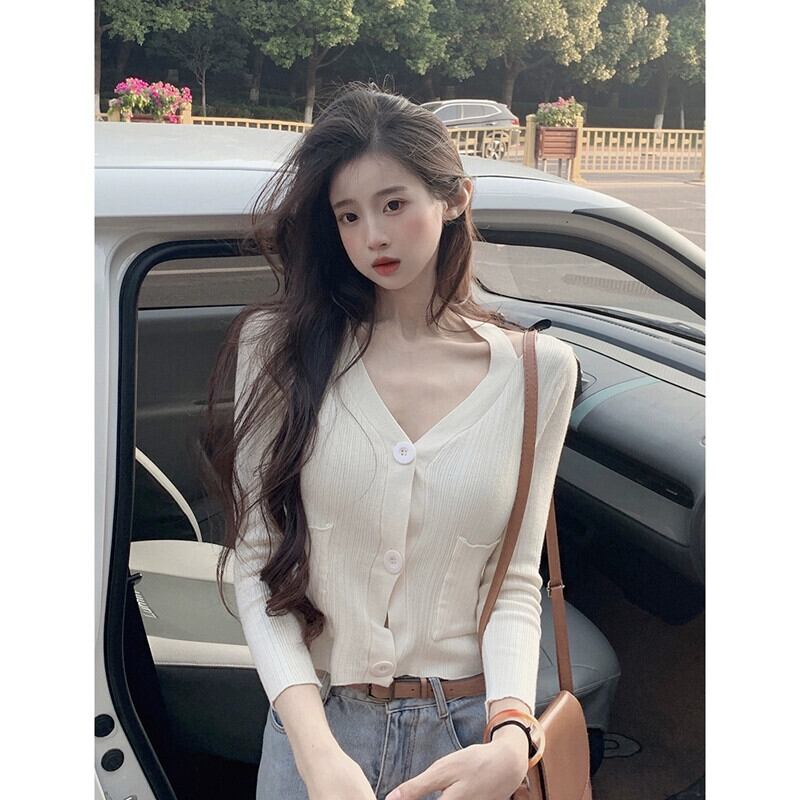 ショート V ネック ニット カーディガン ジャケット レディース、春と秋の薄いセーター、ファッショナブル、ウエスタン スタイル、スリム フィット、中空長袖トップ、アプリコット ロング スプリング 春物 オータム 秋物 Vネック 7460071145018796 | framboise21