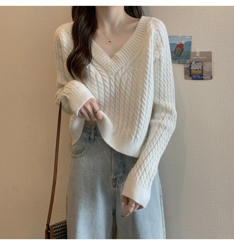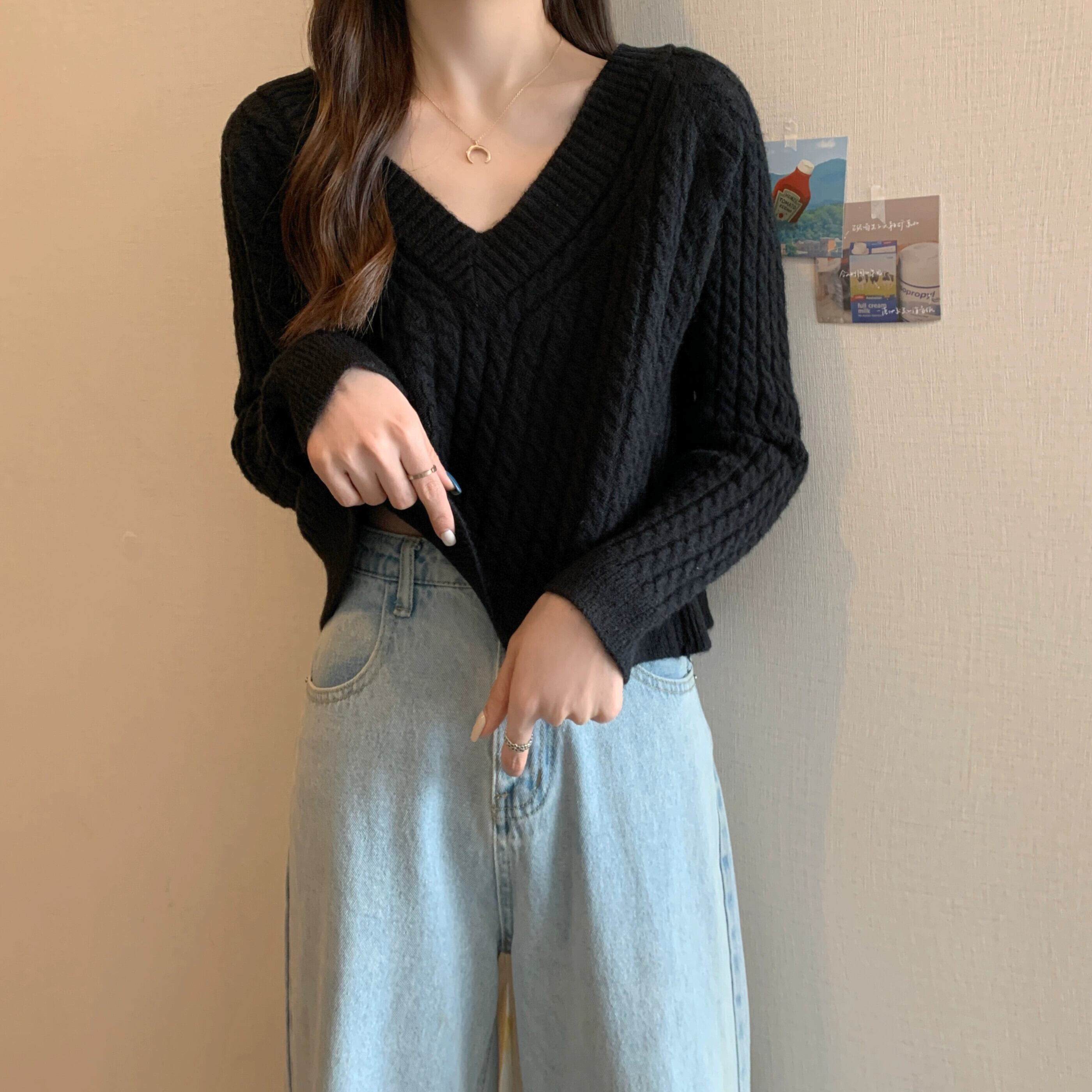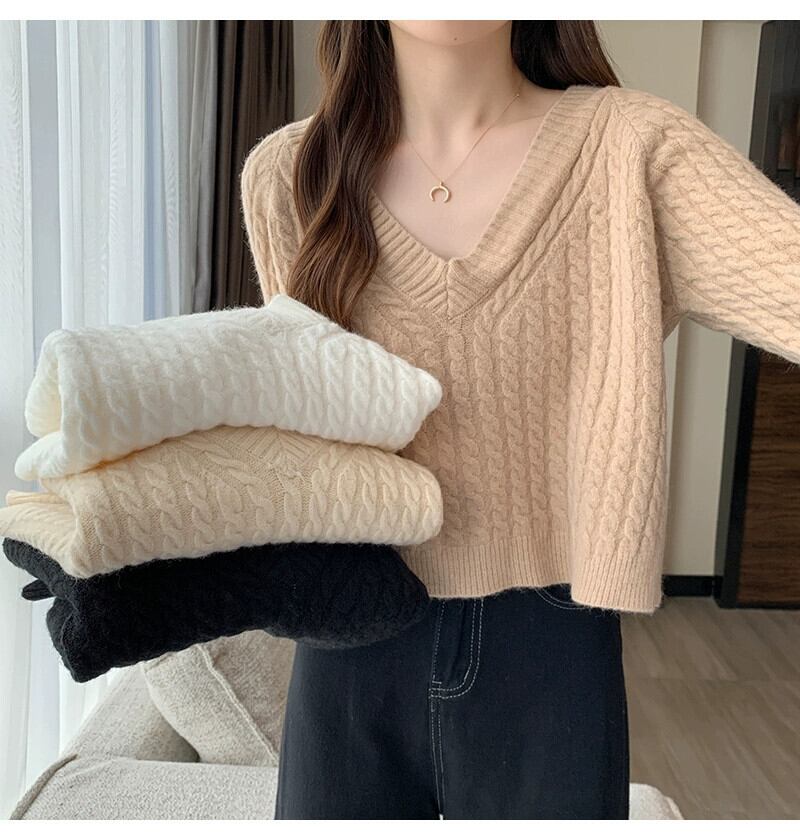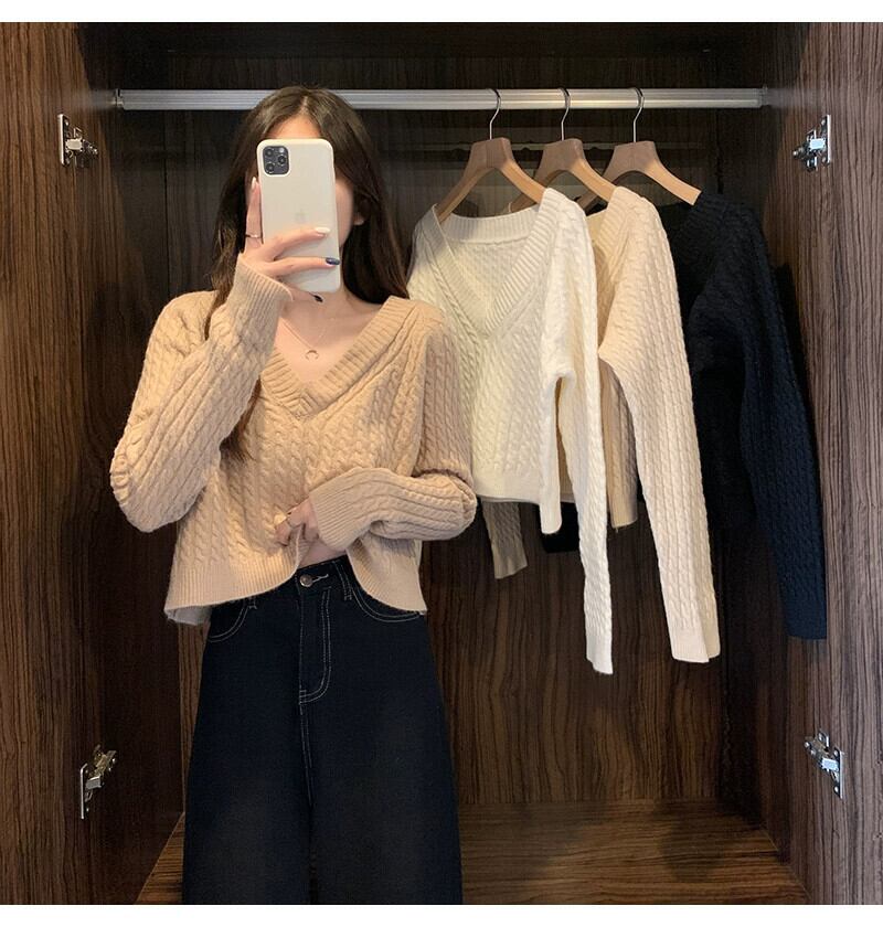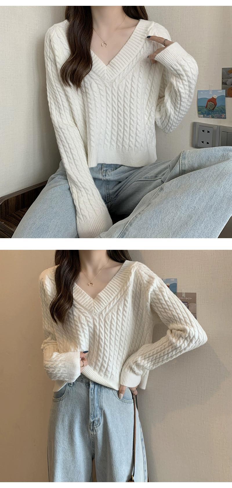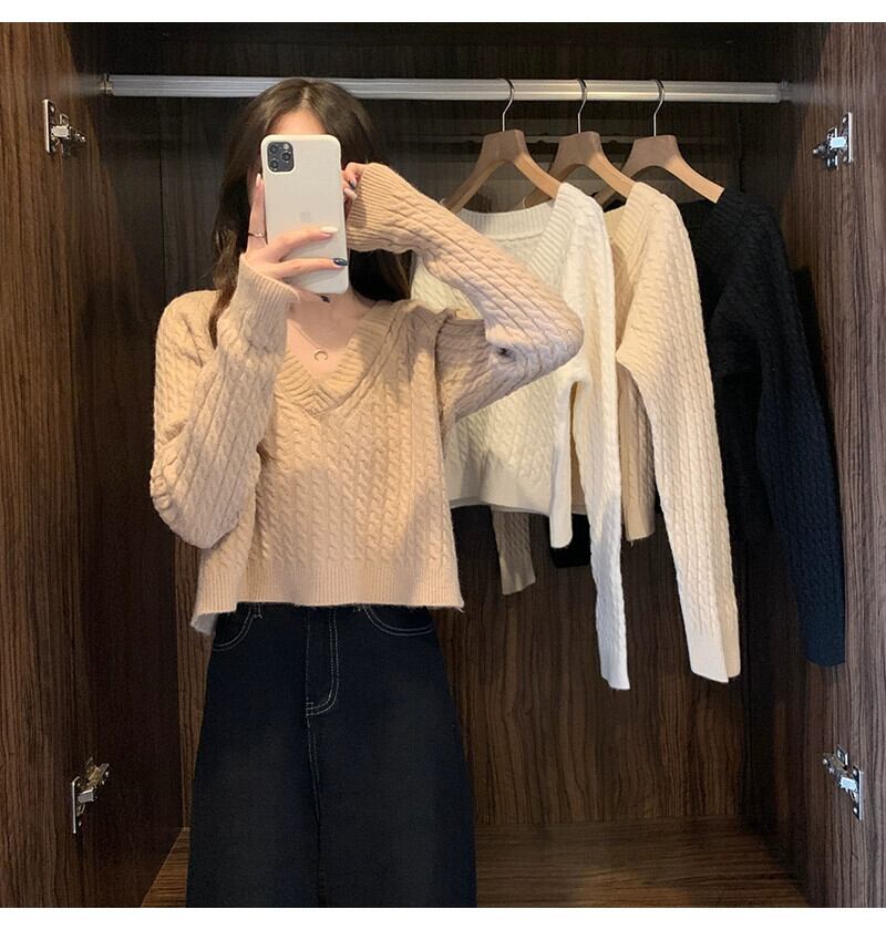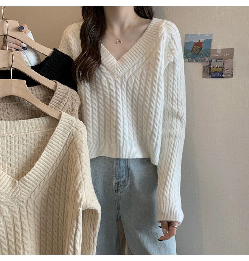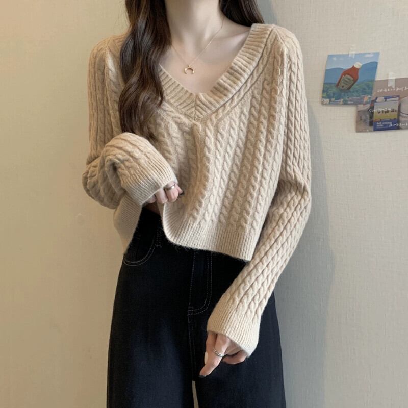 秋と冬のプルオーバー V ネックツイストセーター女性、ゆったりとしたアウターウェアとインナーウェアの小さな人、ハイウエストの短い長袖セーター ショート ロング オータム 秋物 ウィンター 冬物 Vネック 7460028216993798 | framboise21