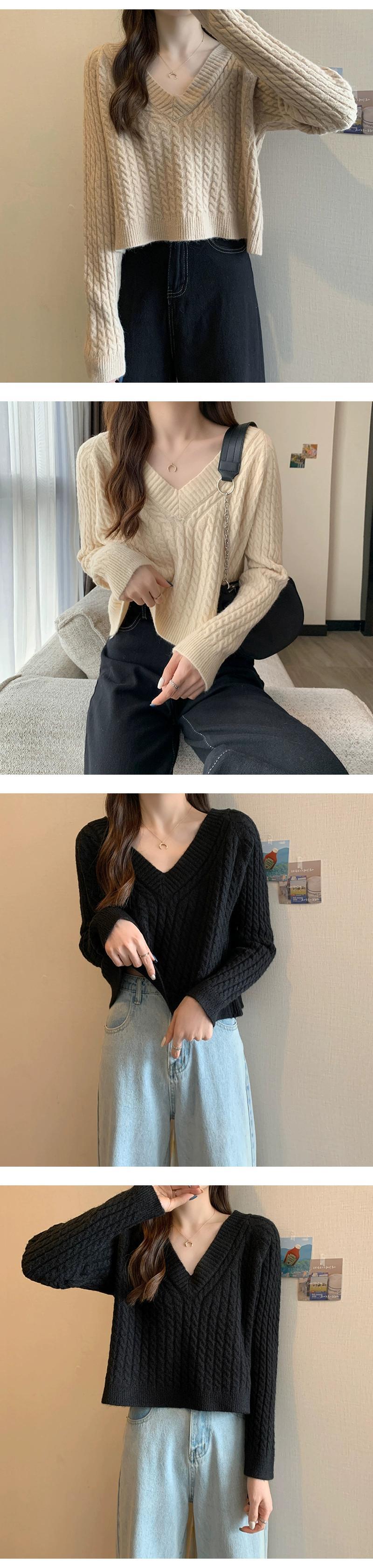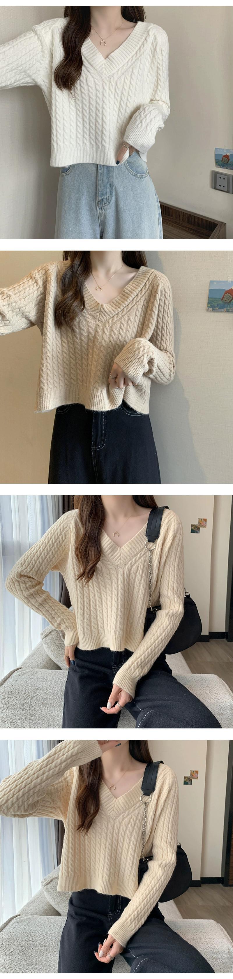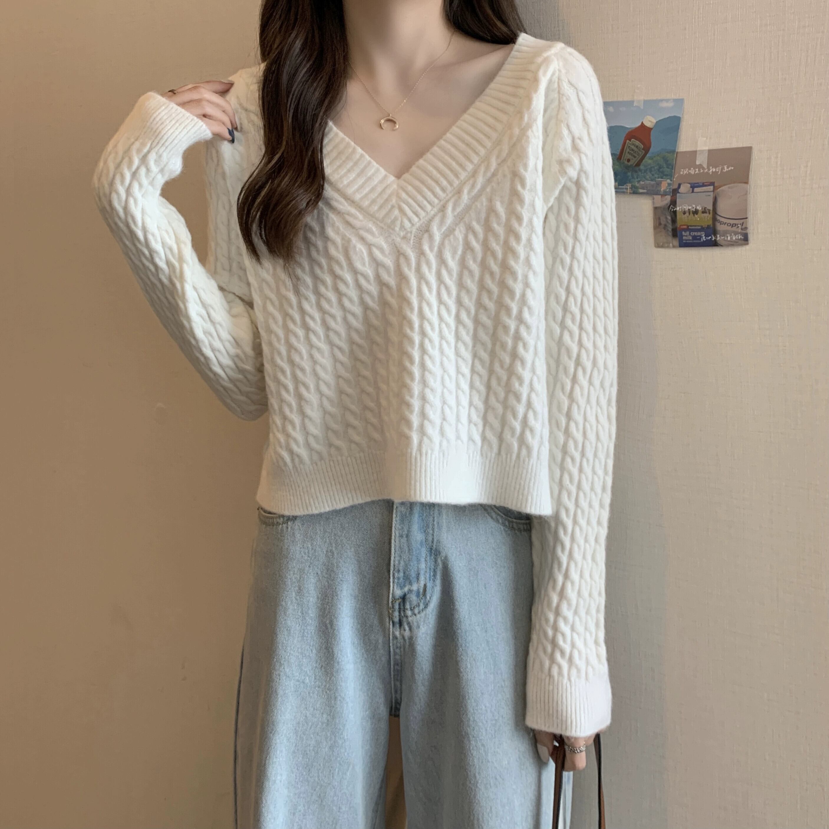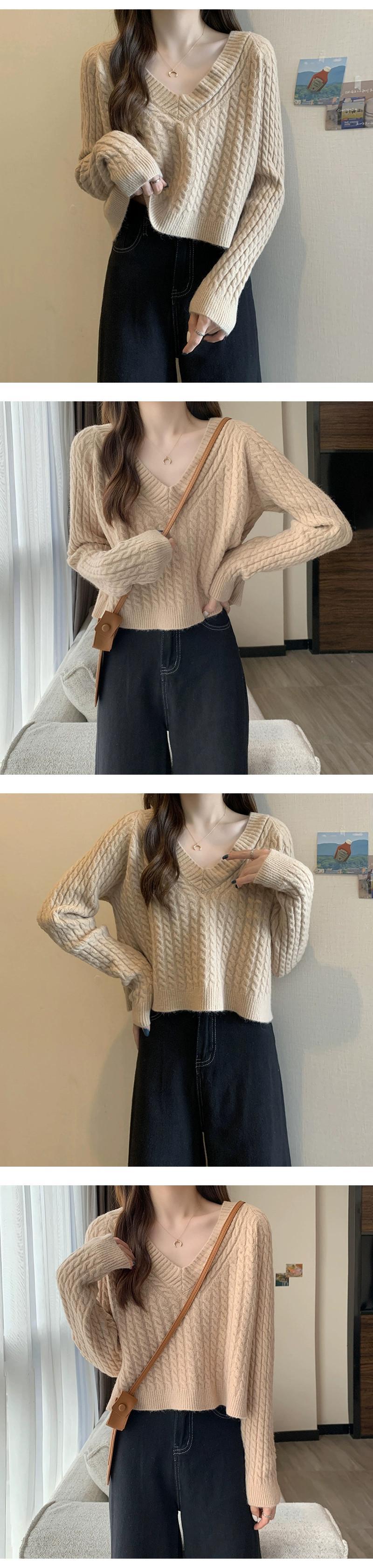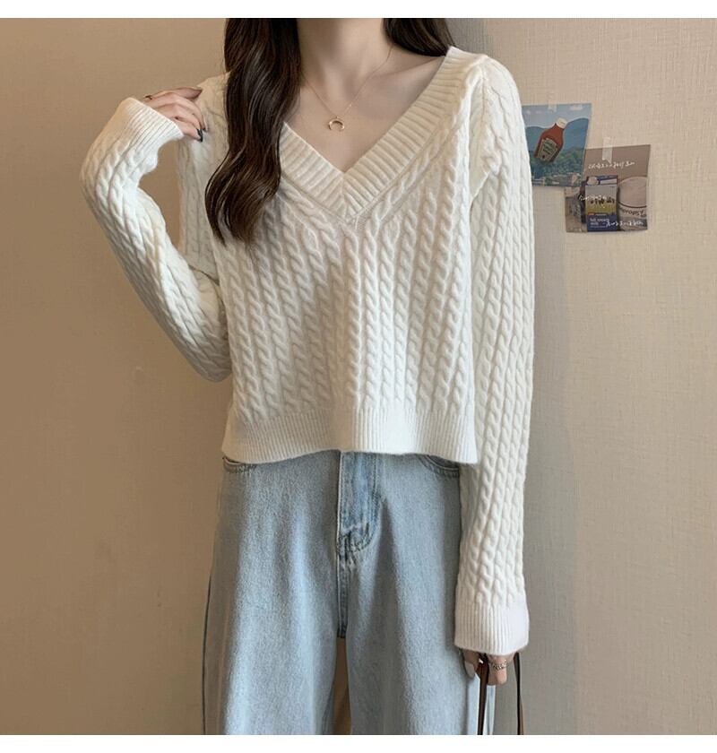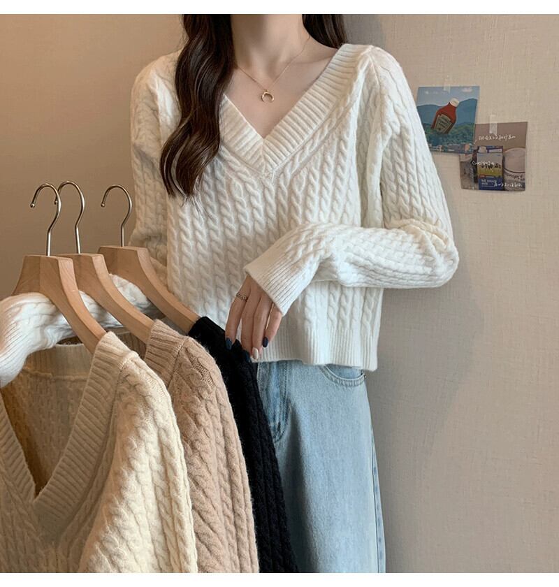 秋と冬のプルオーバー V ネックツイストセーター女性、ゆったりとしたアウターウェアとインナーウェアの小さな人、ハイウエストの短い長袖セーター ショート ロング オータム 秋物 ウィンター 冬物 Vネック 7460028216993798 | framboise21