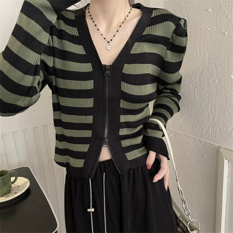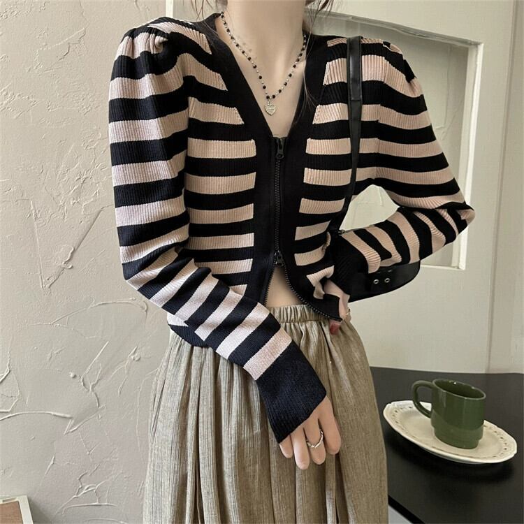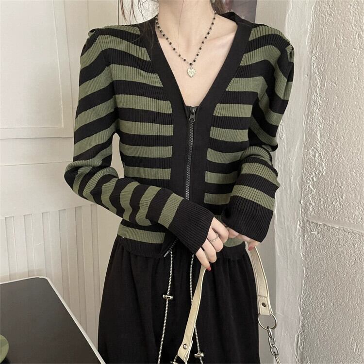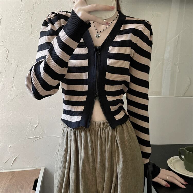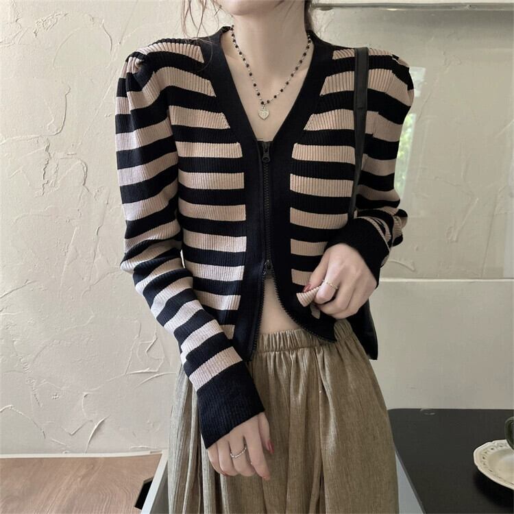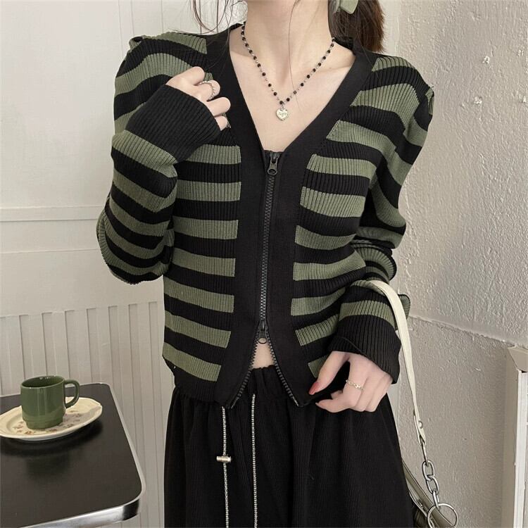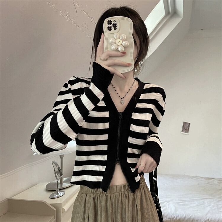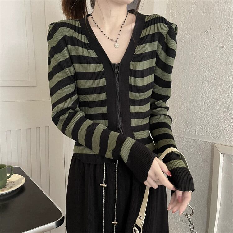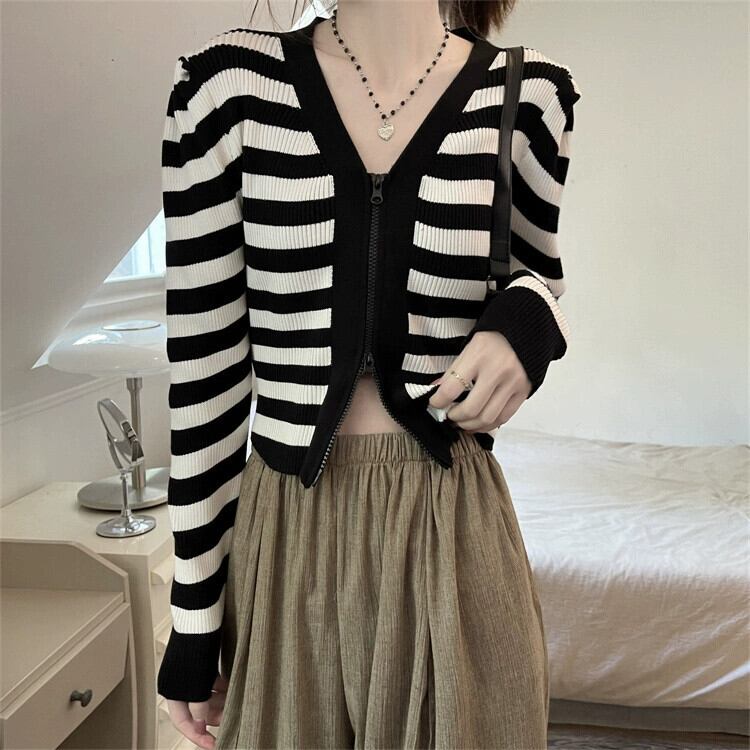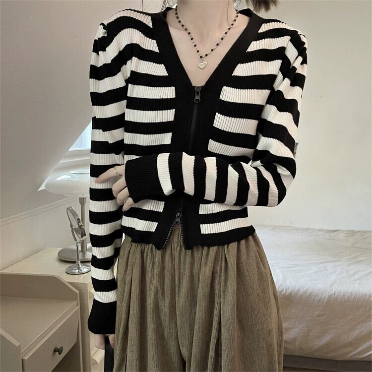 V ネックストライプ長袖ニットトップ女性の秋のファッションスリムでシックな小柄なハイウエストショートジッパーカーディガン ロング オータム 秋物 Vネック 7460092640098801 | framboise21