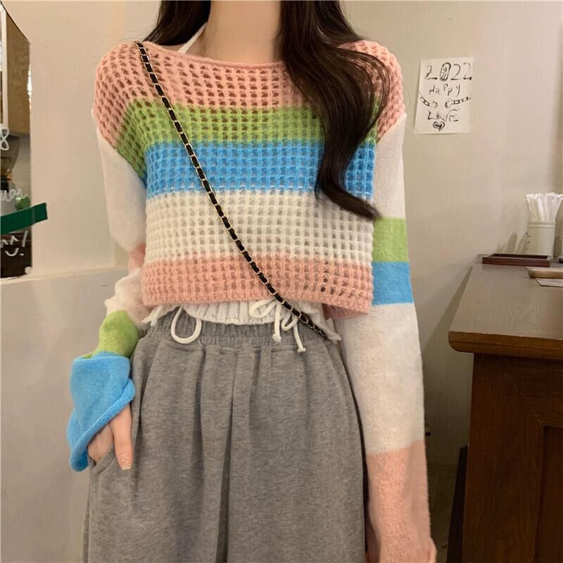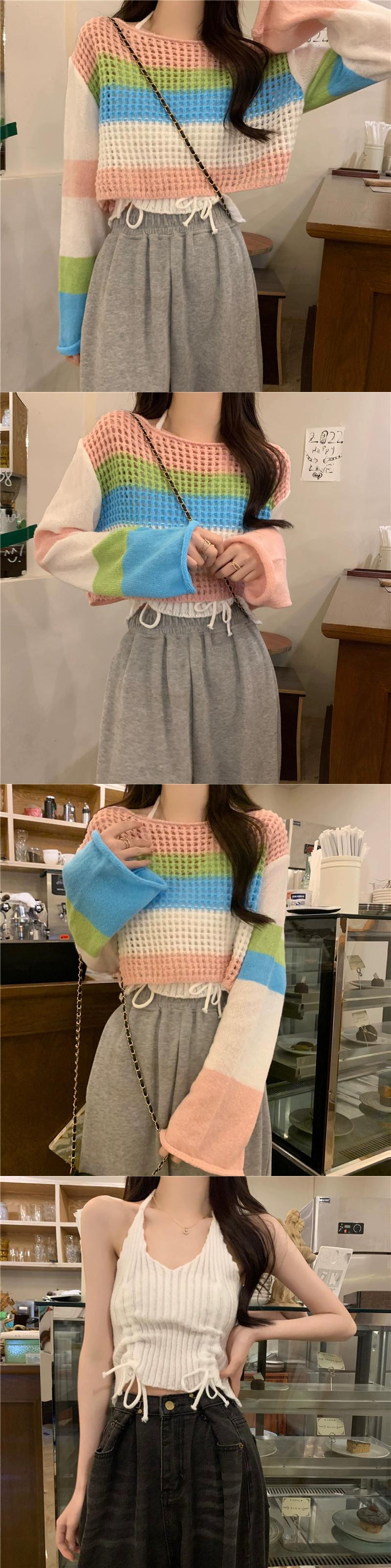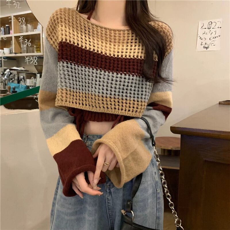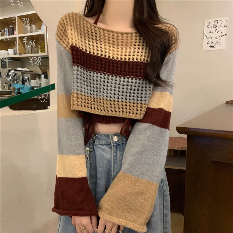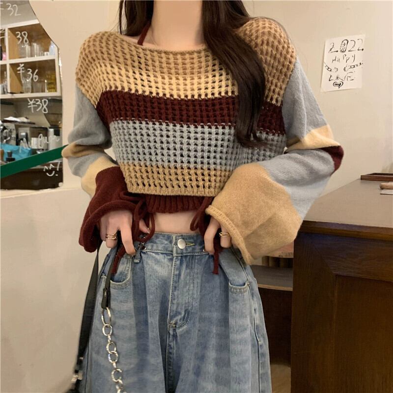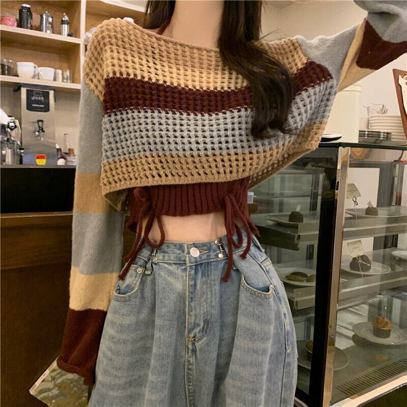 中空ストライプニットセーターレディース秋冬レトロルーズアウタープルオーバーショートホルターネックキャミソール2点セット オータム 秋物 ウィンター 冬物 7460076552358996 | framboise21