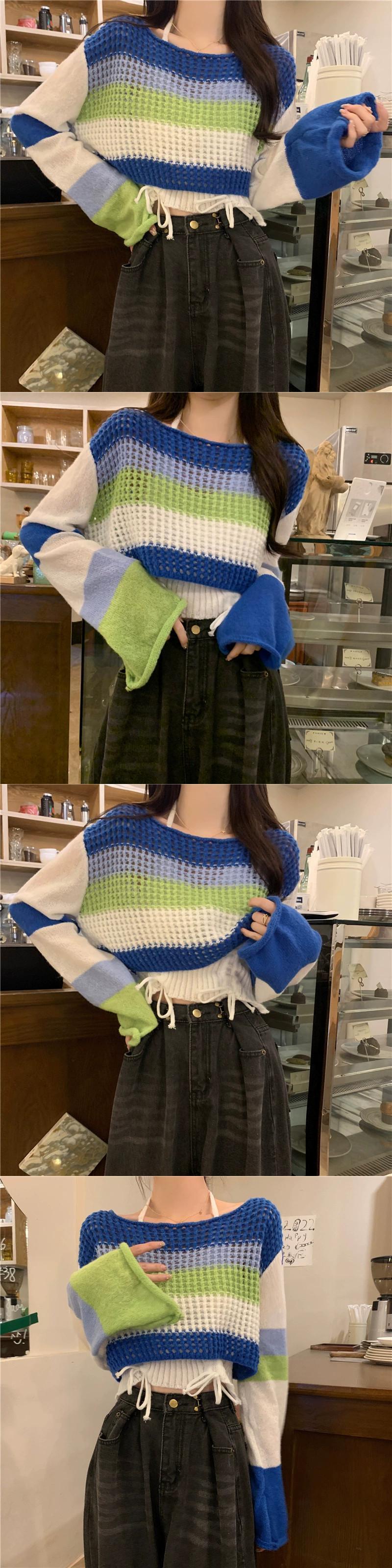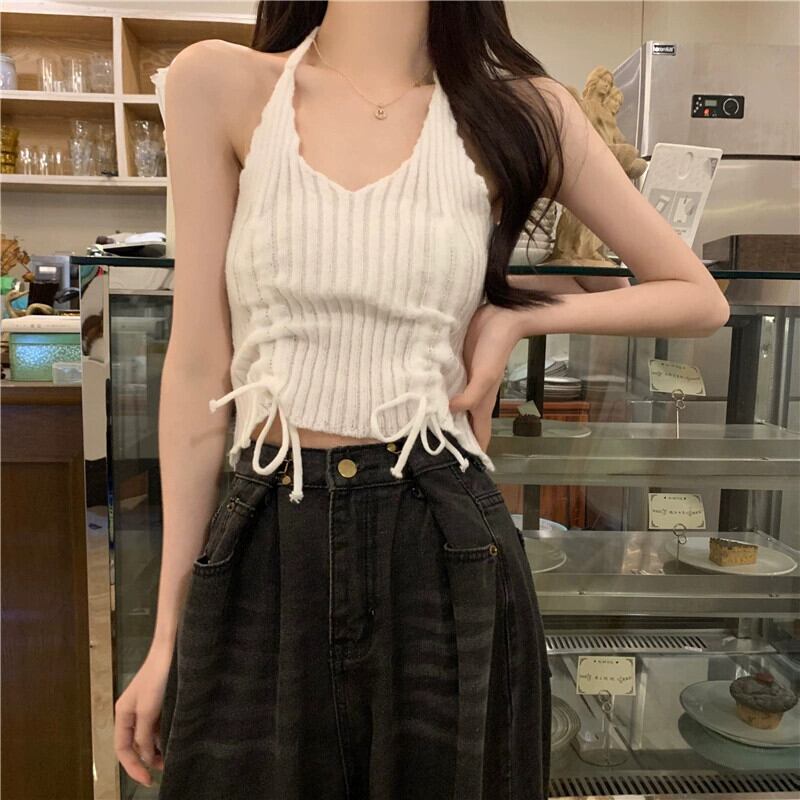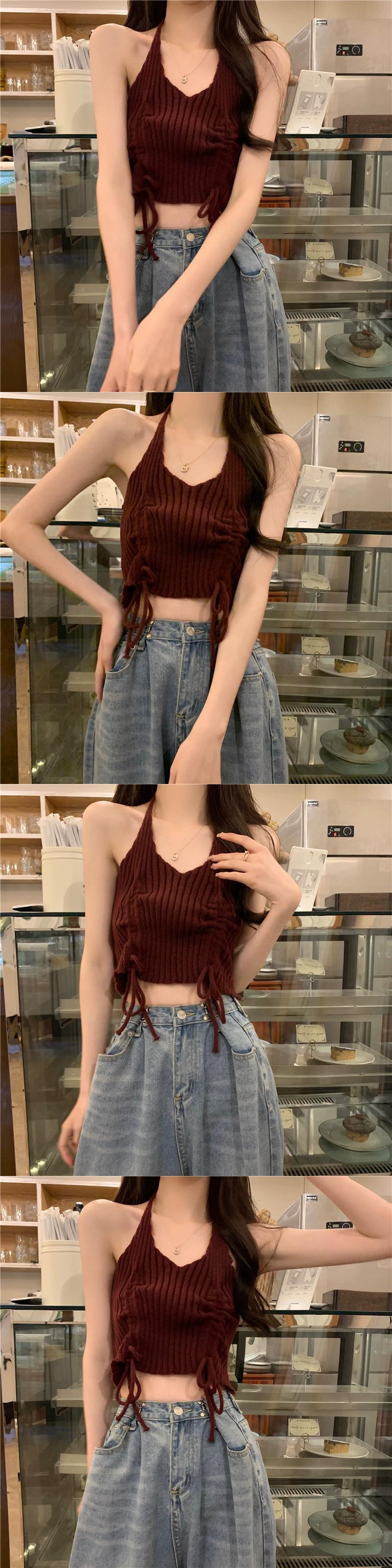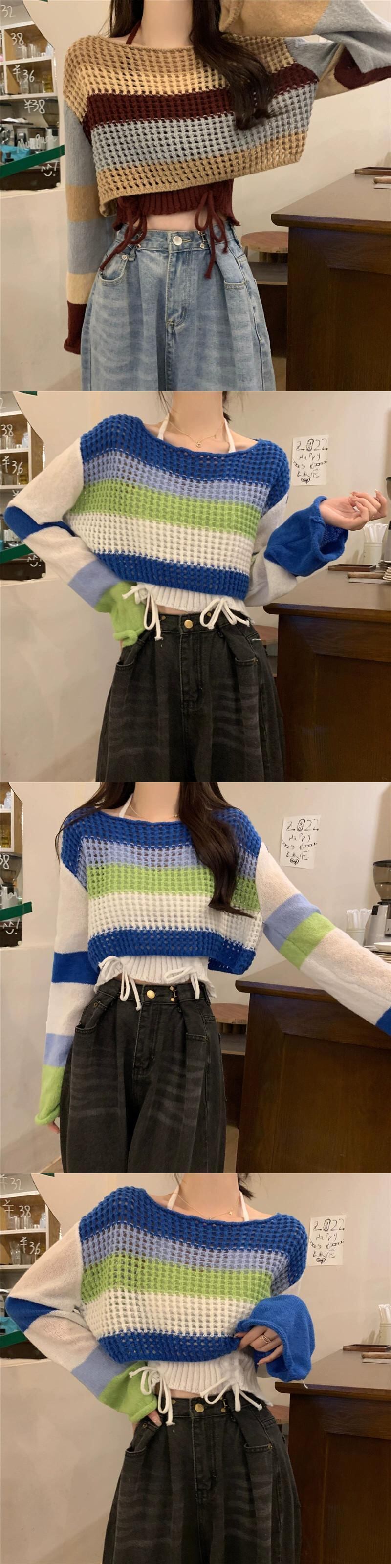 中空ストライプニットセーターレディース秋冬レトロルーズアウタープルオーバーショートホルターネックキャミソール2点セット オータム 秋物 ウィンター 冬物 7460076552358996 | framboise21