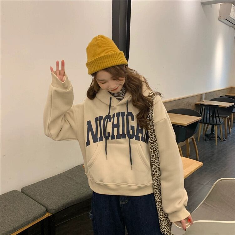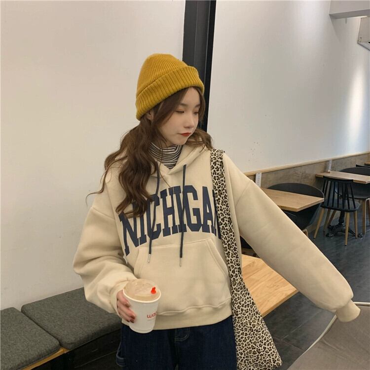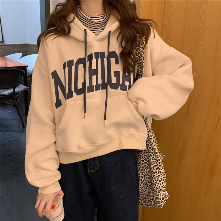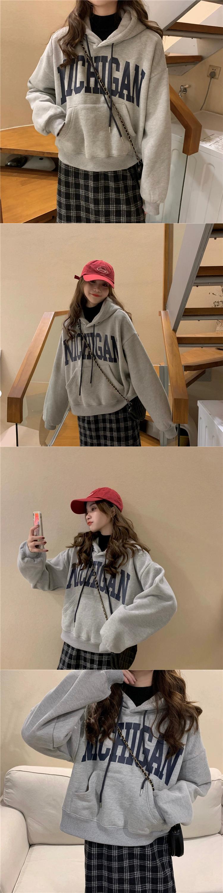 アメリカンスタイルのベルベットの厚みのあるフード付きスウェットシャツの女性、秋と冬のルーズでスリムで多用途のプリントショート長袖トップ小人 ロング オータム 秋物 ウィンター 冬物 7460012209912825 | framboise21