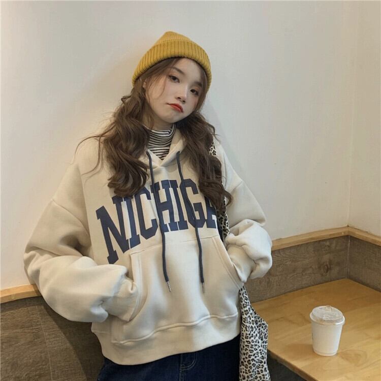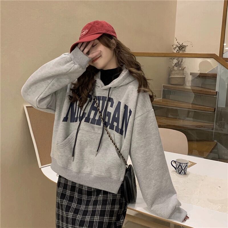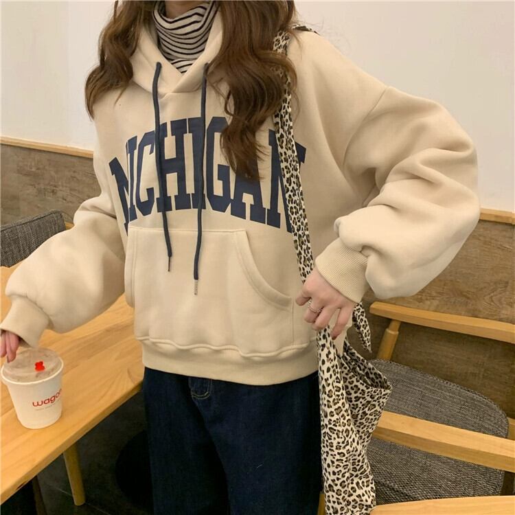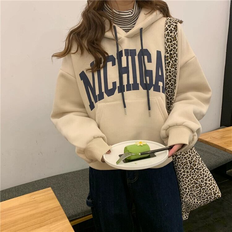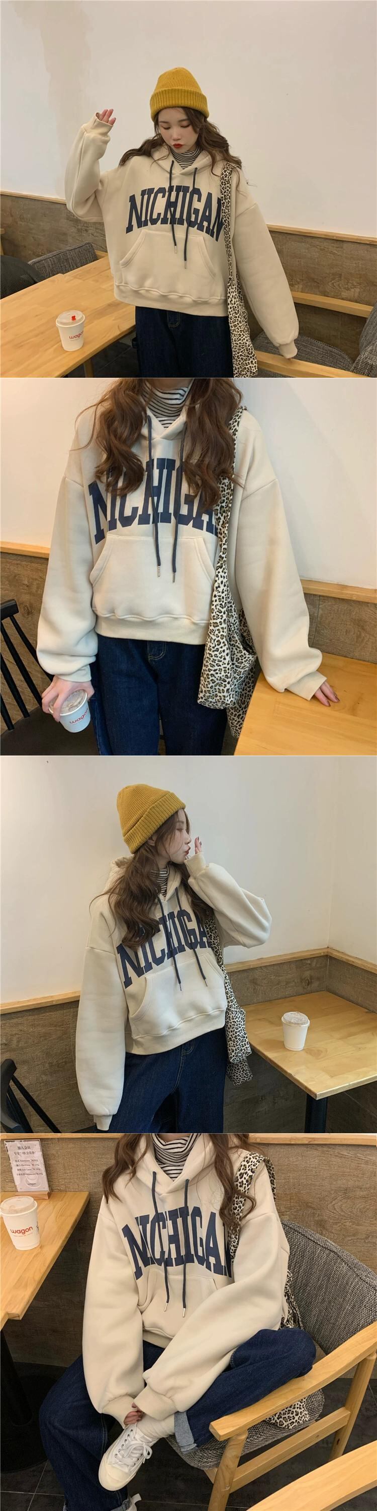 アメリカンスタイルのベルベットの厚みのあるフード付きスウェットシャツの女性、秋と冬のルーズでスリムで多用途のプリントショート長袖トップ小人 ロング オータム 秋物 ウィンター 冬物 7460012209912825 | framboise21