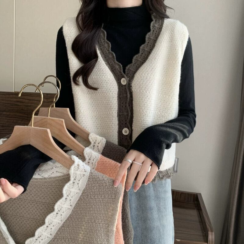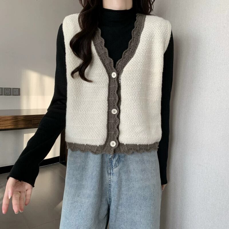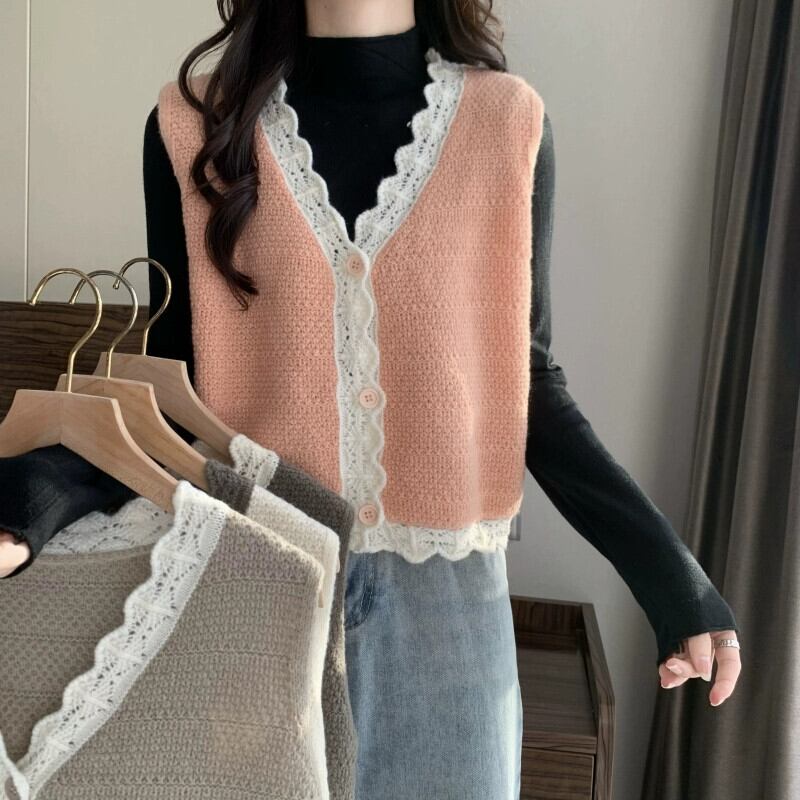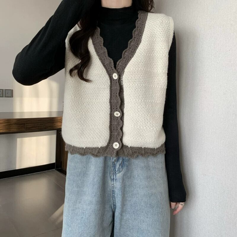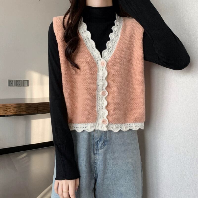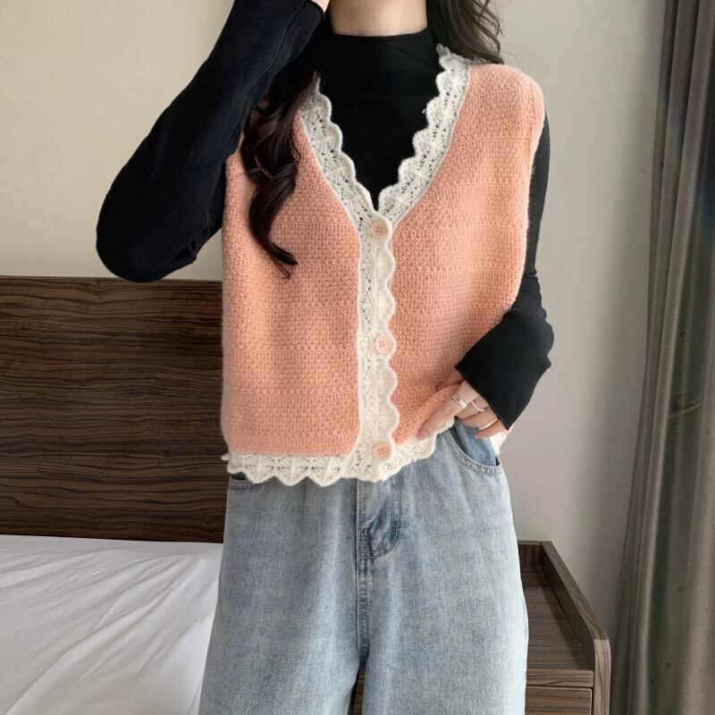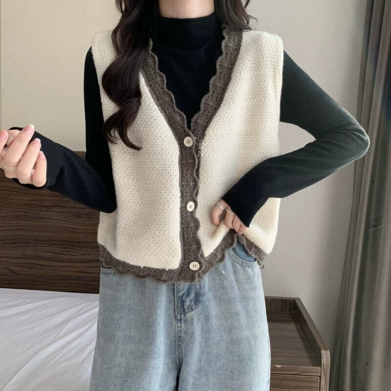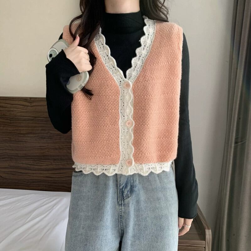 V ネック ニット ベスト レディース、秋冬スタイル、ルーズなアウター レイヤリング、ショート ノースリーブ カーディガン セーター ジャケット 半袖 ハーフスリーブ オータム 秋物 ウィンター 冬物 Vネック 7460045125288243 | framboise21