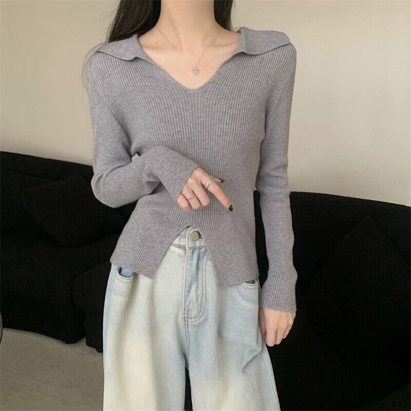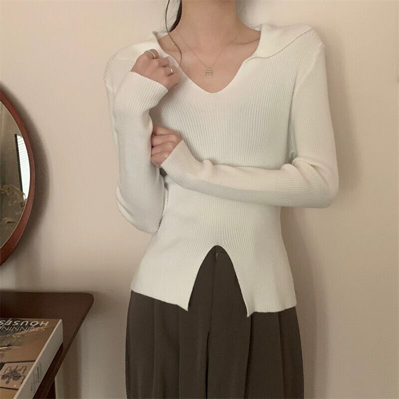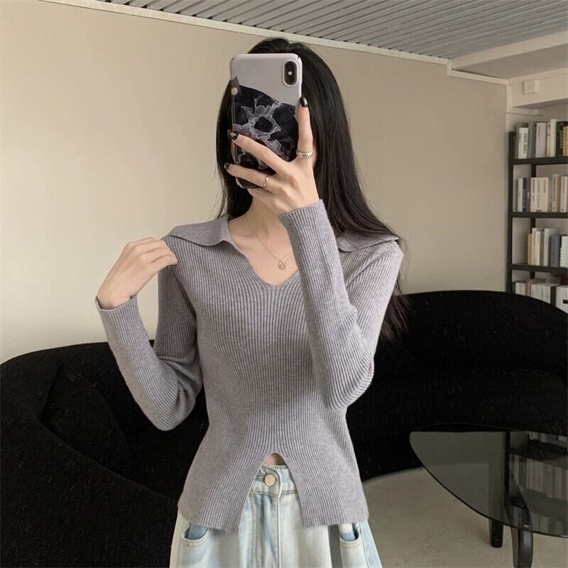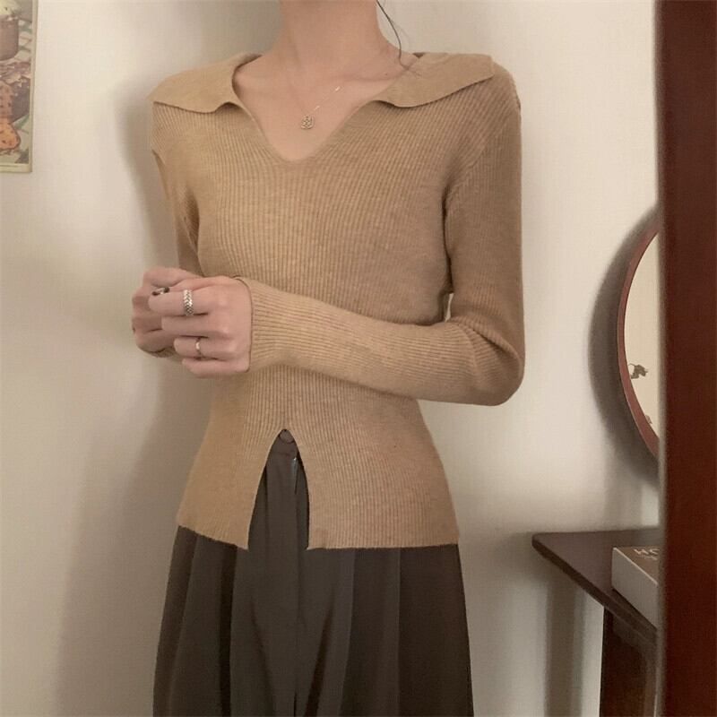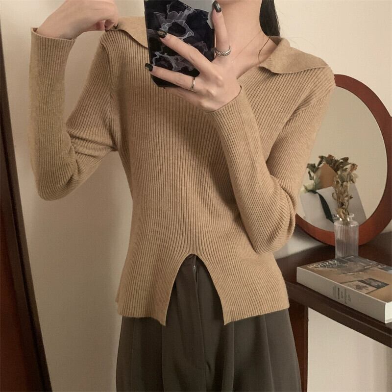 秋冬のポロカラーボトリングシャツレディース、ファッショナブルなインナースタイル、スリムでシックな不規則なショートスリット長袖ニットセーター ロング オータム 秋物 ウィンター 冬物 7460017666402792 | framboise21