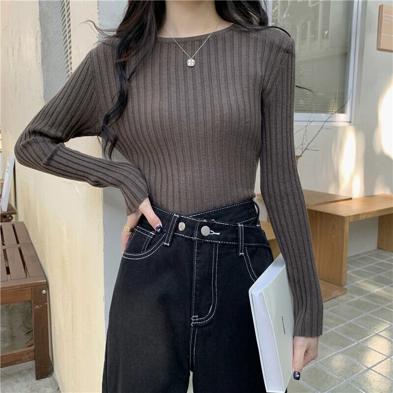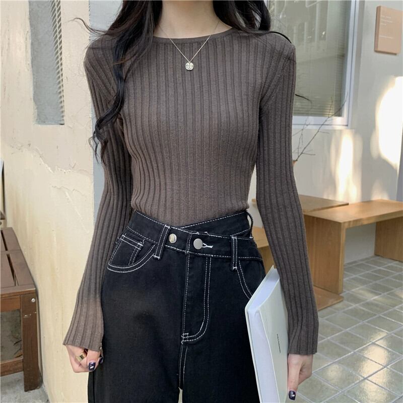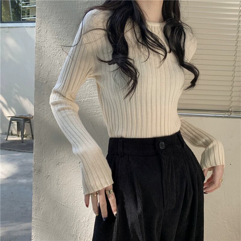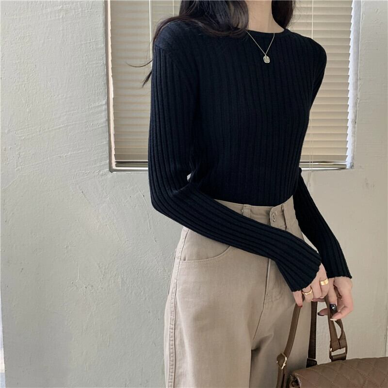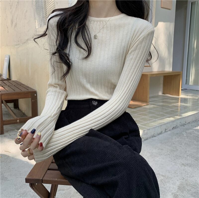 秋と冬のアプリコットのショートボトムシャツの女性、ピットストライプの長袖セーターが付いた西洋スタイルのスリムなラウンドネックセーター ロング オータム 秋物 ウィンター 冬物 Oネック 746002761054632 | framboise21