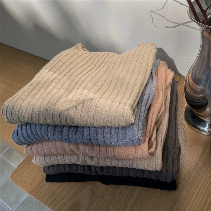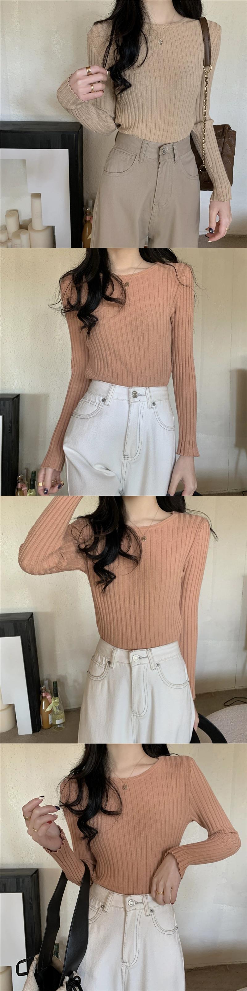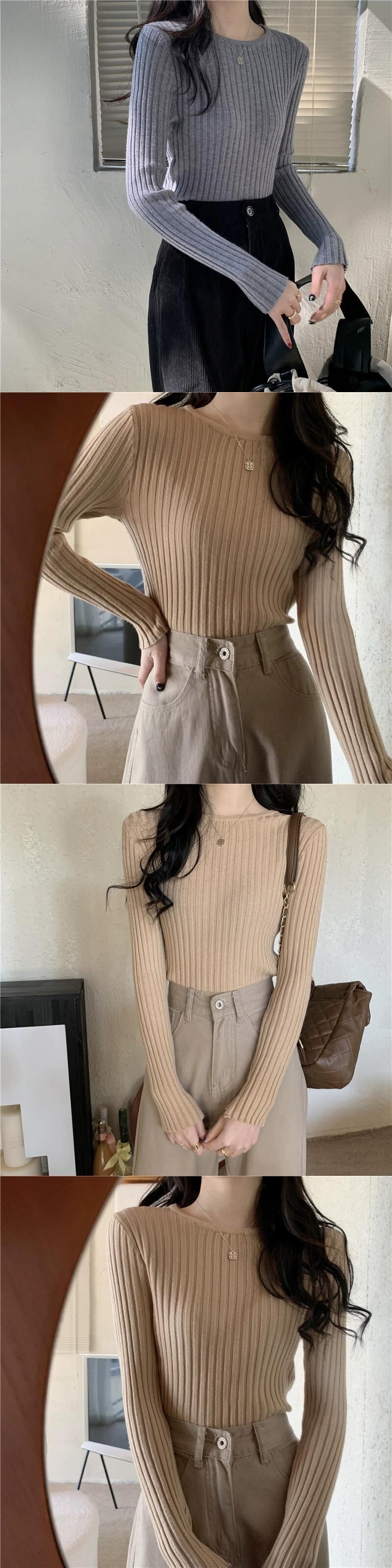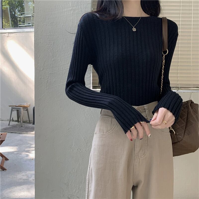 秋と冬のアプリコットのショートボトムシャツの女性、ピットストライプの長袖セーターが付いた西洋スタイルのスリムなラウンドネックセーター ロング オータム 秋物 ウィンター 冬物 Oネック 746002761054632 | framboise21