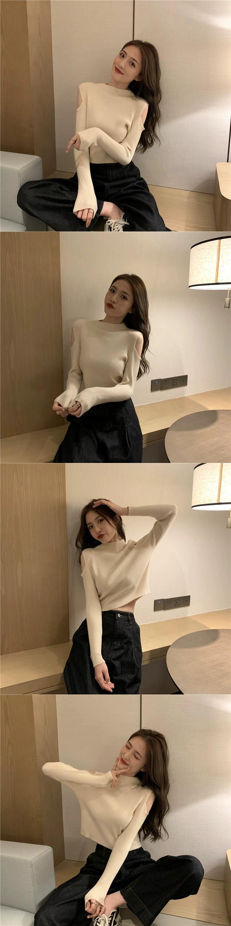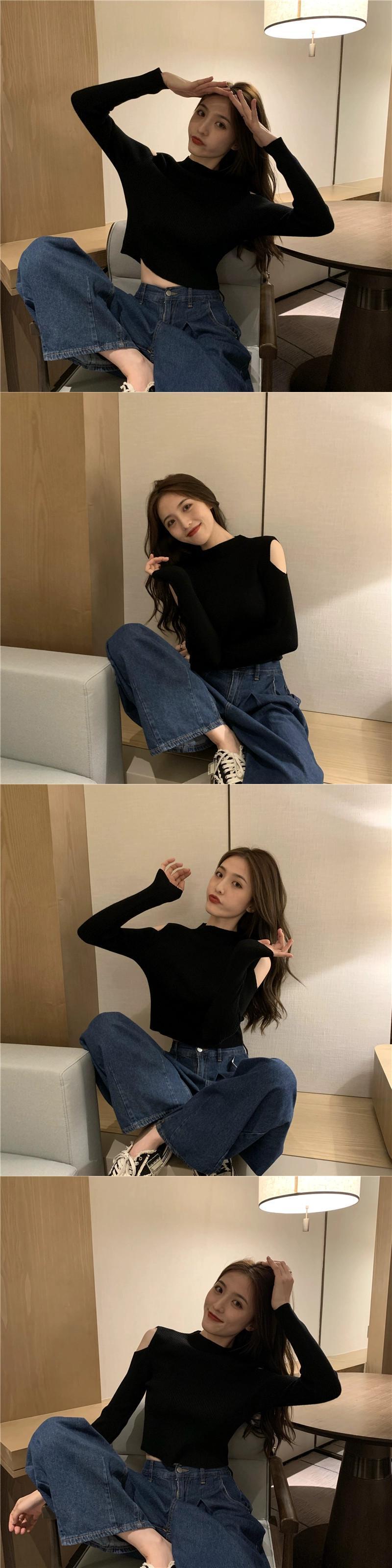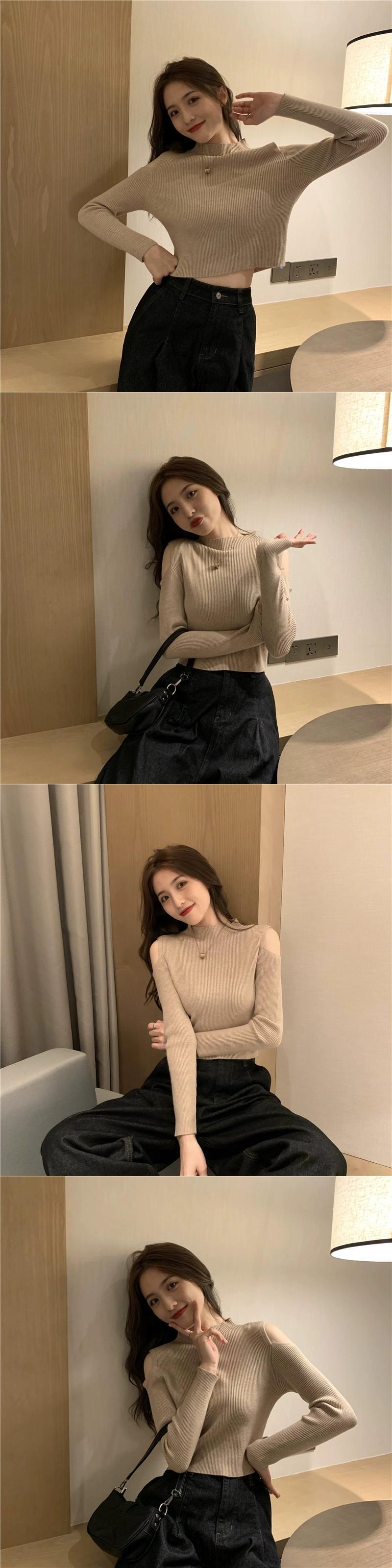 ハーフタートルネックニットボトムシャツレディース、秋冬スタイル、スリムフィットミッドカラーセーター、控えめなオフショルダー長袖トップ ロング オータム 秋物 ウィンター 冬物 7460089014415336 | framboise21