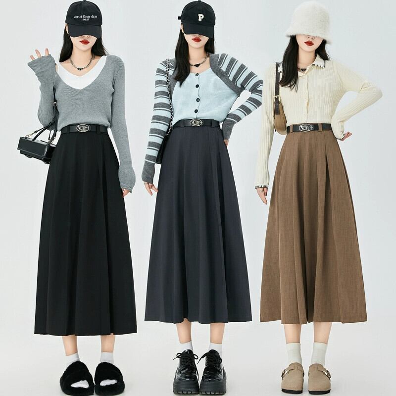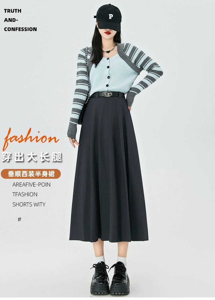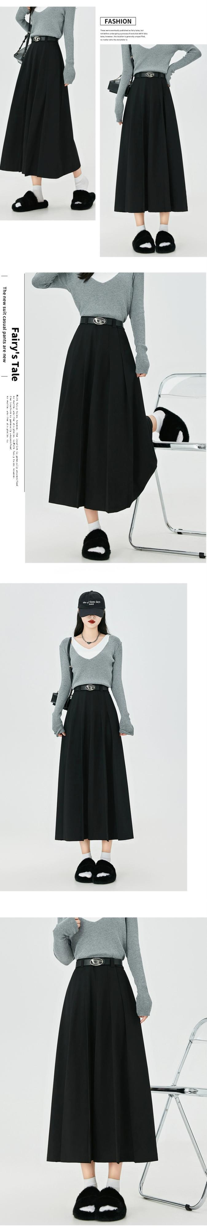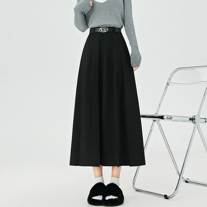 黒のAラインスーツスカートレディース、秋冬のハイエンドデザイン、スリムでドレープのあるミッドレングスのハイウエストプリーツスカート ブラック オータム 秋物 ウィンター 冬物 7460039964901500 | framboise21