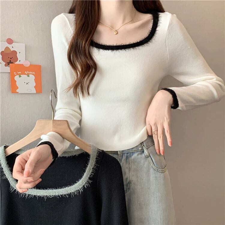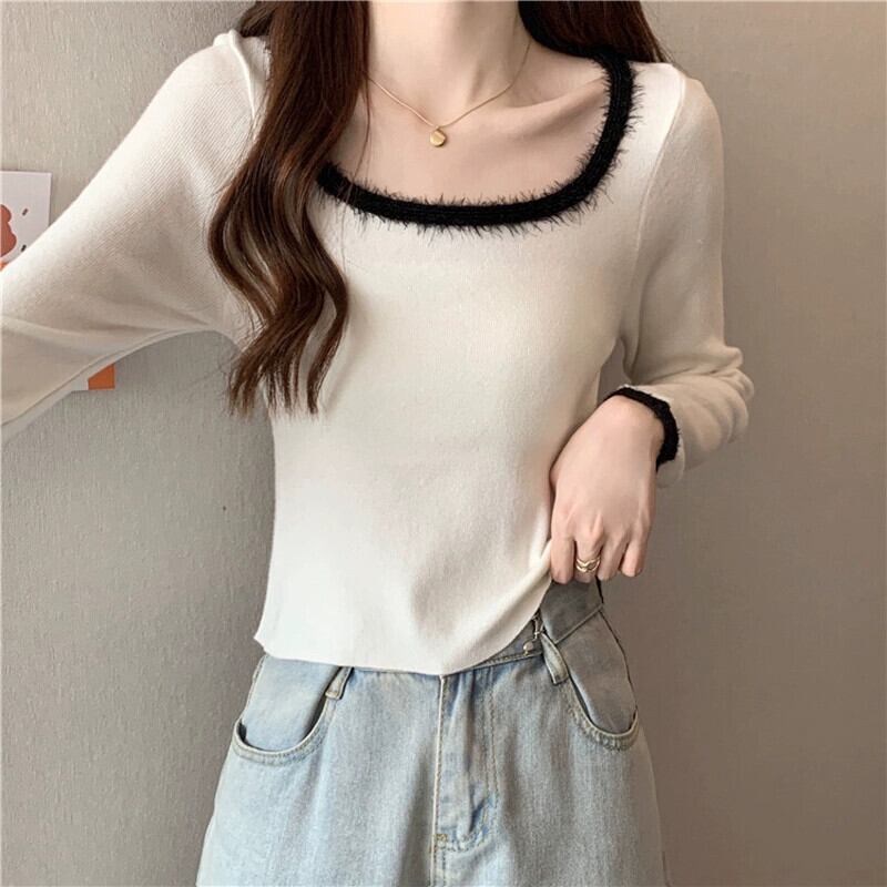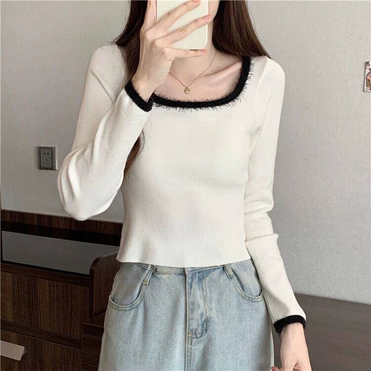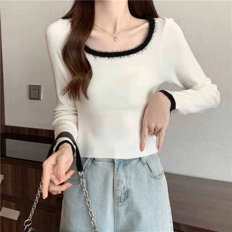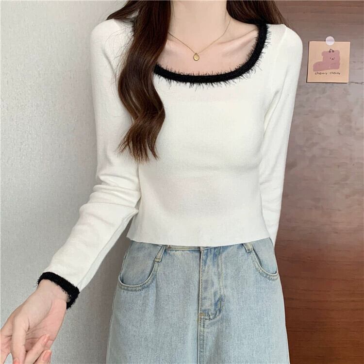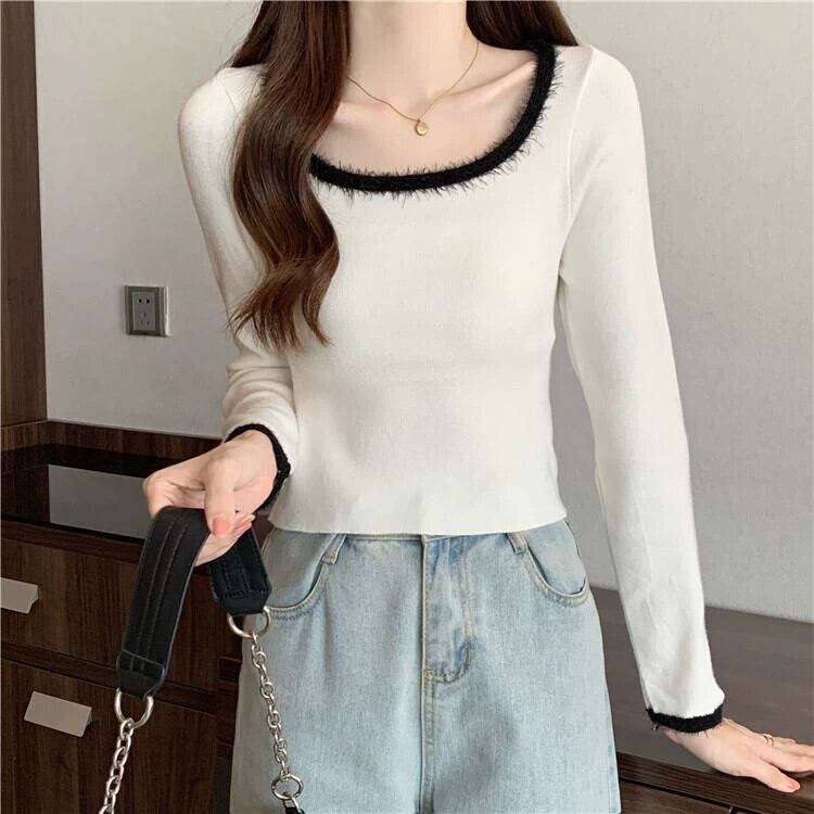 白いスクエアネックボトリングシャツ女性の秋冬 2023 新しいスタイルファッショナブルでスリムフィットショートニット長袖トップ ロング ホワイト オータム 秋物 ウィンター 冬物 スクウェア 7460020482838403 | framboise21