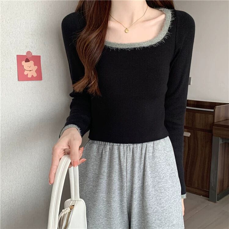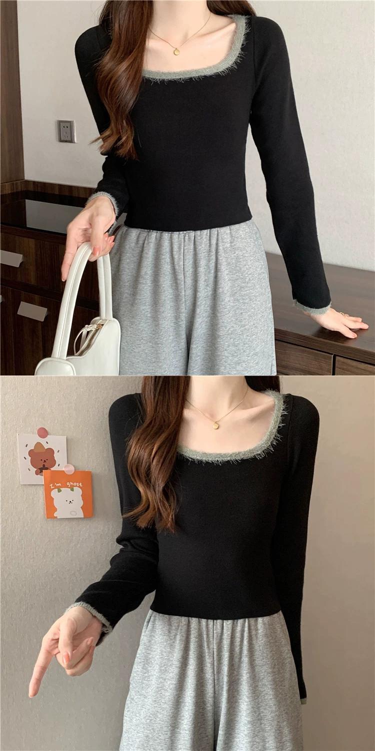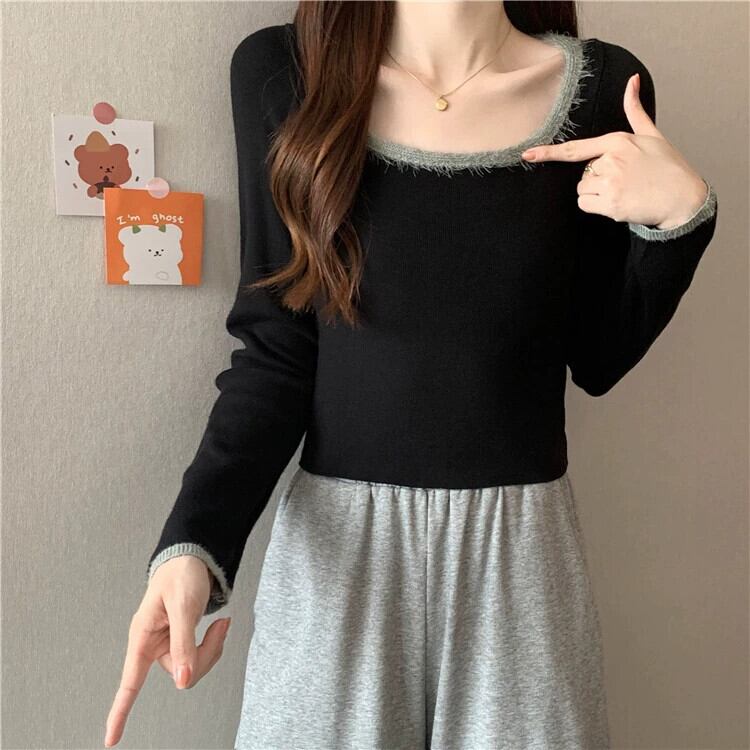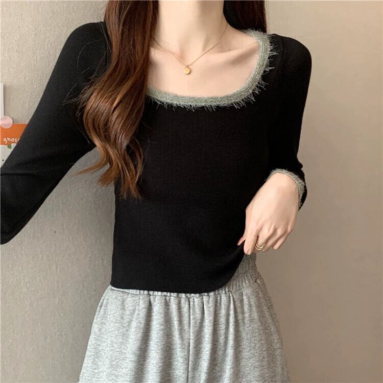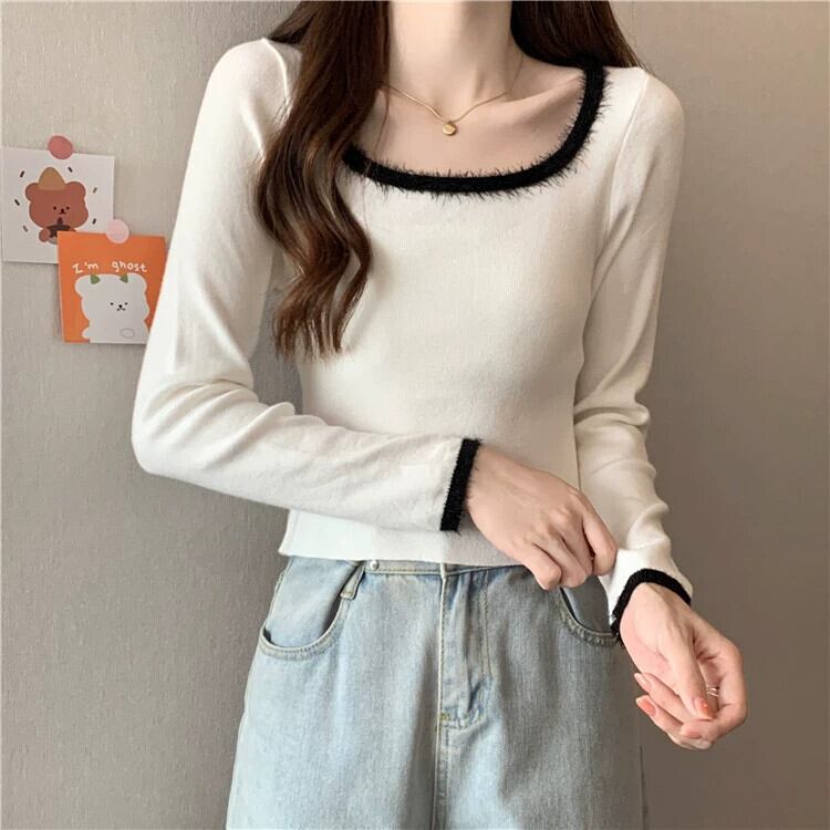 白いスクエアネックボトリングシャツ女性の秋冬 2023 新しいスタイルファッショナブルでスリムフィットショートニット長袖トップ ロング ホワイト オータム 秋物 ウィンター 冬物 スクウェア 7460020482838403 | framboise21