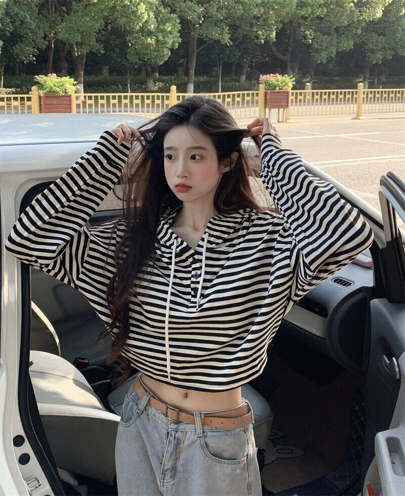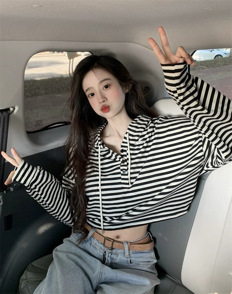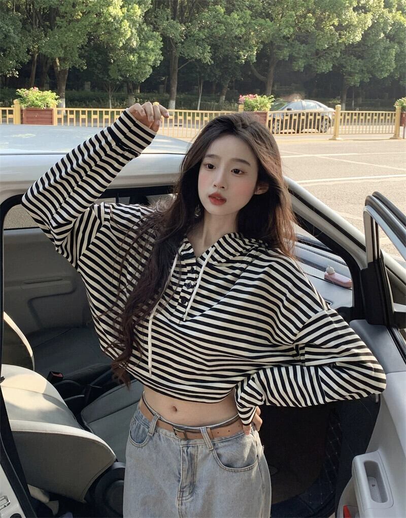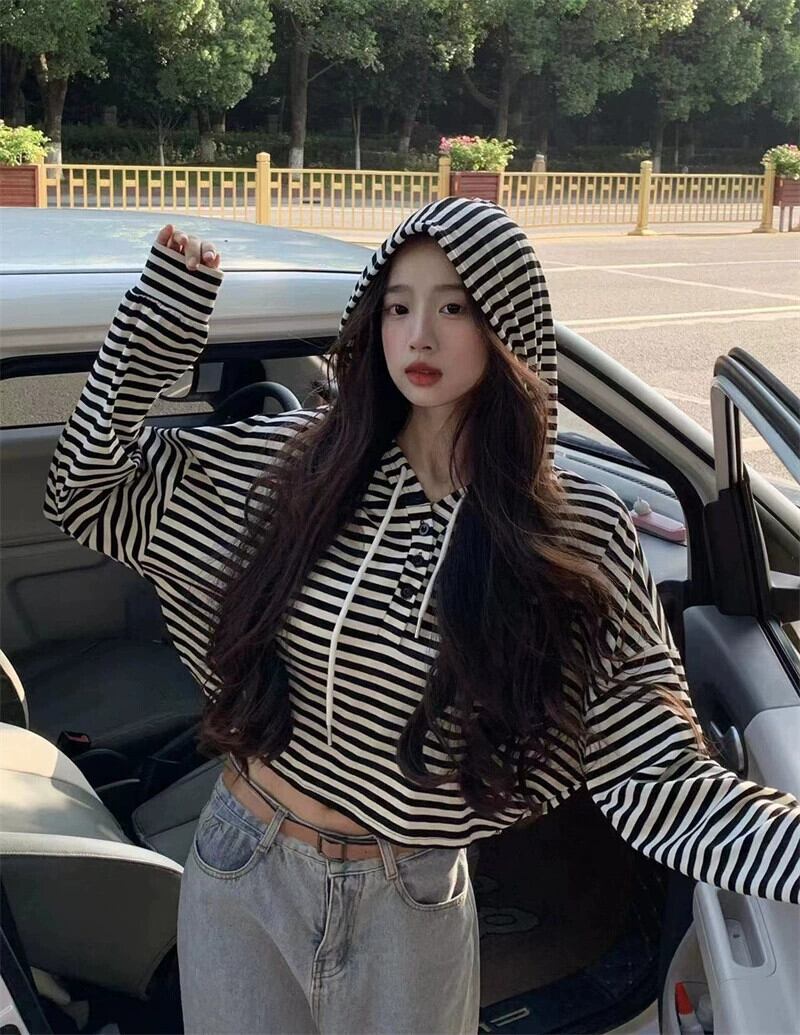 黒と白のストライプのフード付きスウェットシャツの女性の 2023 春と秋の新デザインルーズでスリムな多用途プルオーバー長袖トップ ロング ホワイト ブラック スプリング 春物 オータム 秋物 7460048210740403 | framboise21