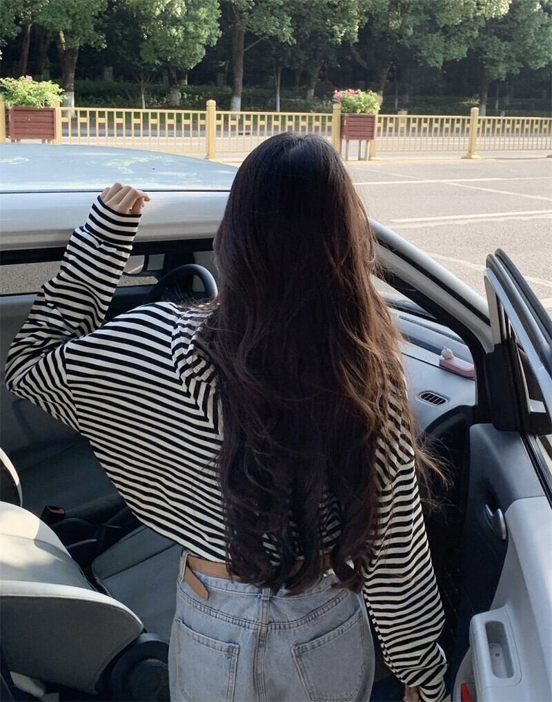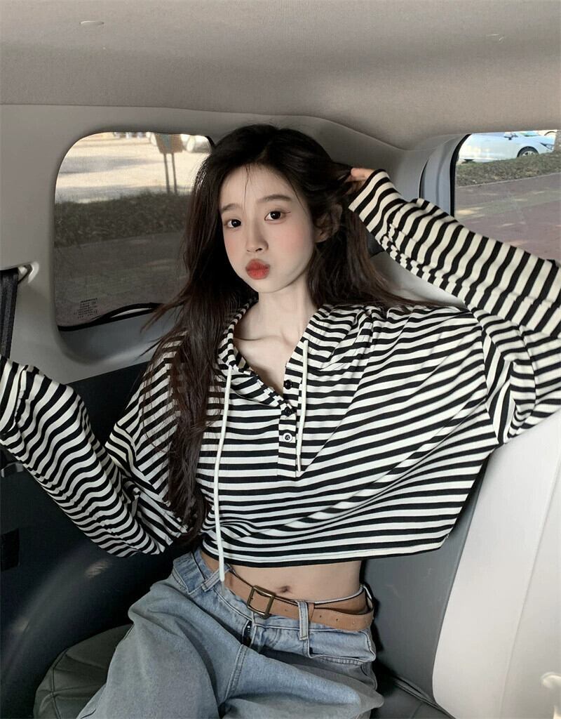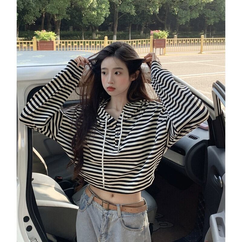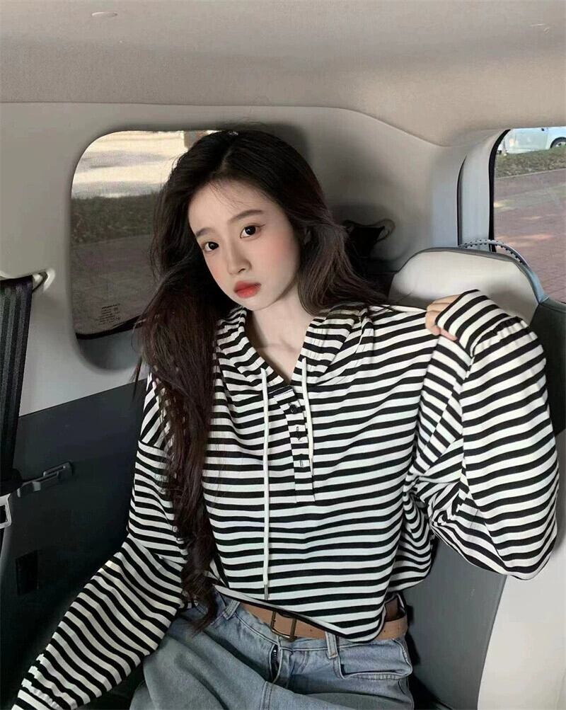 黒と白のストライプのフード付きスウェットシャツの女性の 2023 春と秋の新デザインルーズでスリムな多用途プルオーバー長袖トップ ロング ホワイト ブラック スプリング 春物 オータム 秋物 7460048210740403 | framboise21