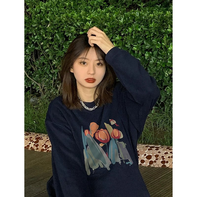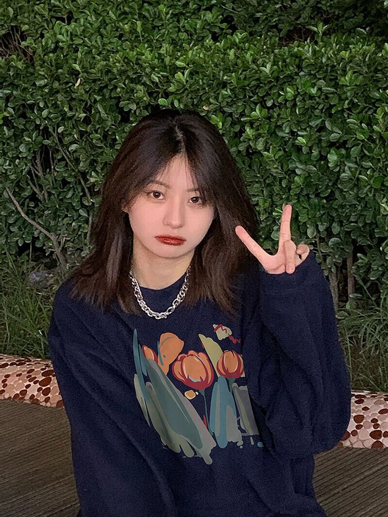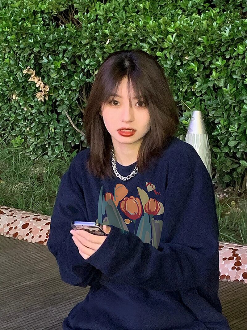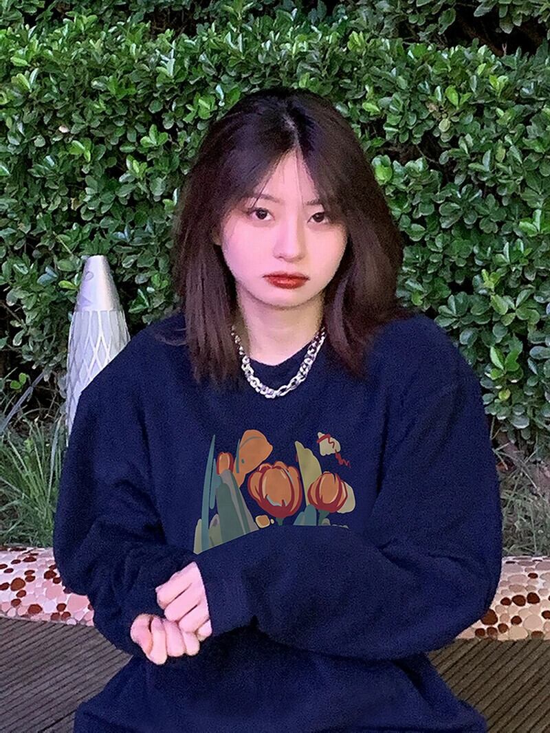 インクプリントのラウンドネックスウェットシャツの女性、春と秋のデザイン、怠惰なスタイル、ルーズなミッドレングスのフード付きジャケット、トレンディなイン スプリング 春物 オータム 秋物 Oネック 7460022324034011 | framboise21