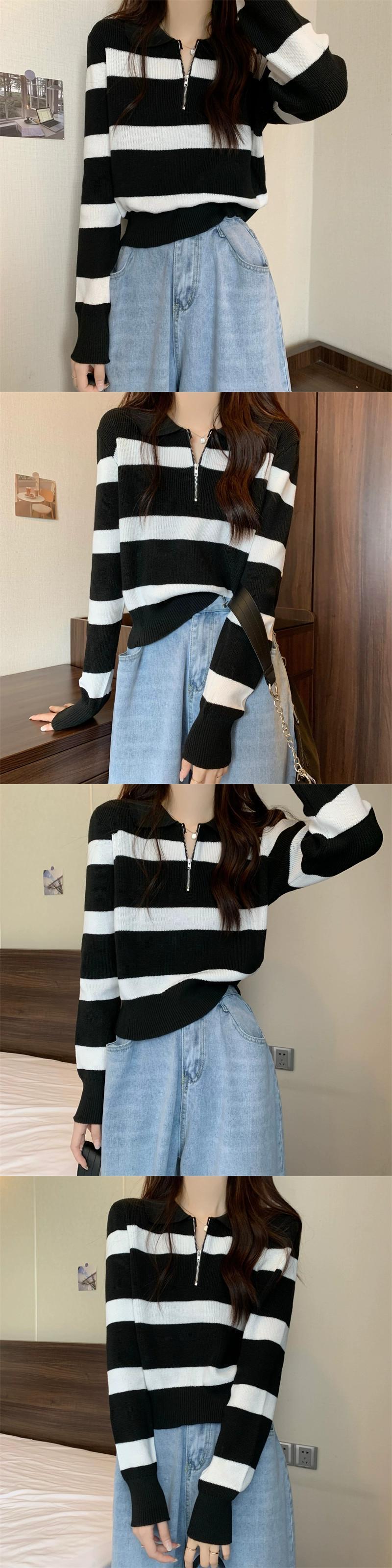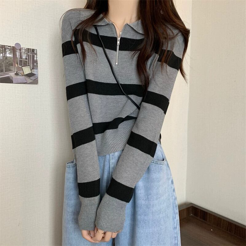 ストライプショートボトムシャツレディース、秋冬フレンチファッション、ルーズインナーハーフジップポロカラーニットセーター オータム 秋物 ウィンター 冬物 7460015232797356 | framboise21