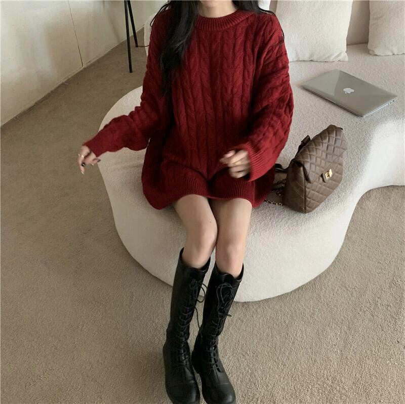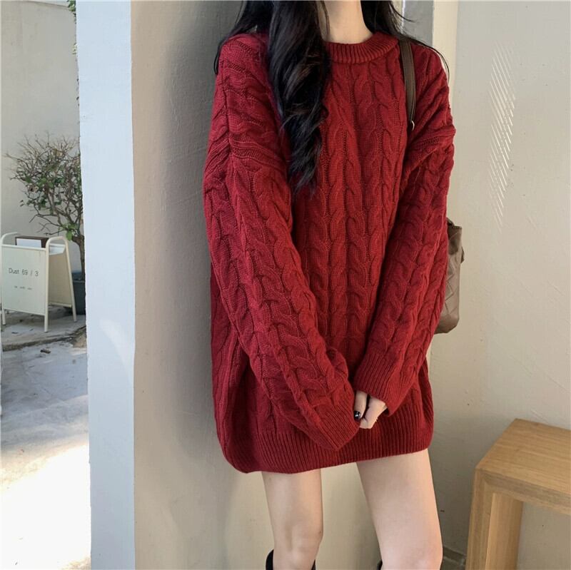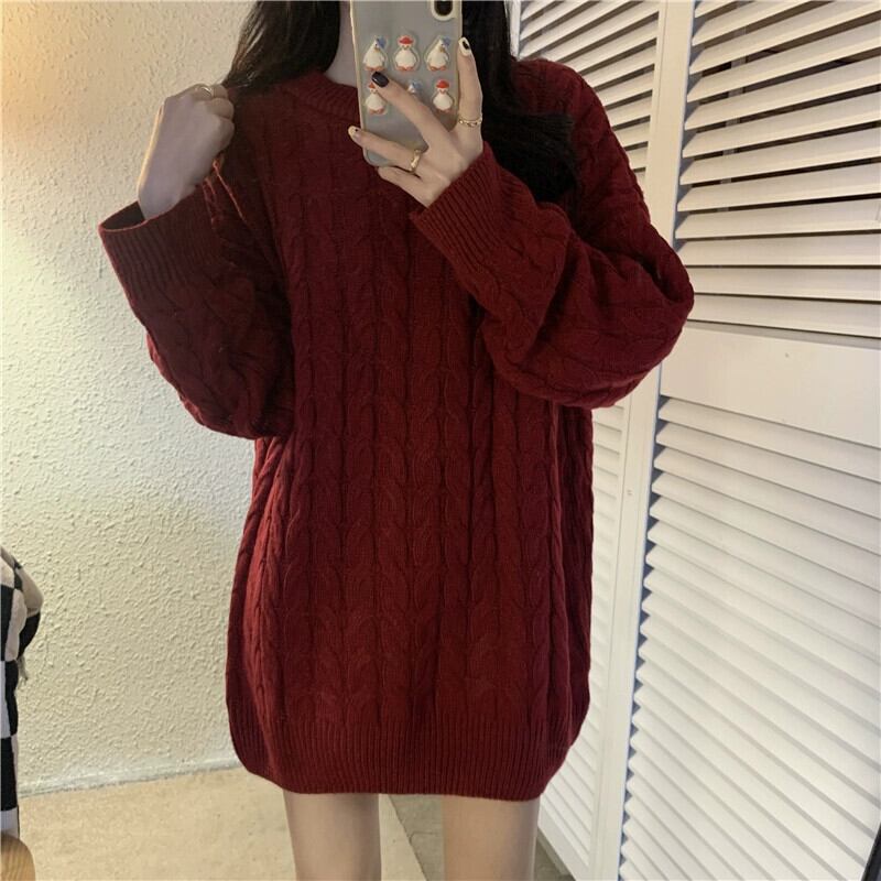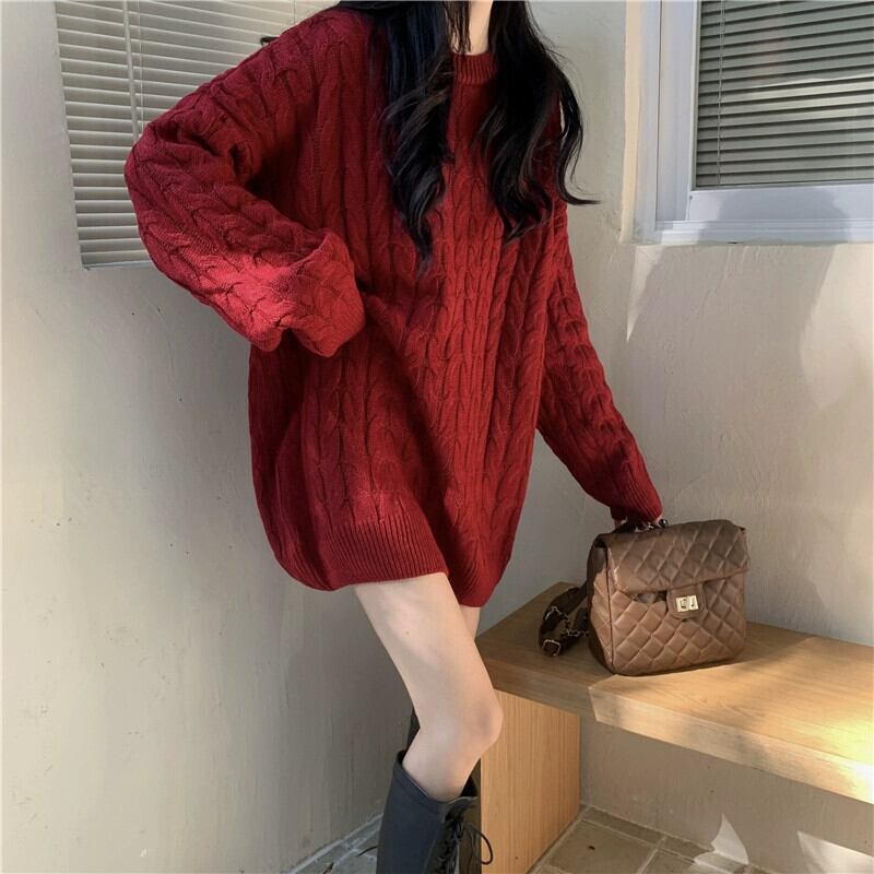 バーガンディのミッドレングスのツイストセーターの女性、秋と冬のレトロなルーズなアウターウェア、怠惰なスタイルのプルオーバー、厚いニットジャケット オータム 秋物 ウィンター 冬物 7460076263357288 | framboise21