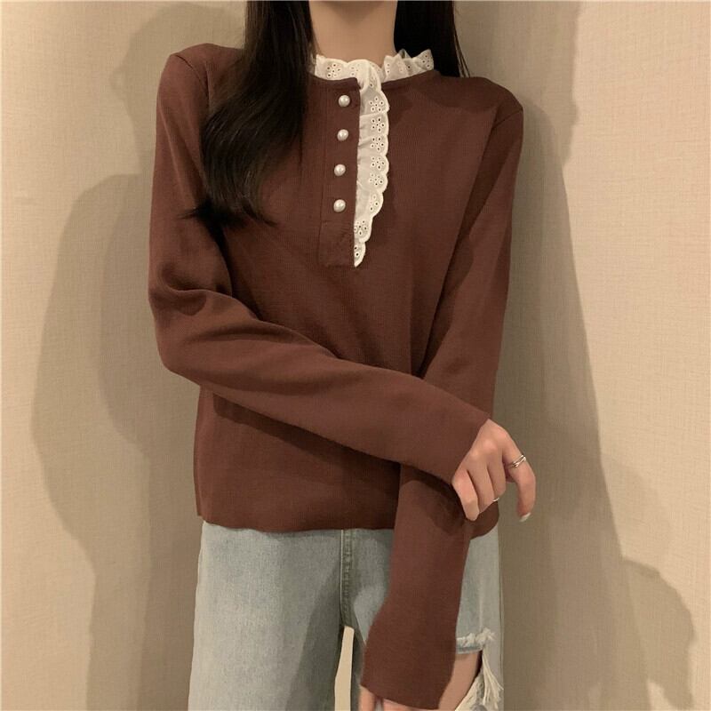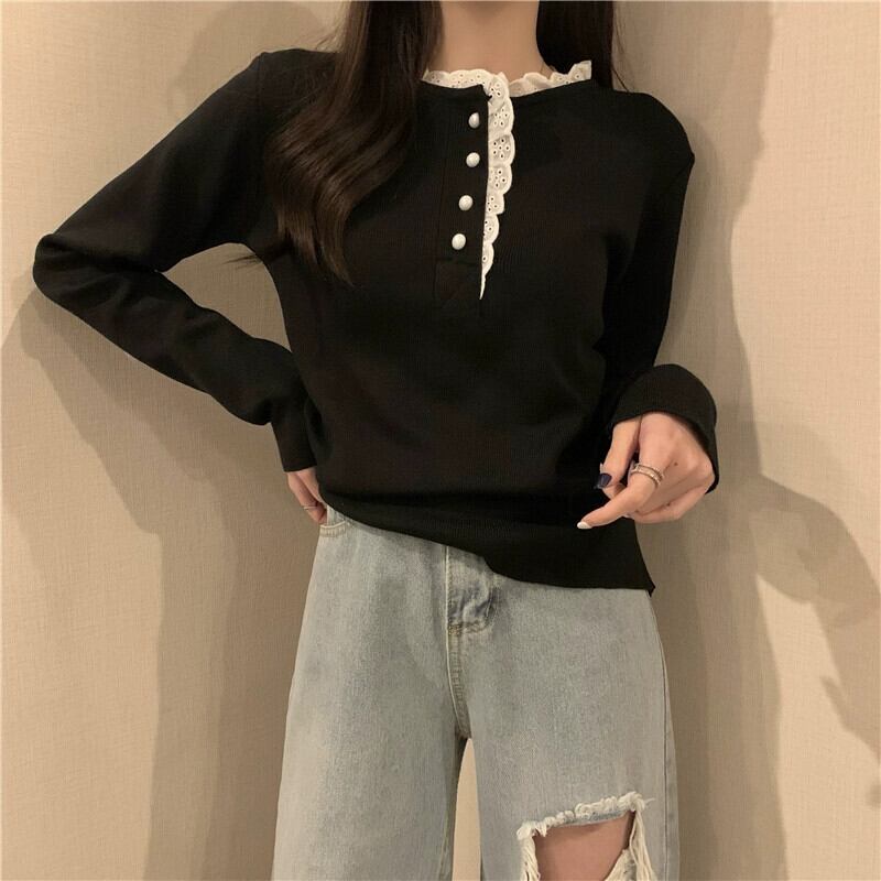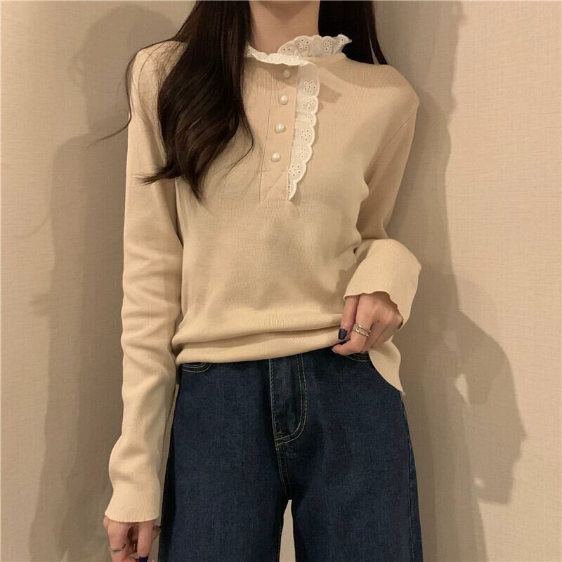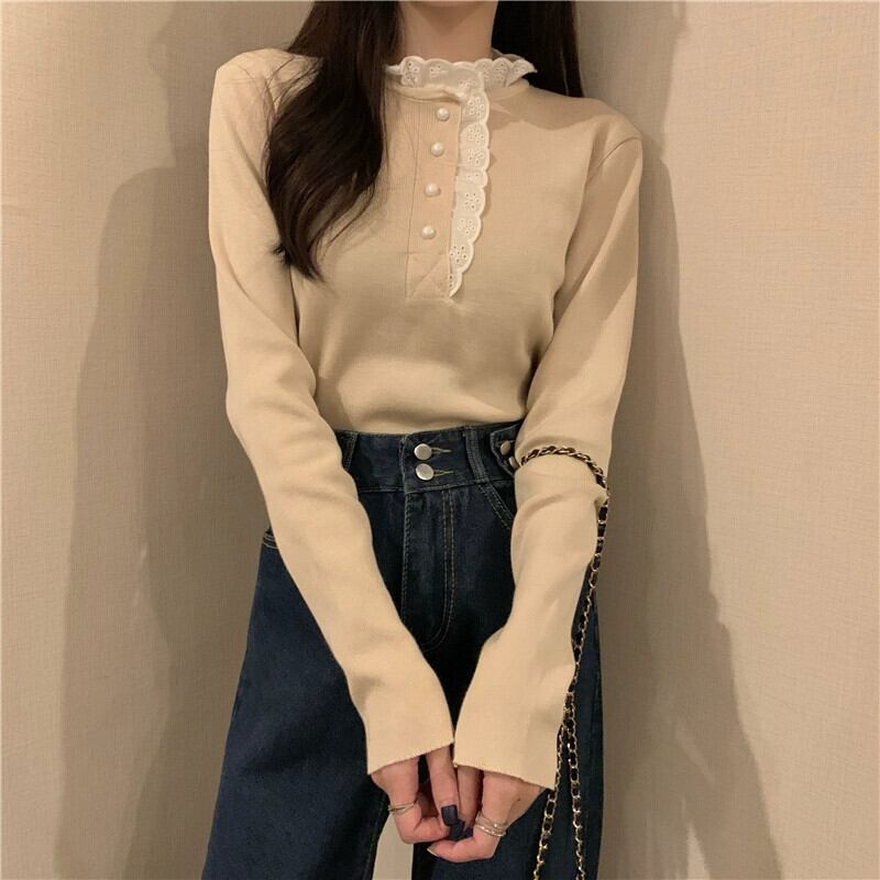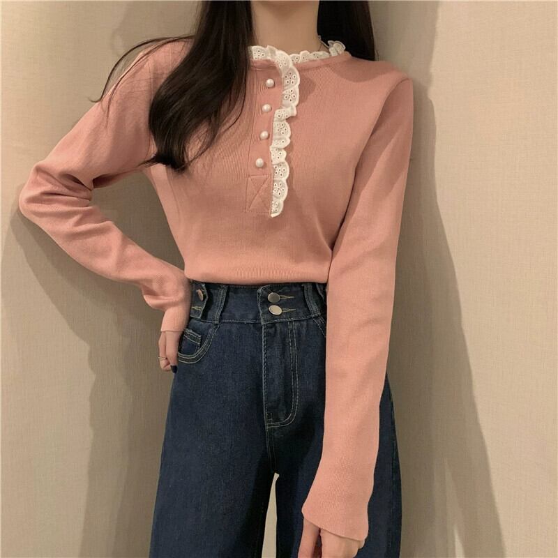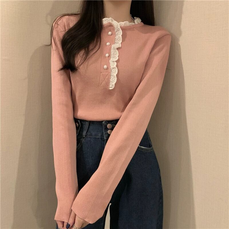 ピンクニット底シャツ女性の秋と冬 2023 新しいフランスのファッションスリムフィットインナーパッチワークレースラウンドネックセーター オータム 秋物 ウィンター 冬物 Oネック 7460015588412697 | framboise21
