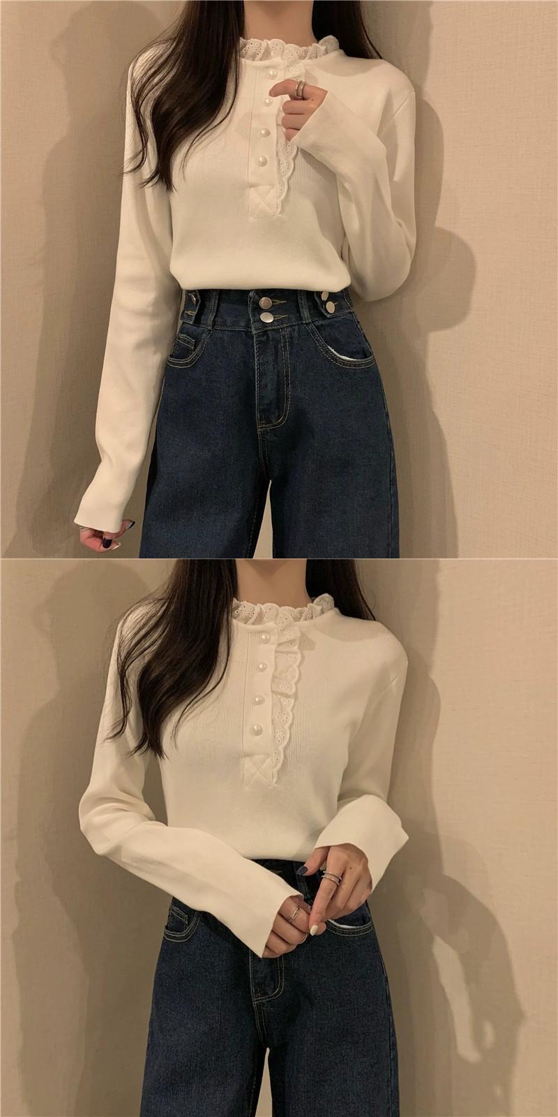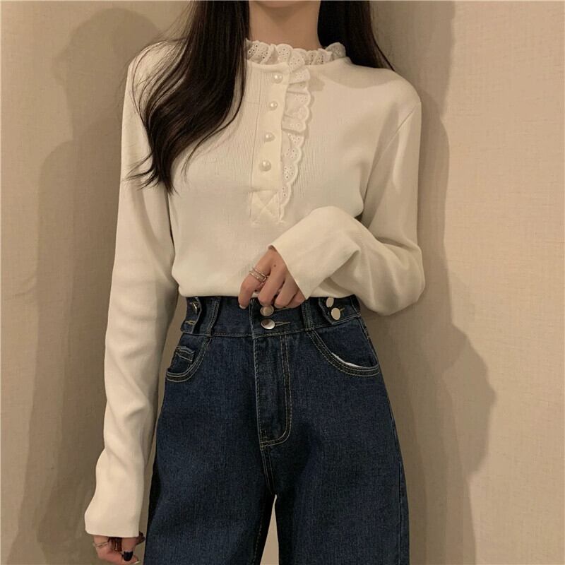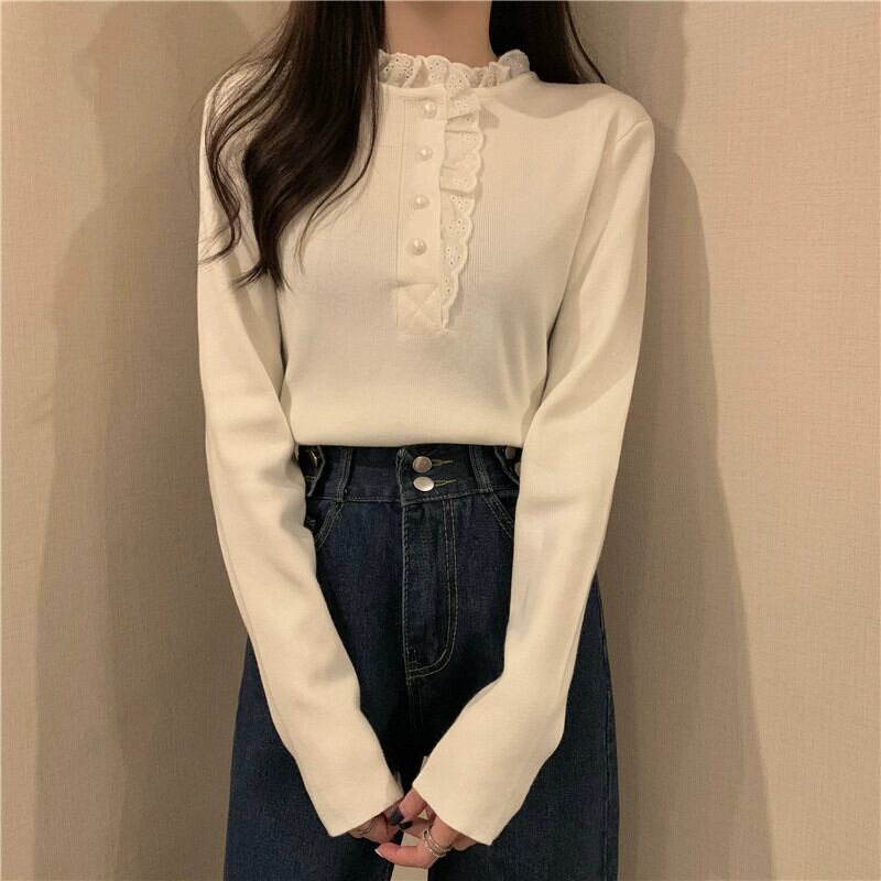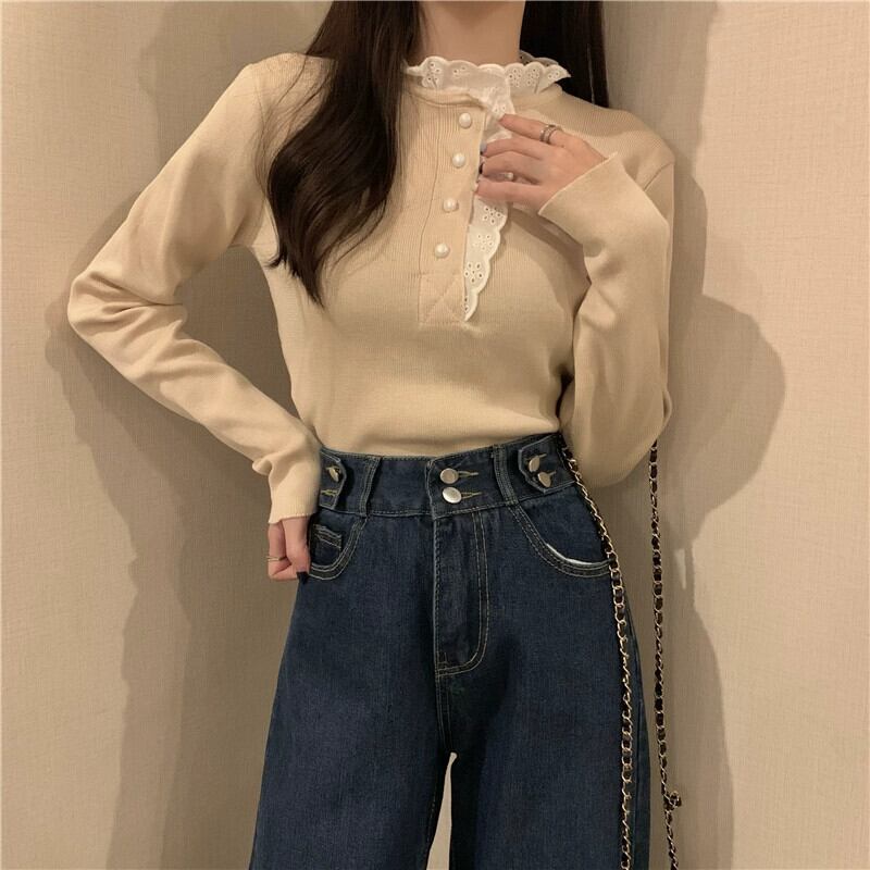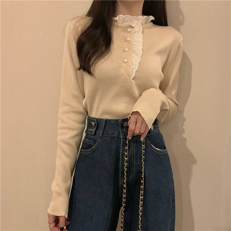 ピンクニット底シャツ女性の秋と冬 2023 新しいフランスのファッションスリムフィットインナーパッチワークレースラウンドネックセーター オータム 秋物 ウィンター 冬物 Oネック 7460015588412697 | framboise21