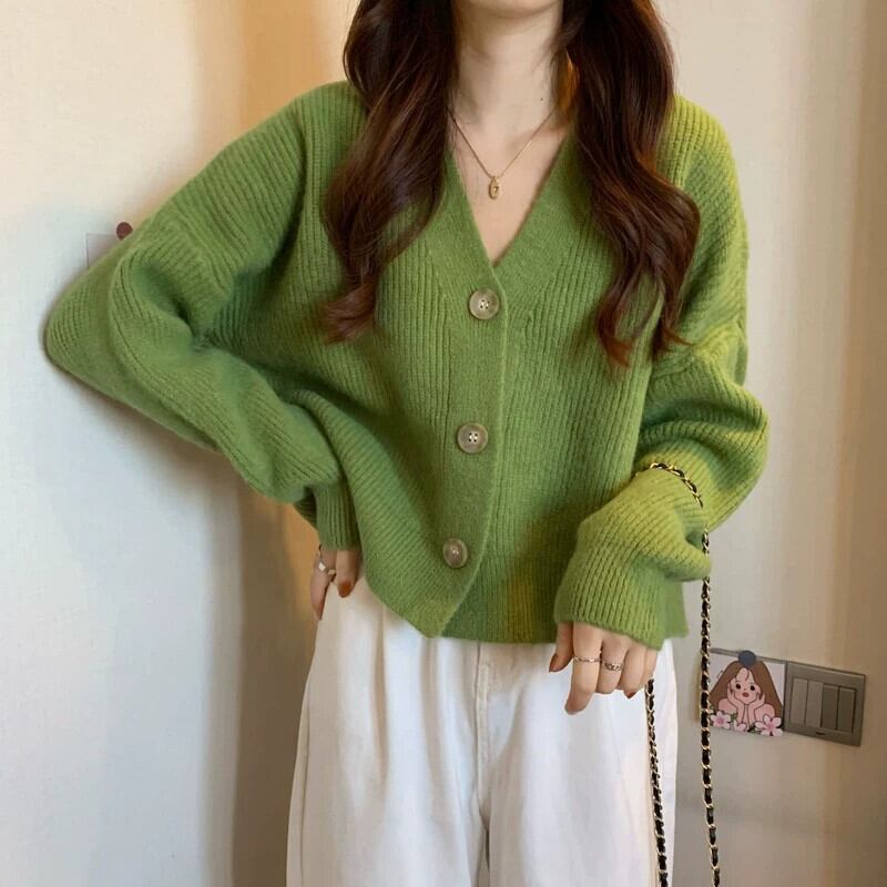 緑の短い太いラインカーディガンセータージャケット女性秋と冬のレトロなルーズアウターウェア怠惰な肥厚vネックセーター ショート オータム 秋物 ウィンター 冬物 グリーン 7460043003954281 | framboise21
