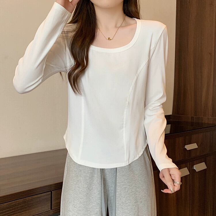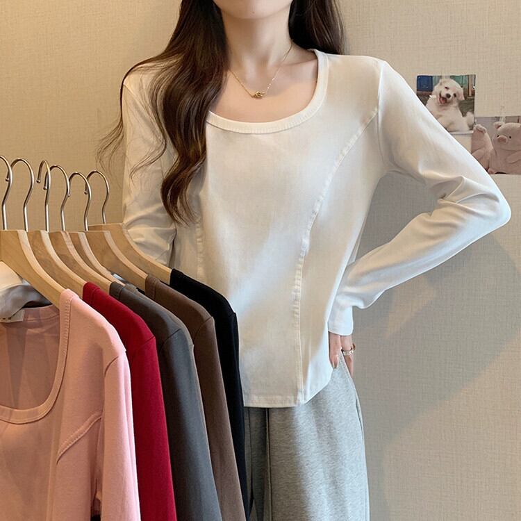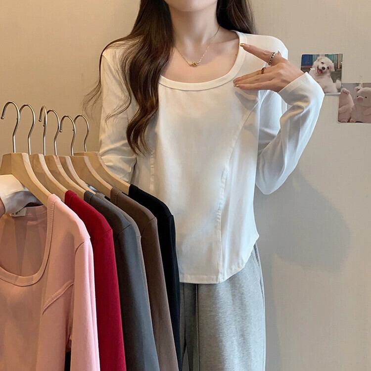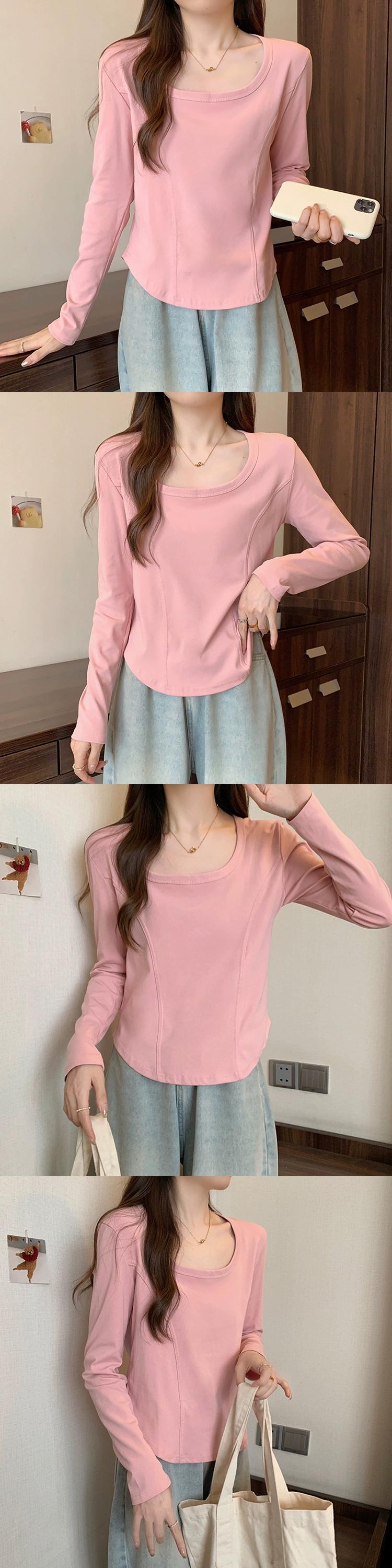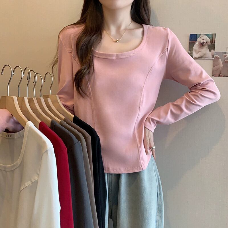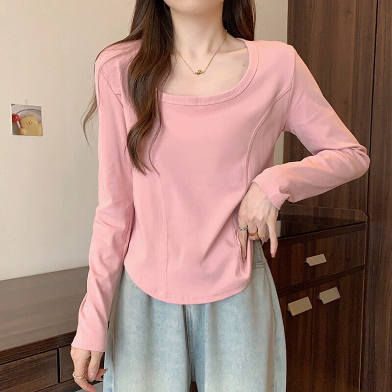 不規則なボトリングシャツ女性の 2023 春と秋の新しいルーズ、ファッショナブルでスリムなショートスクエアネック長袖 T シャツピンク ロング スプリング 春物 オータム 秋物 Tシャツ スクウェア 7460081374775051 | framboise21