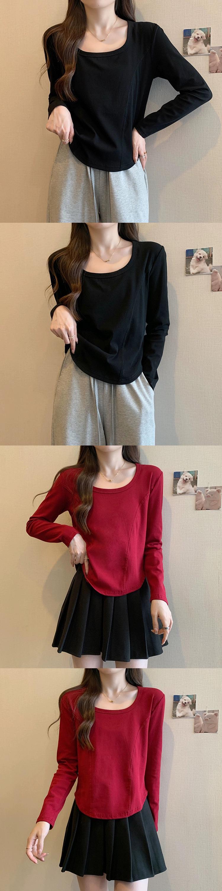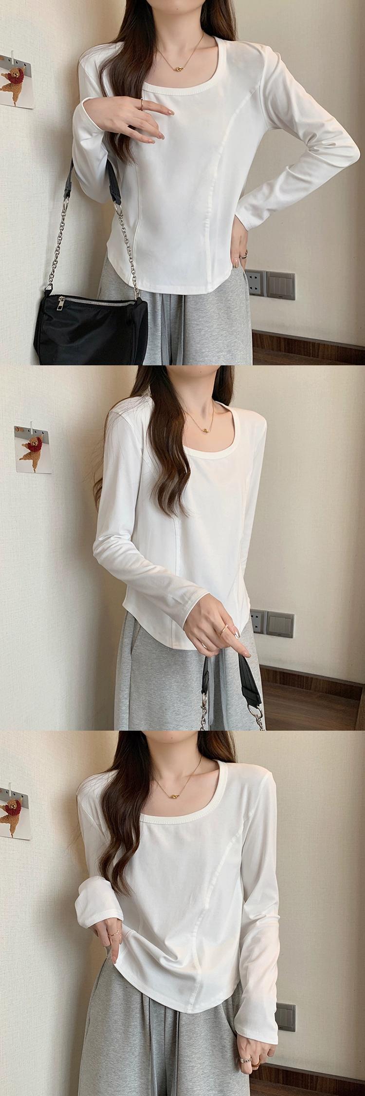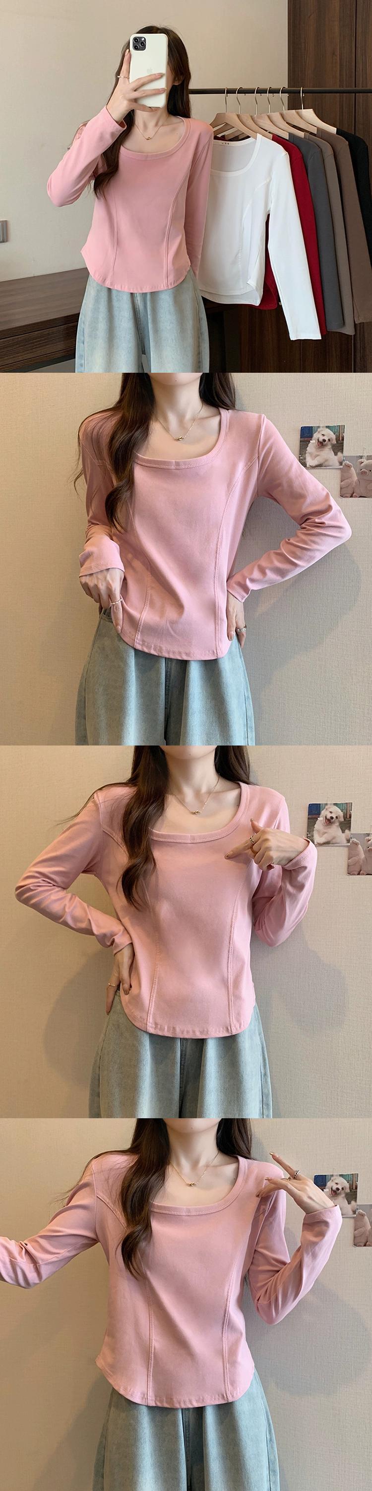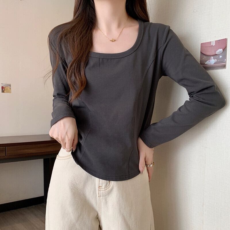 不規則なボトリングシャツ女性の 2023 春と秋の新しいルーズ、ファッショナブルでスリムなショートスクエアネック長袖 T シャツピンク ロング スプリング 春物 オータム 秋物 Tシャツ スクウェア 7460081374775051 | framboise21