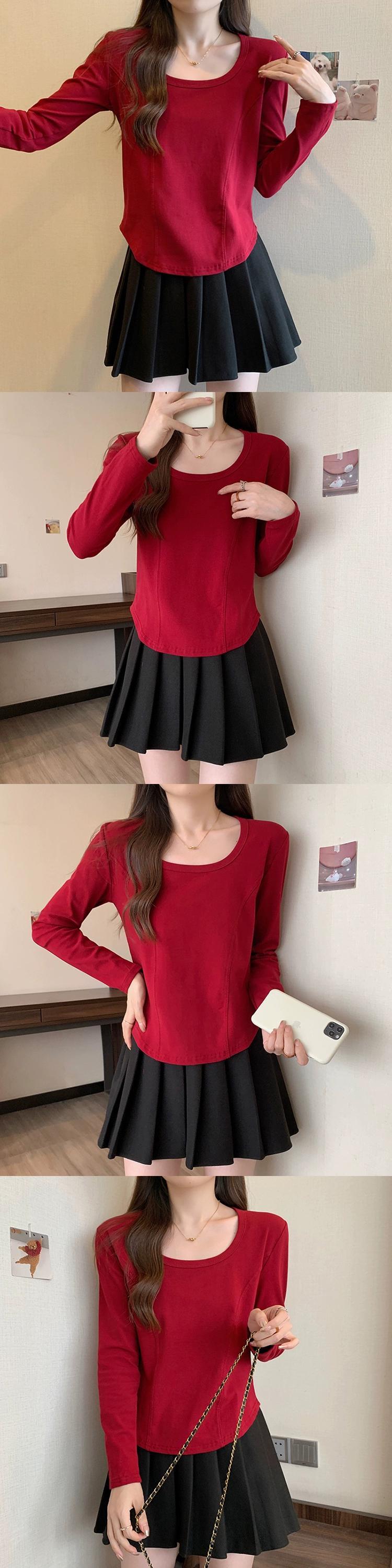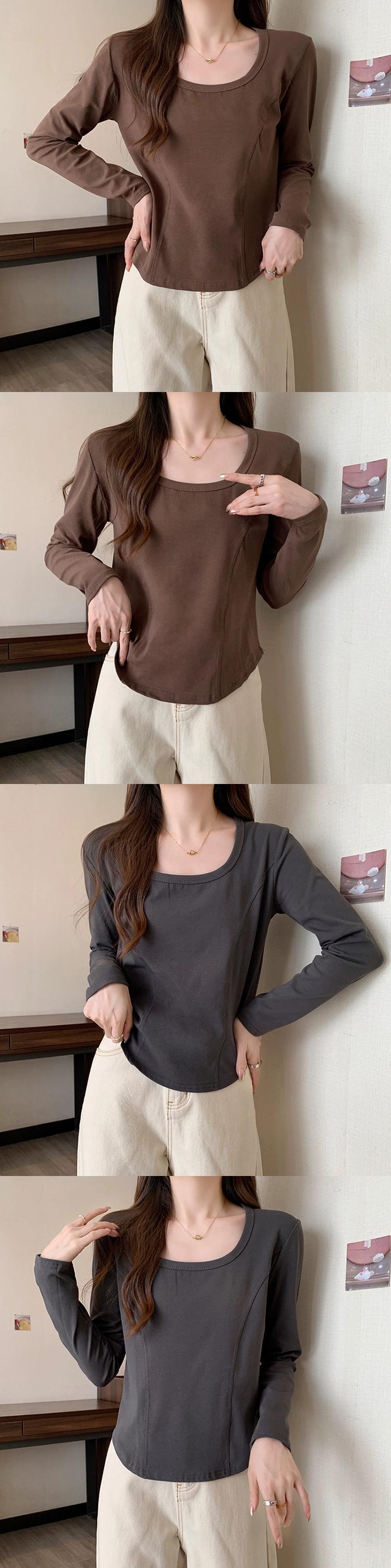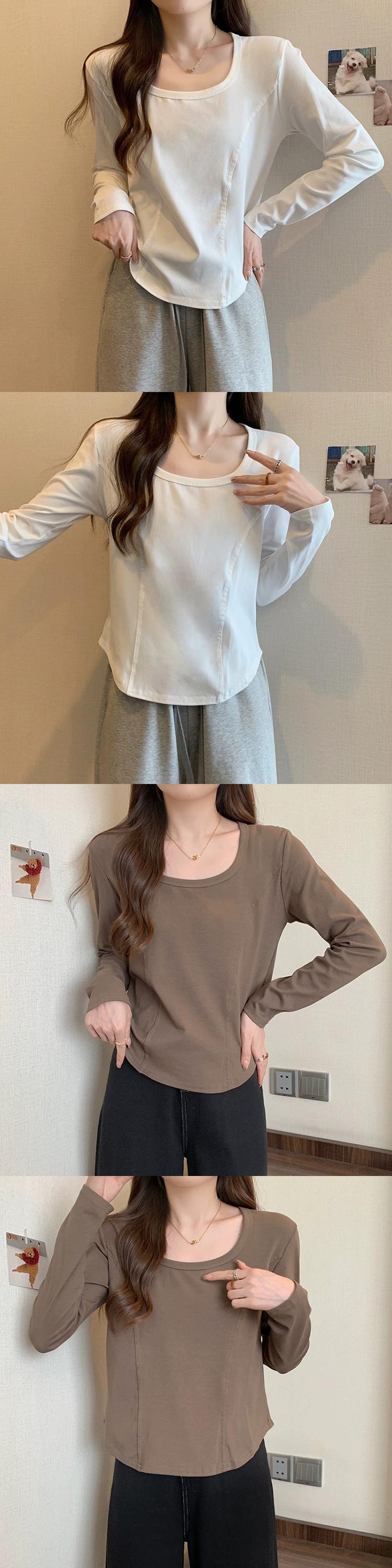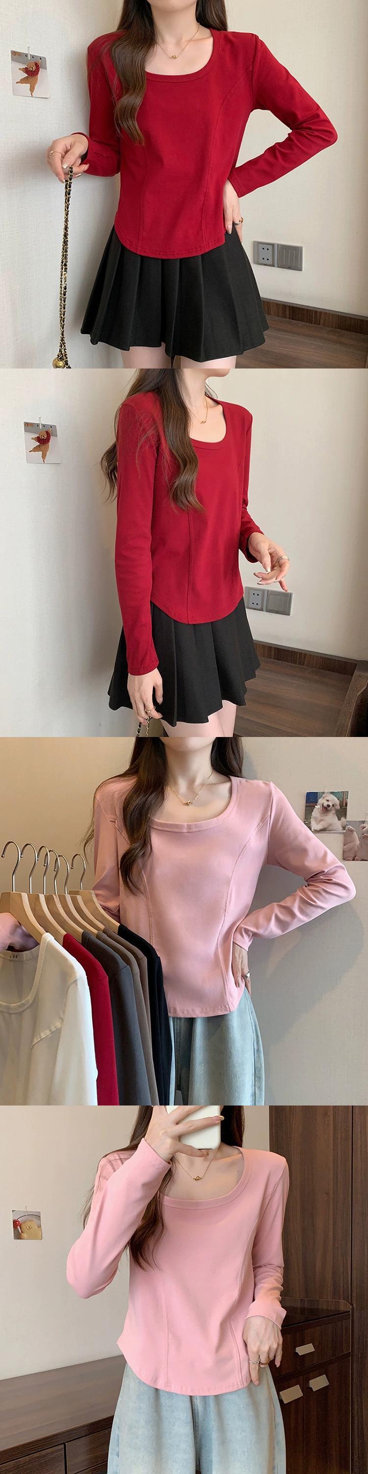 不規則なボトリングシャツ女性の 2023 春と秋の新しいルーズ、ファッショナブルでスリムなショートスクエアネック長袖 T シャツピンク ロング スプリング 春物 オータム 秋物 Tシャツ スクウェア 7460081374775051 | framboise21