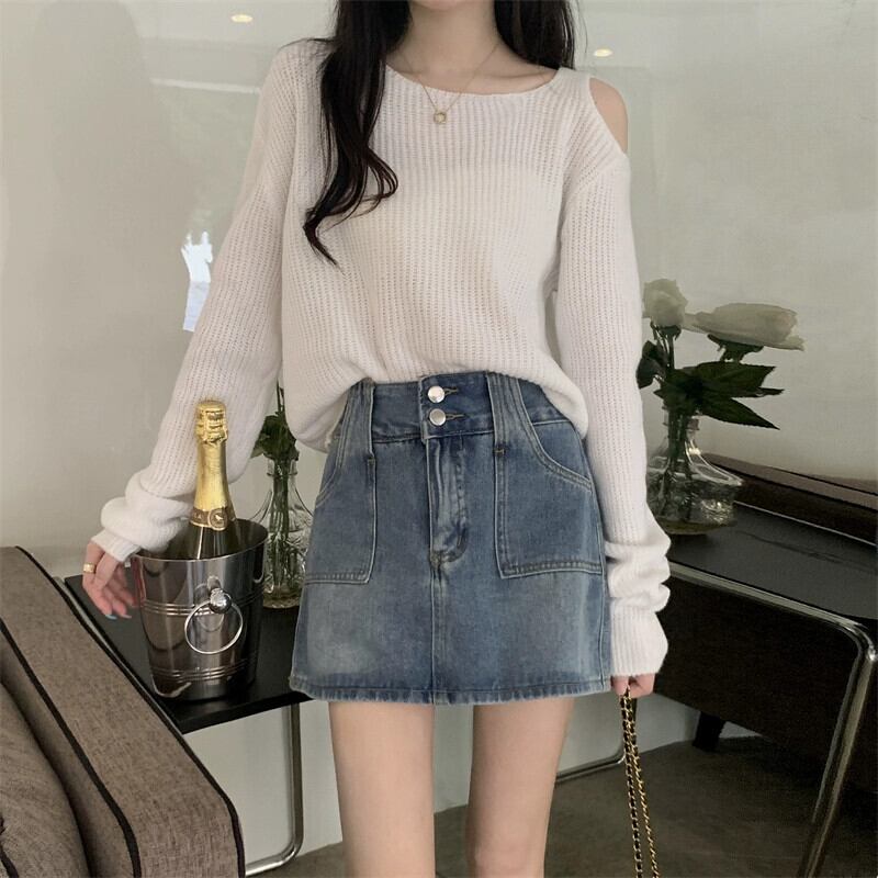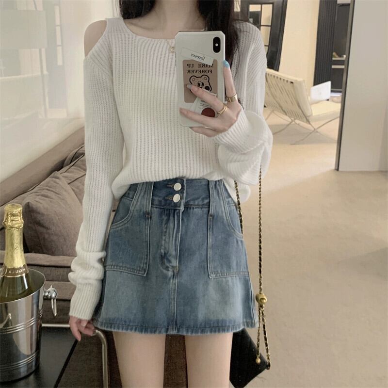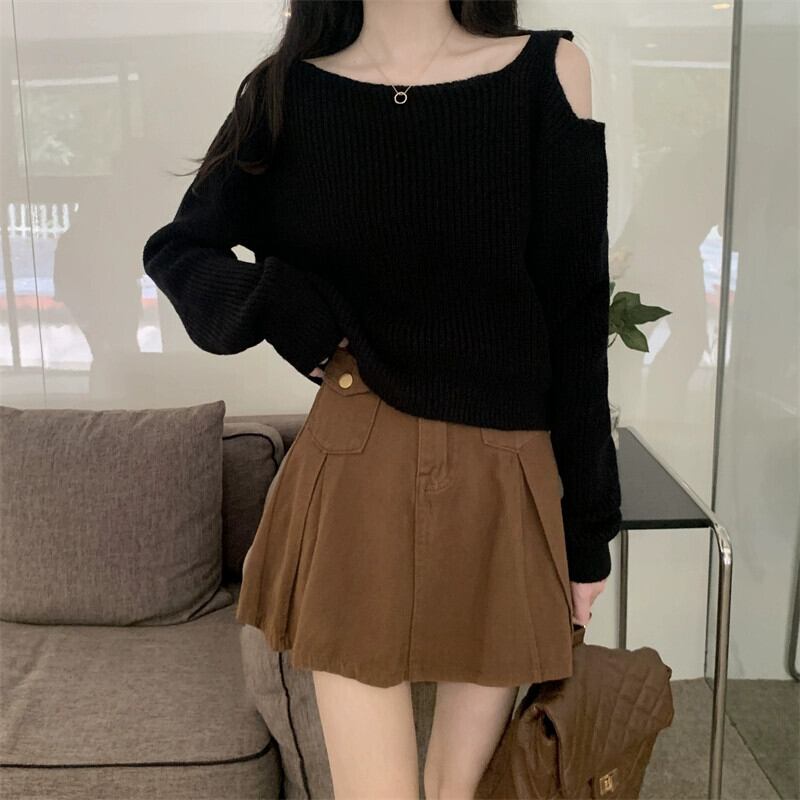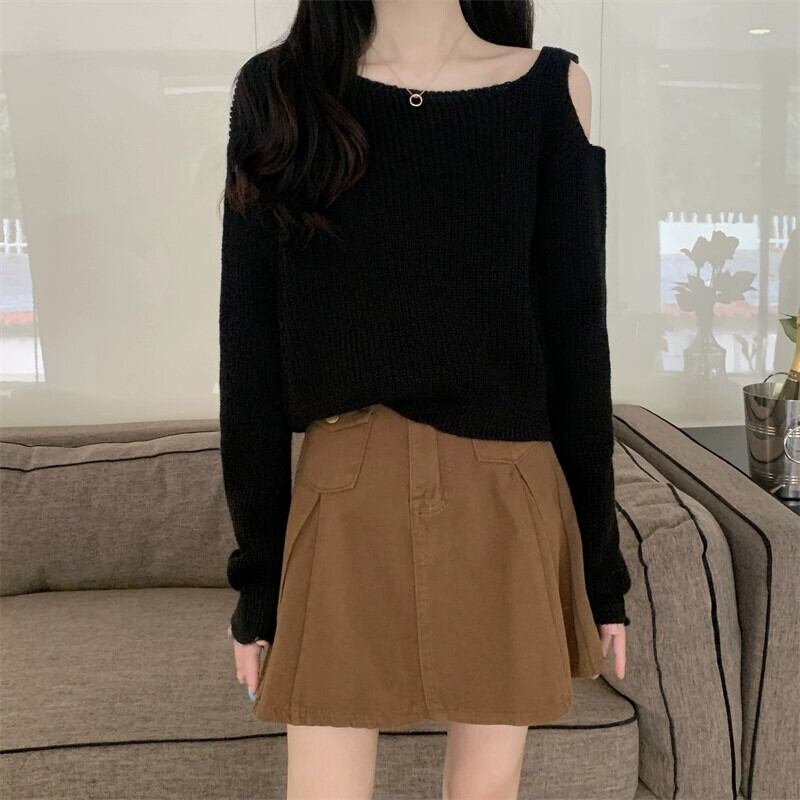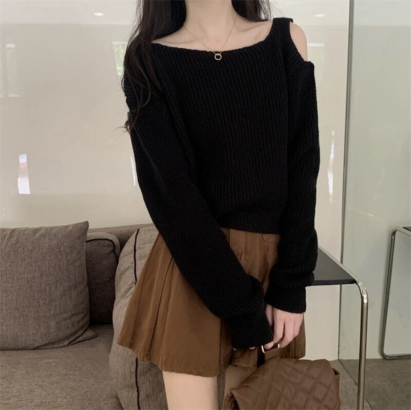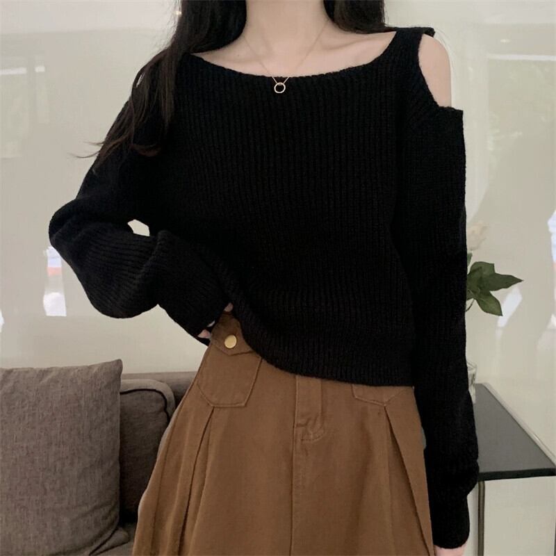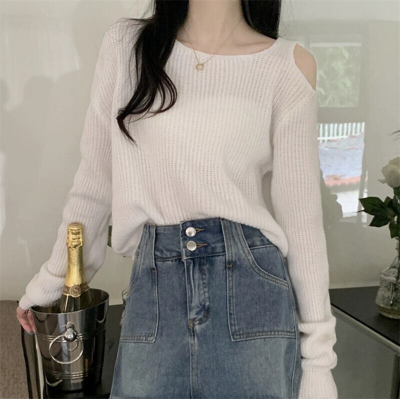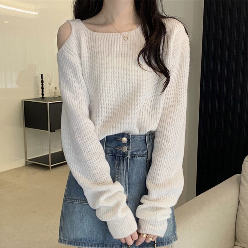 中空オフショルダー長袖ニットトップ女性、秋と冬のファッショナブルなアウターウェア、ルーズスリミングショートボトムセーターホワイト ロング オータム 秋物 ウィンター 冬物 7460076008923622 | framboise21